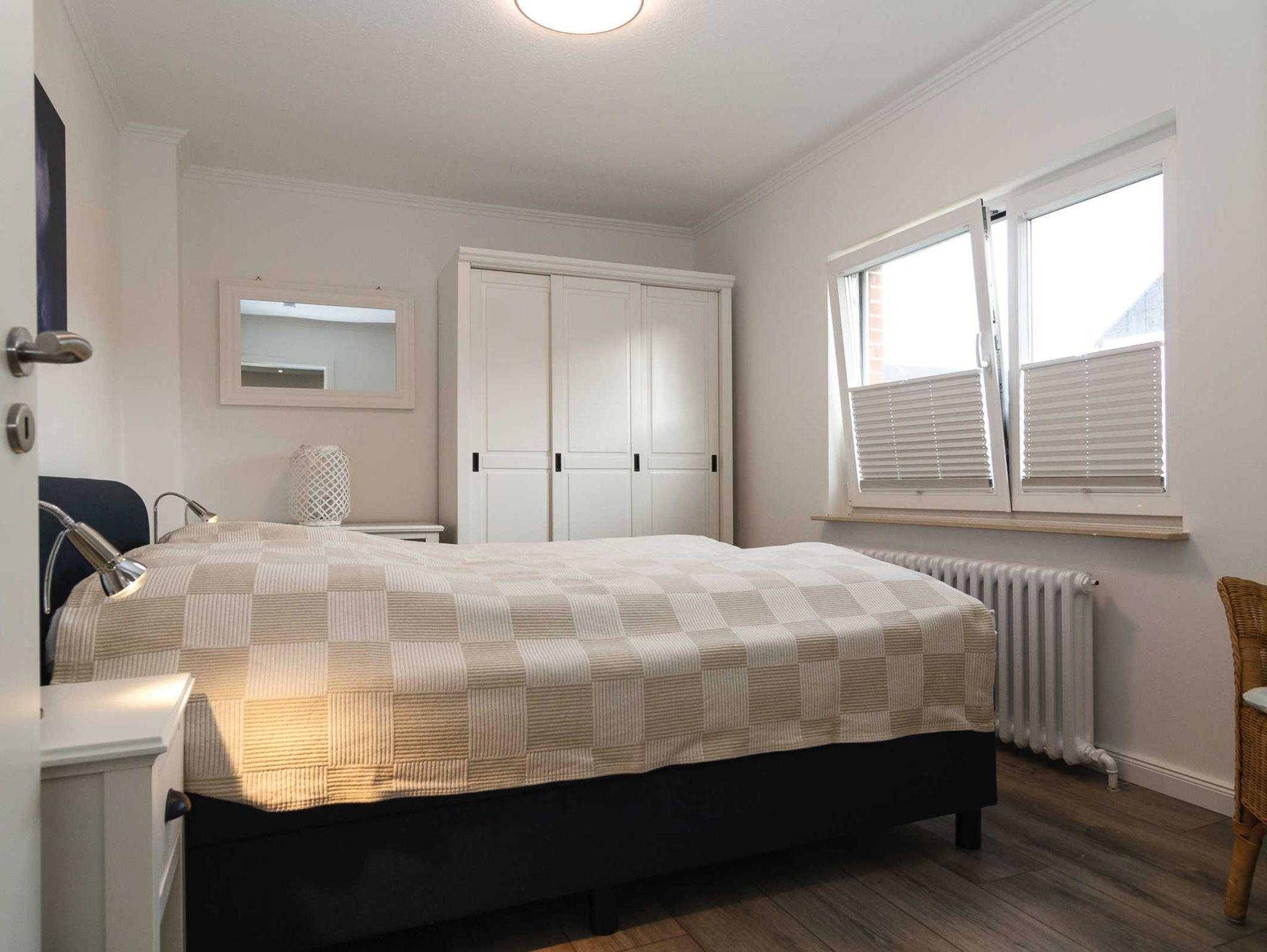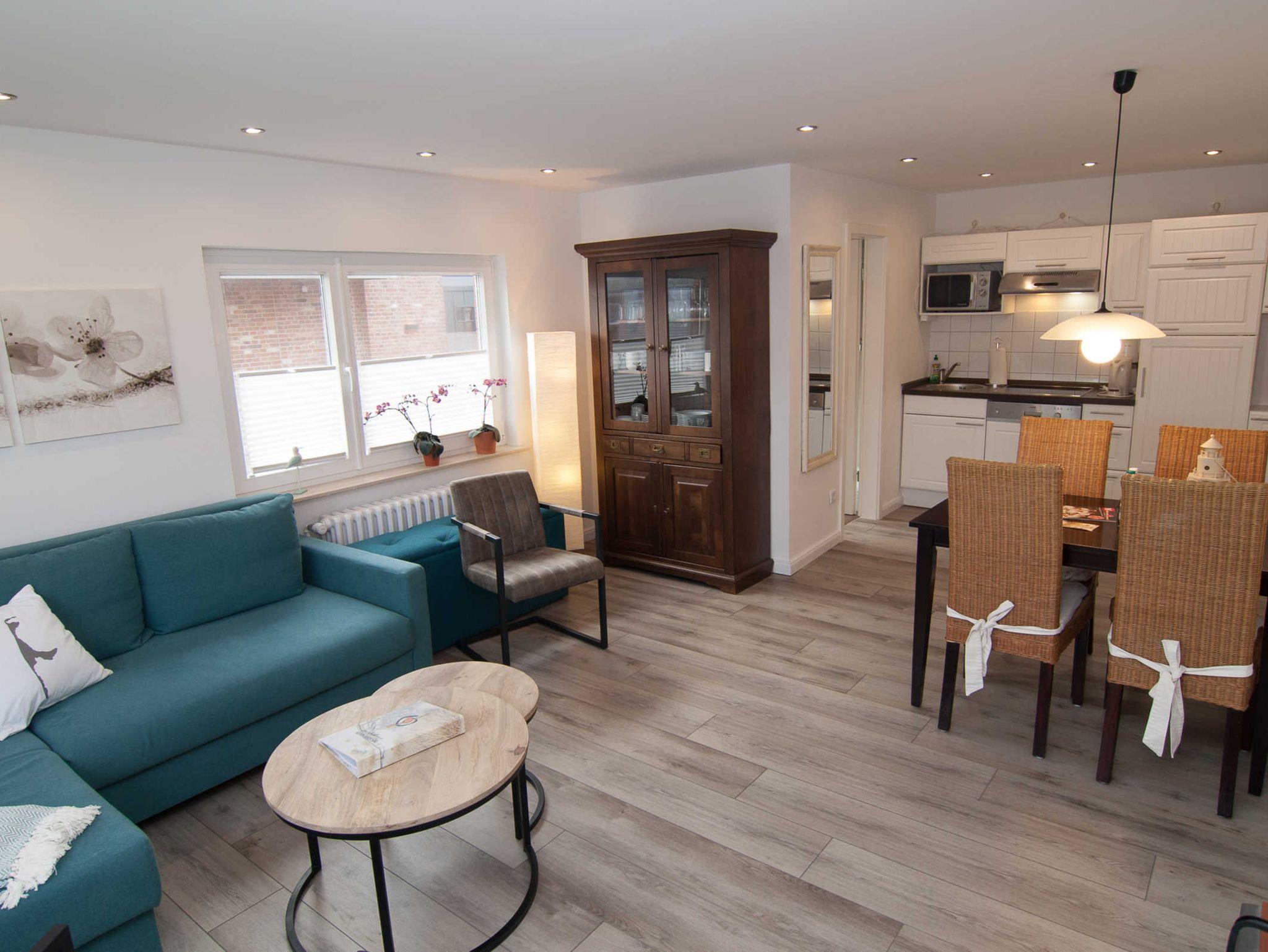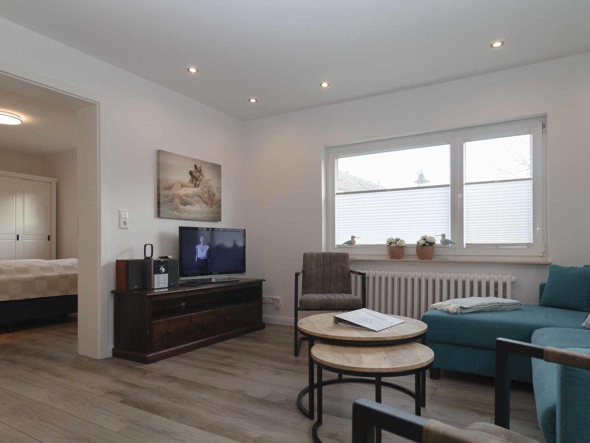 Gepflegtes 2 Zimmer Appartement mit ca. 45 m² im EG; 1 Wohn-/Schlafraum mit Doppelschlafcouch, Tisch, Korbsessel, Sat-TV, kl. Kompaktanlage, Essplatz für 4 Personen, offene Küchenzeile mit 4 Plattenherd, Backofen, kleines Gefrierfach; Schlafraum mit Doppelbett; Duschbad/WC. Der Wohnraum ist mit Stabparkett und der Schlafraum mit Laminat ausgelegt.