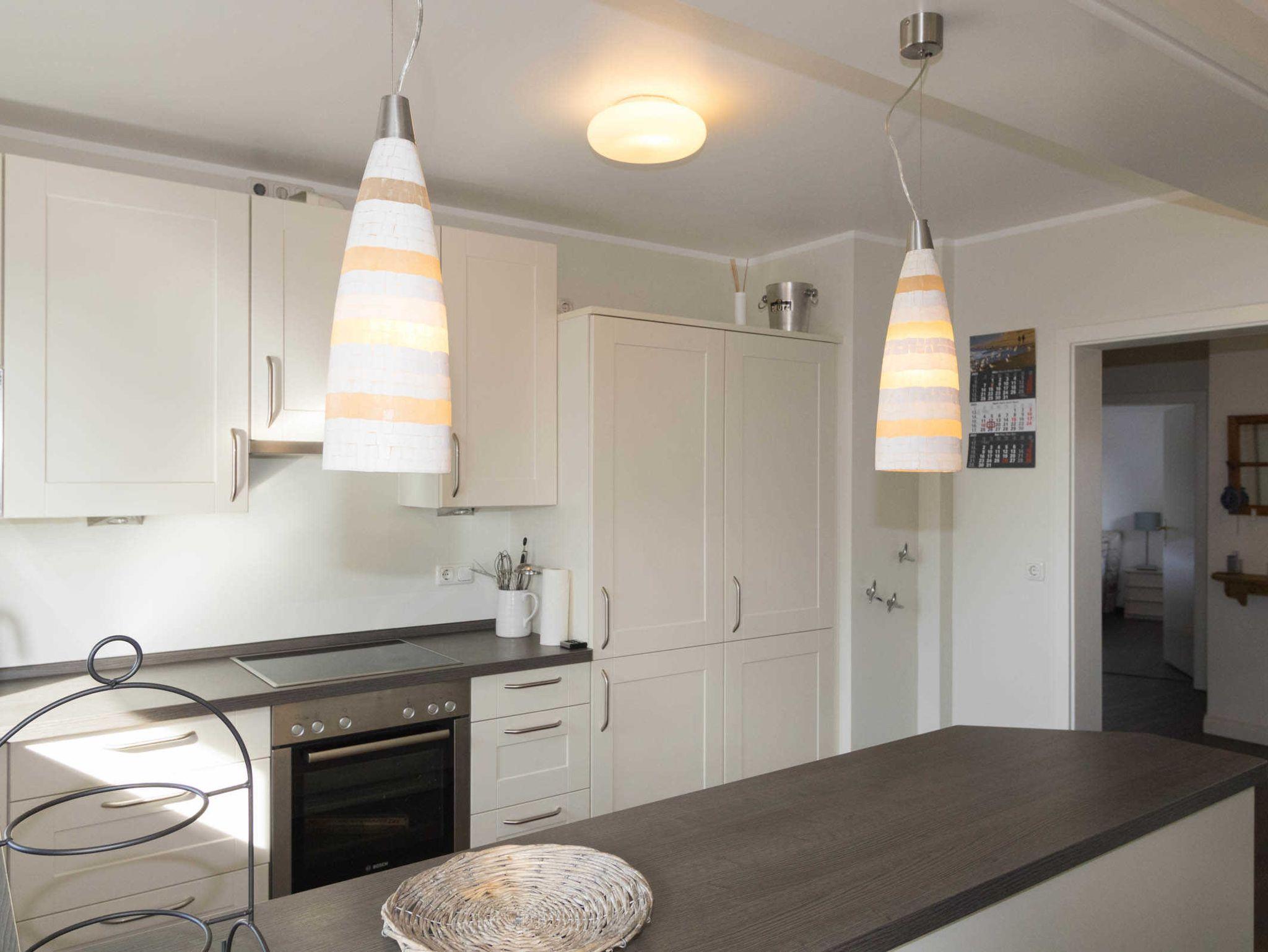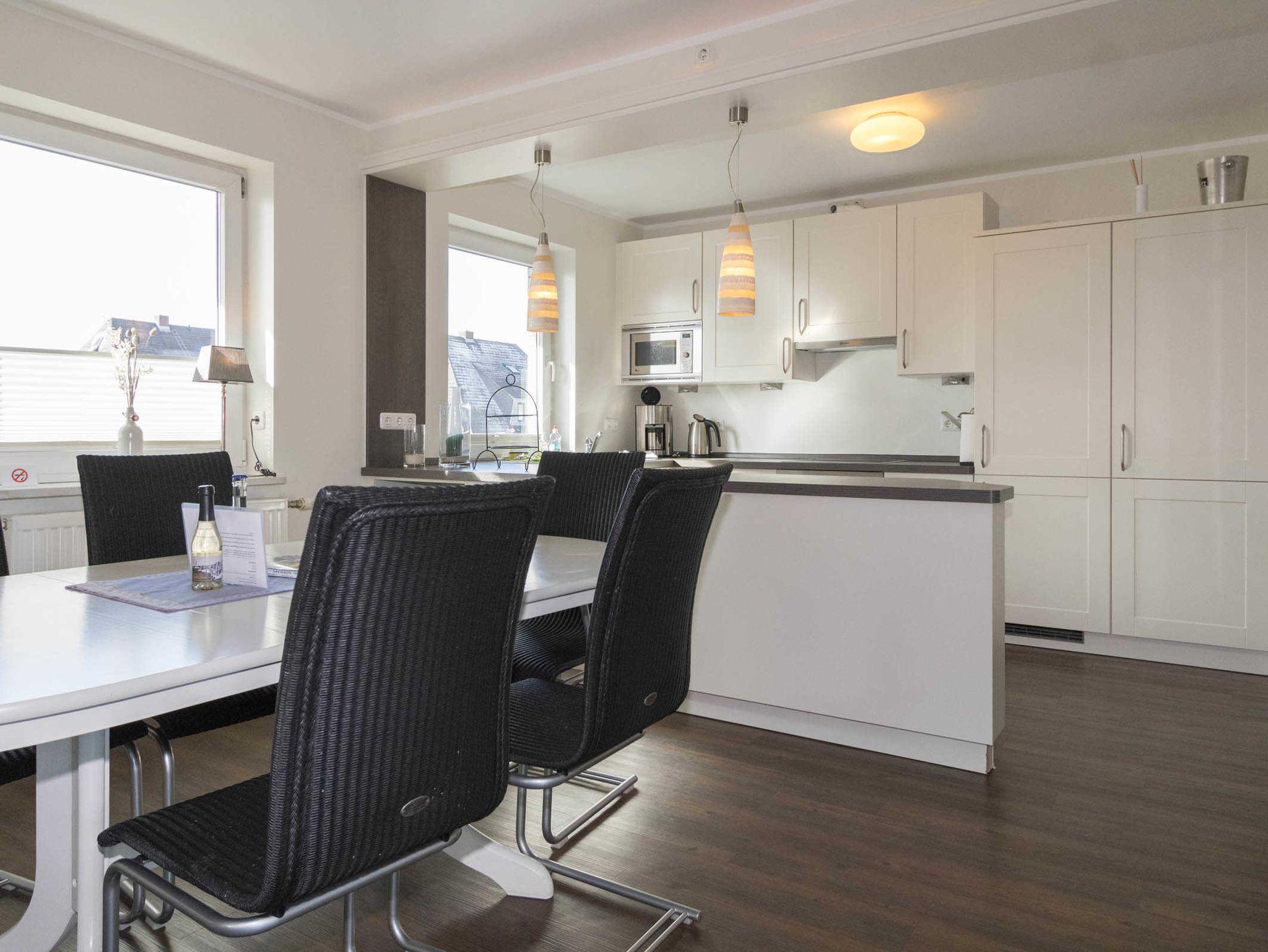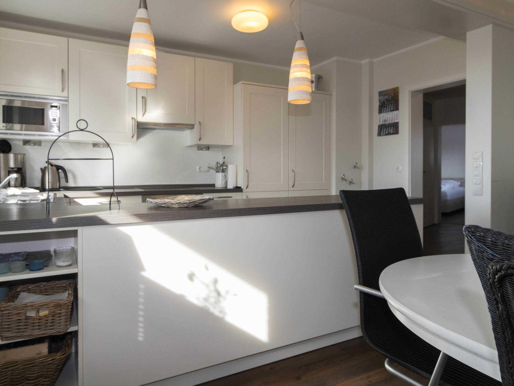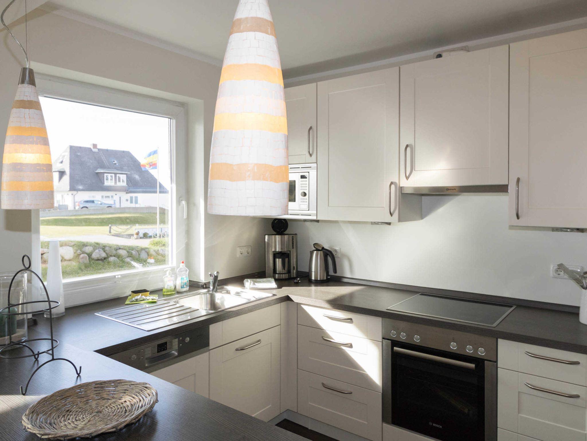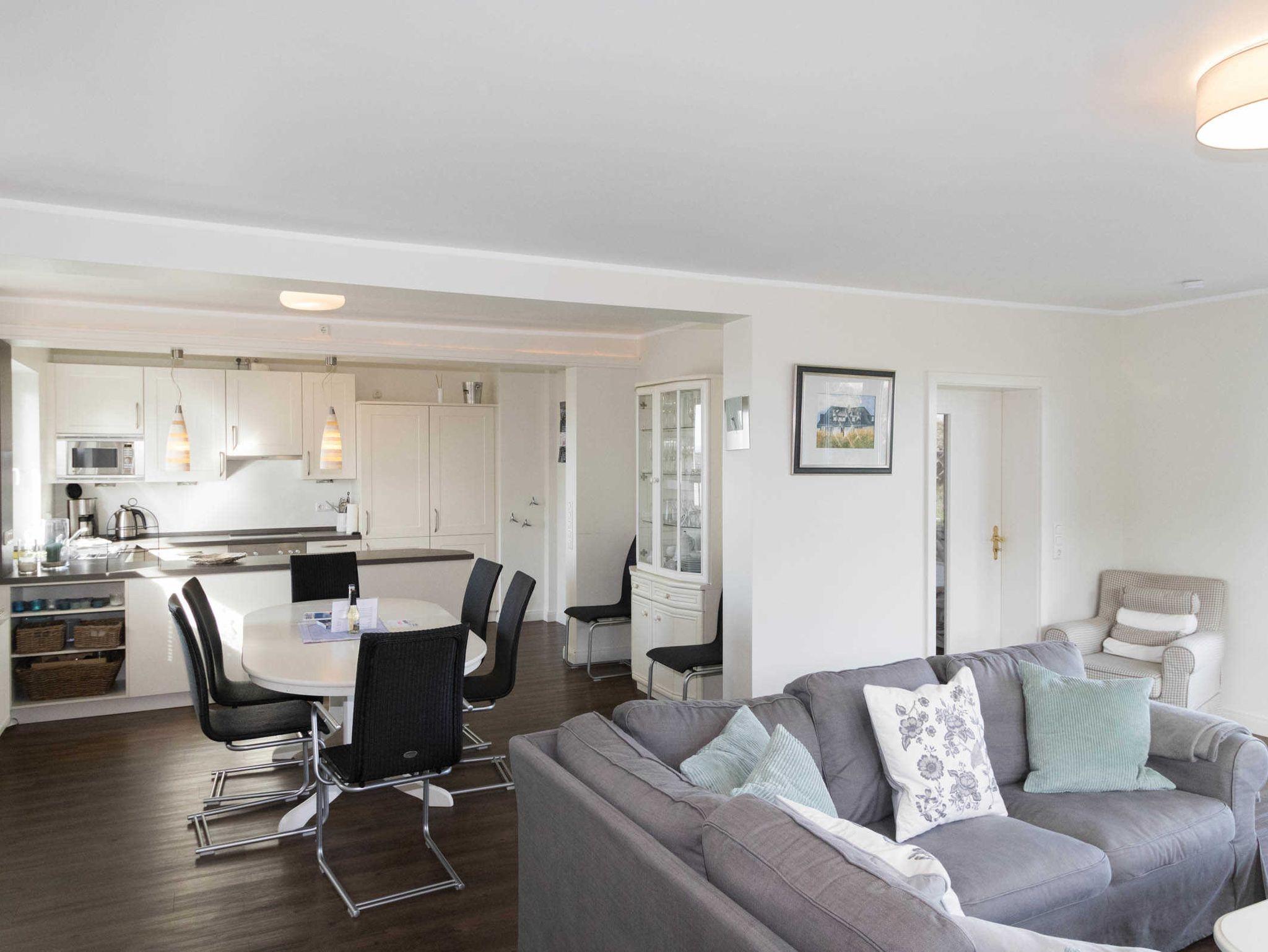 Großzügig und sehr geschmackvoll gestaltet ist der Wohn-/Essbereich mit offener Küche, die keine Wünsche offen lässt. Die Küche verfügt über Geschirrspüler, Backofen, Herd mit Ceranfeld, eine Mikrowelle und einen Kühlschrank mit Gefrierschrank.