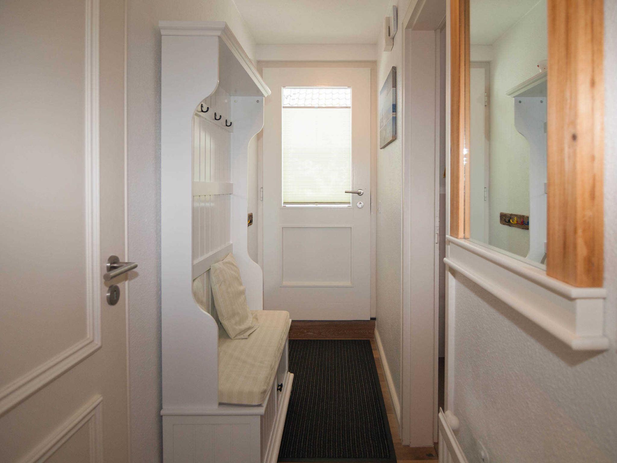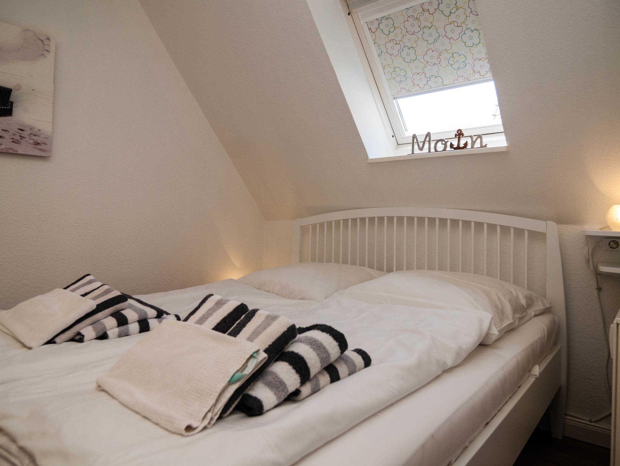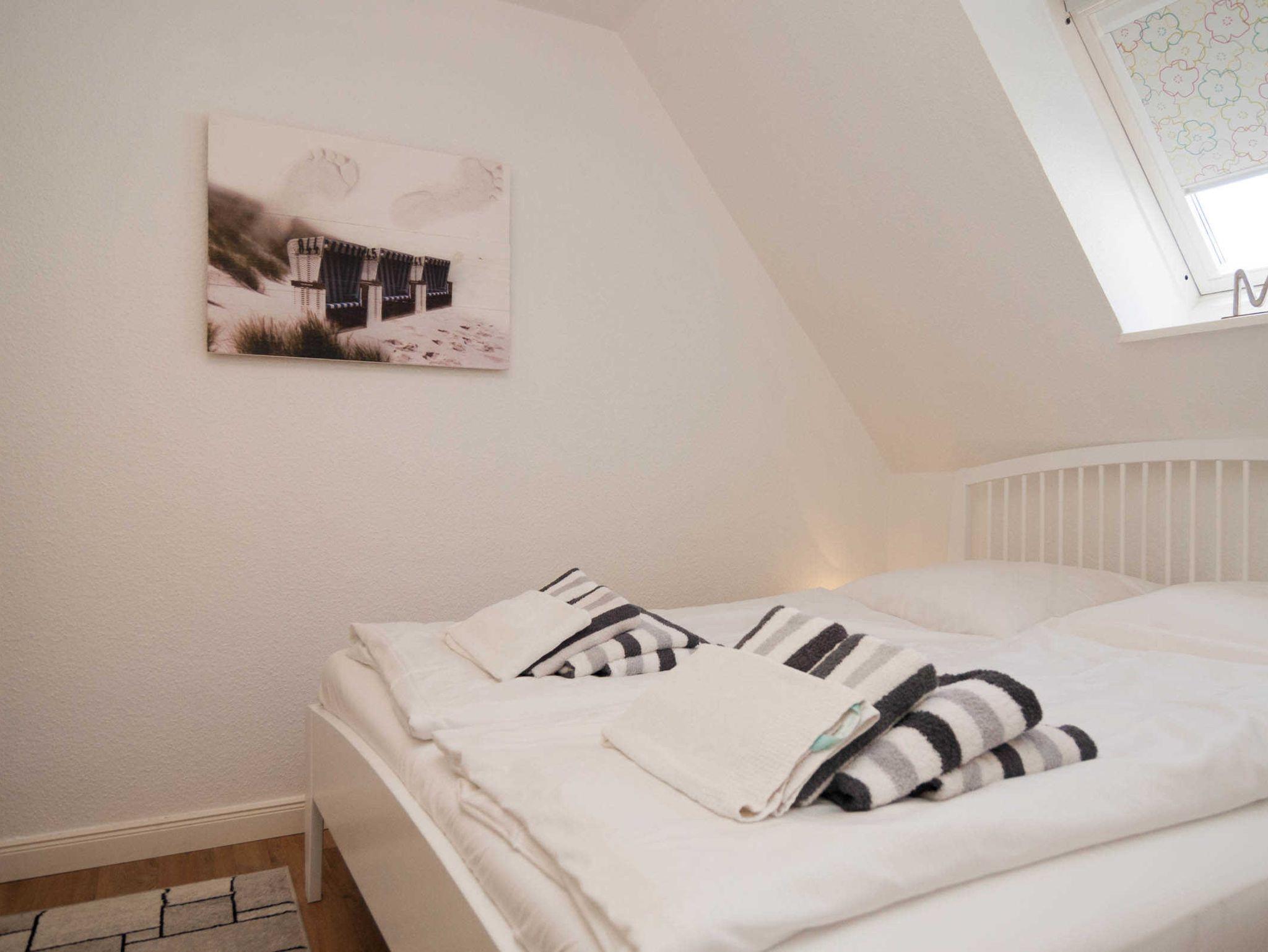 In dieser Ferien-Maisonette im Herzen von Hörnum ist an alles gedacht. Vom Flurbereich gelangen Sie in das Schlafzimmer mit Doppelbett kuschelig unter der Dachschräge.