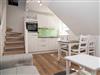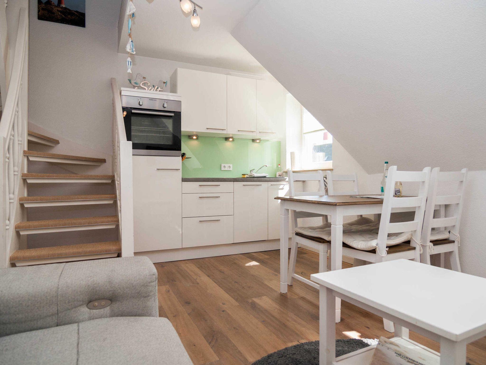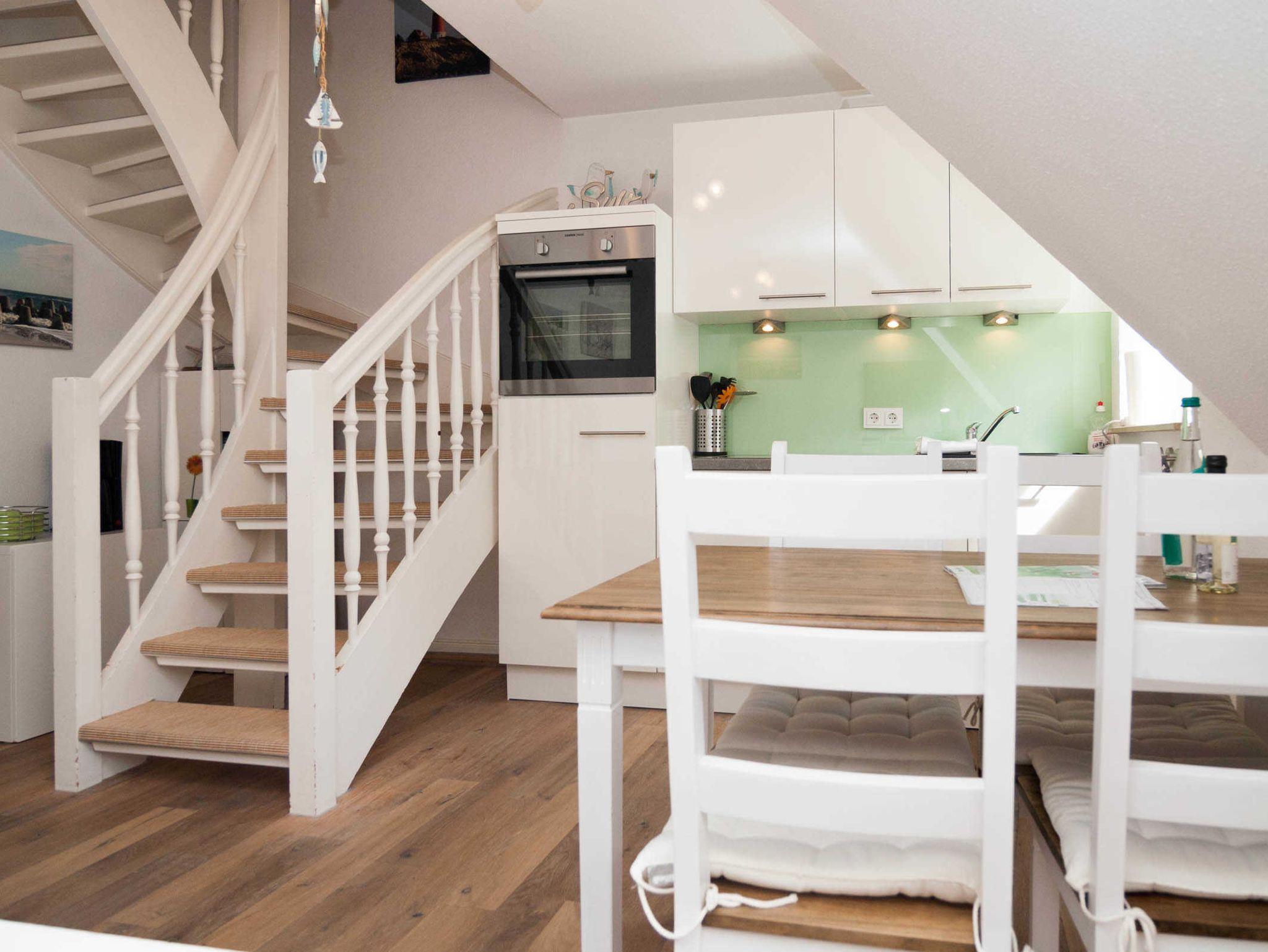 Gegenüber befindet das moderne Duschbad und geradeaus der komfortable Wohnraum mit Esstisch und Küchenzeile. Von dort geht es über die offene Treppe in das 2. Schlafzimmer unter dem Dach, mit Doppelbett, das Erwachsene wie auch Kinder lieben werden.