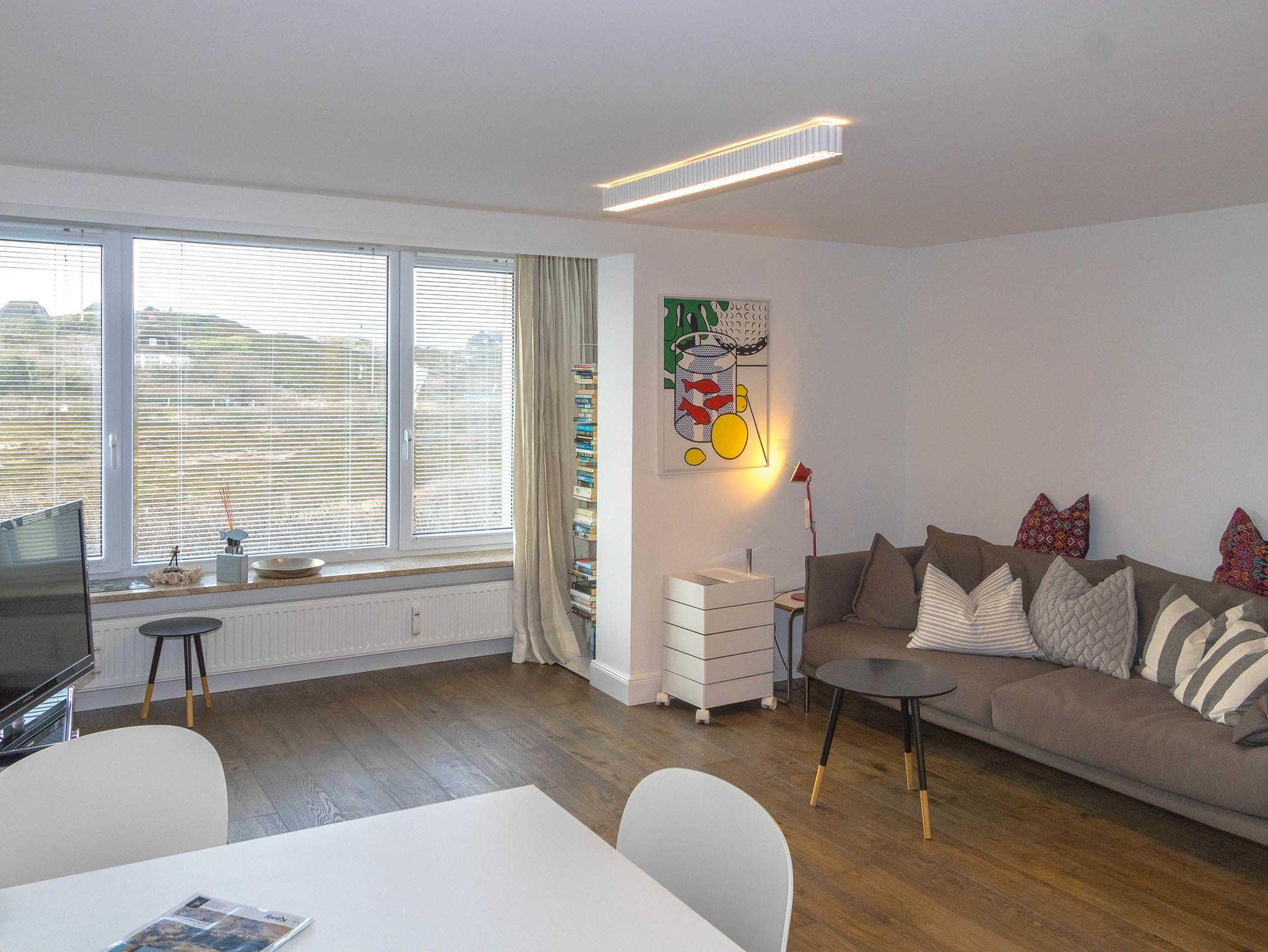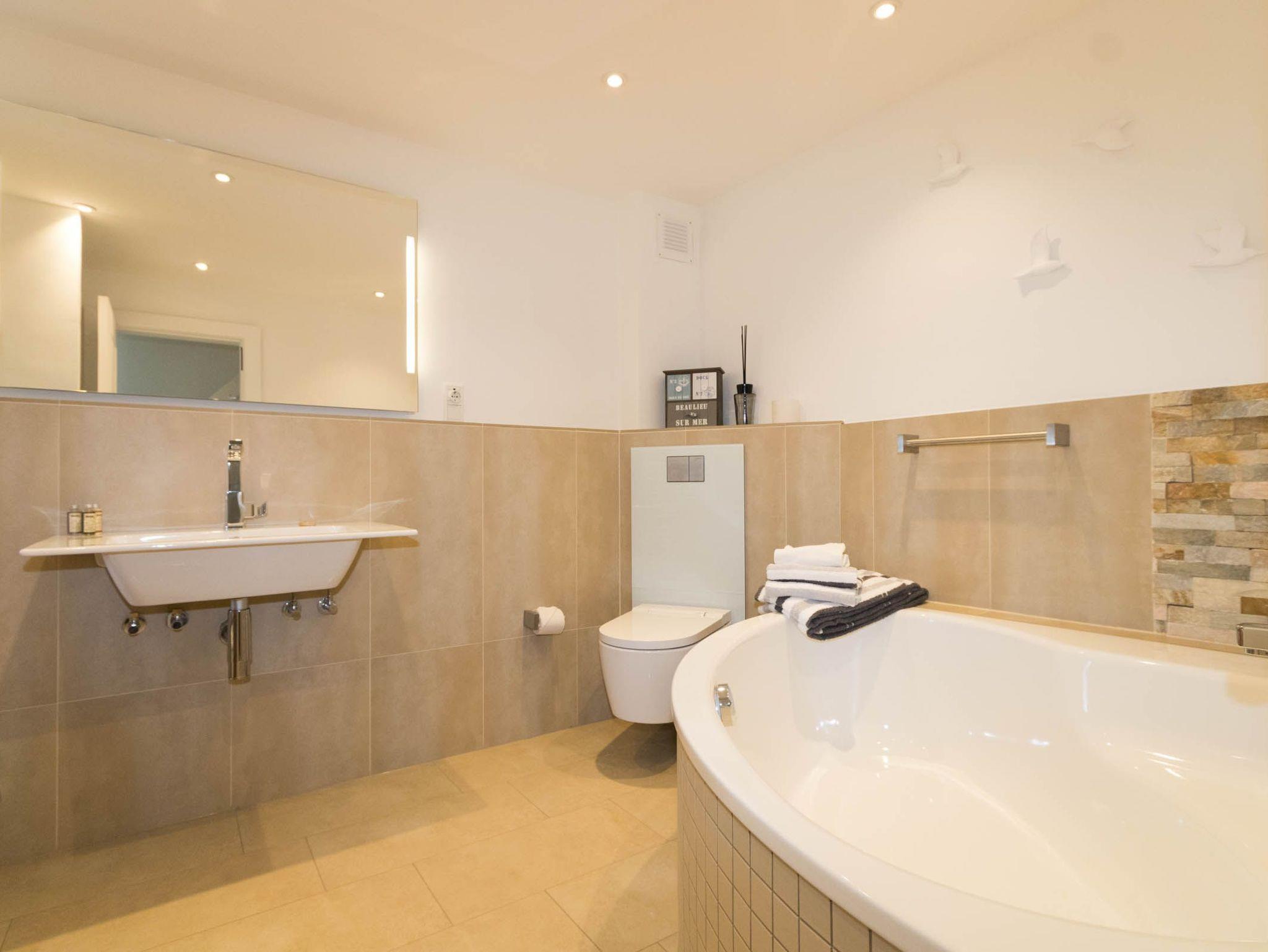 Die Ferienwohnung bietet auf ca. 90qm für bis zu 4 Personen Platz. Im Erdgeschoss befindet sich das Wohnzimmer, Esszimmer und die Küche. Weiterhin ist im Erdgeschoss ein Gäste WC sowie eine Wellnessdusche vorzufinden.