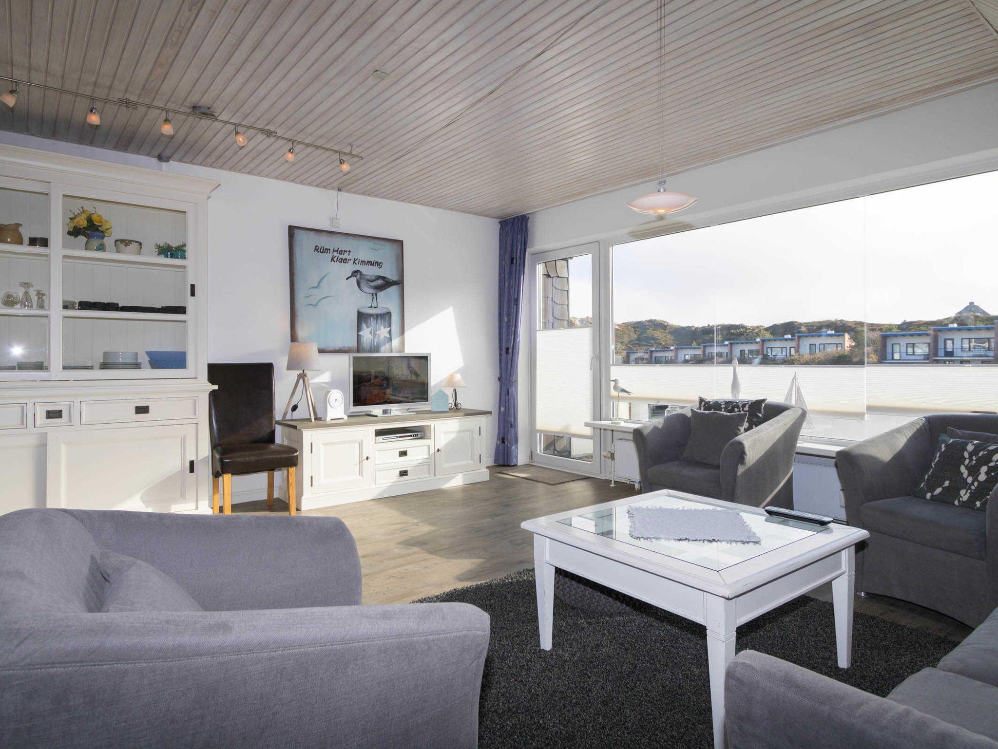 In dieser Wohnung ist Platz für eine Familie mit 5 Personen. Sie lieben Ruhe und Entspannung, dann sind Sie hier richtig aufgehoben. Der Blick in die Dünenlandschaft trägt dazu bei.