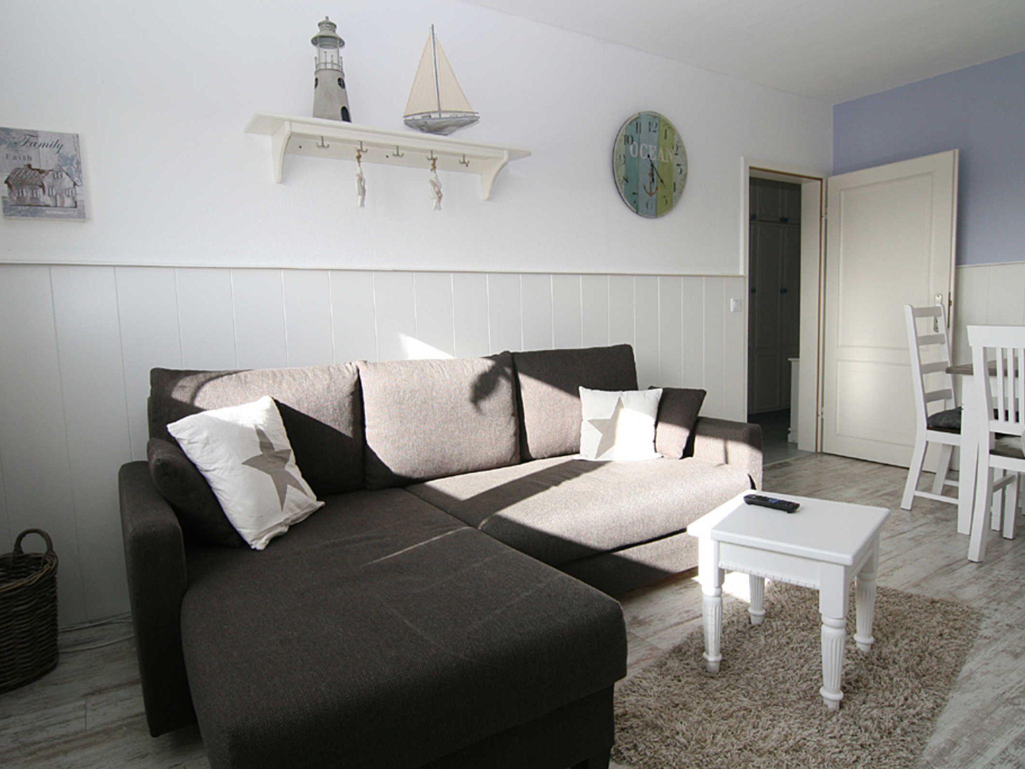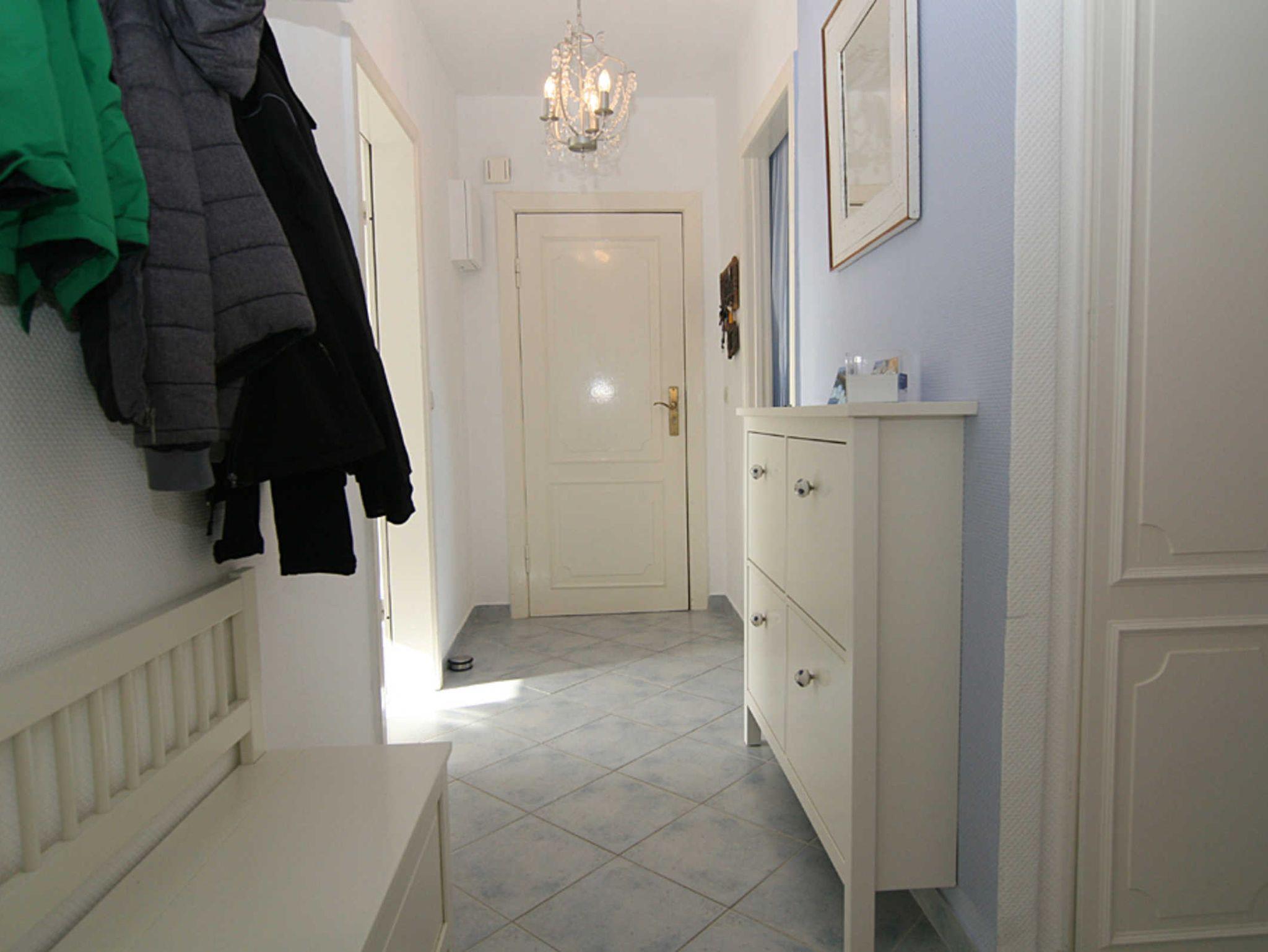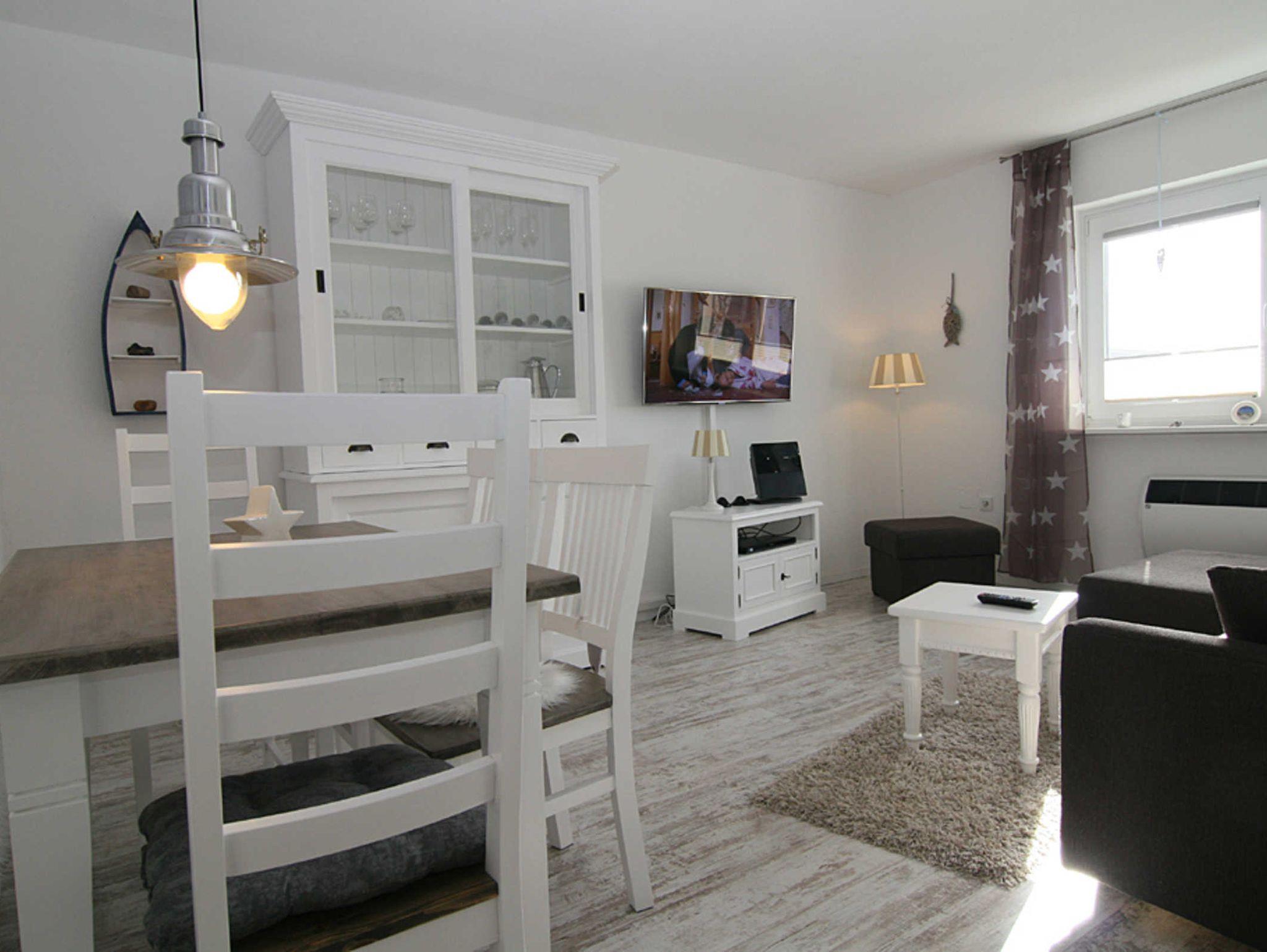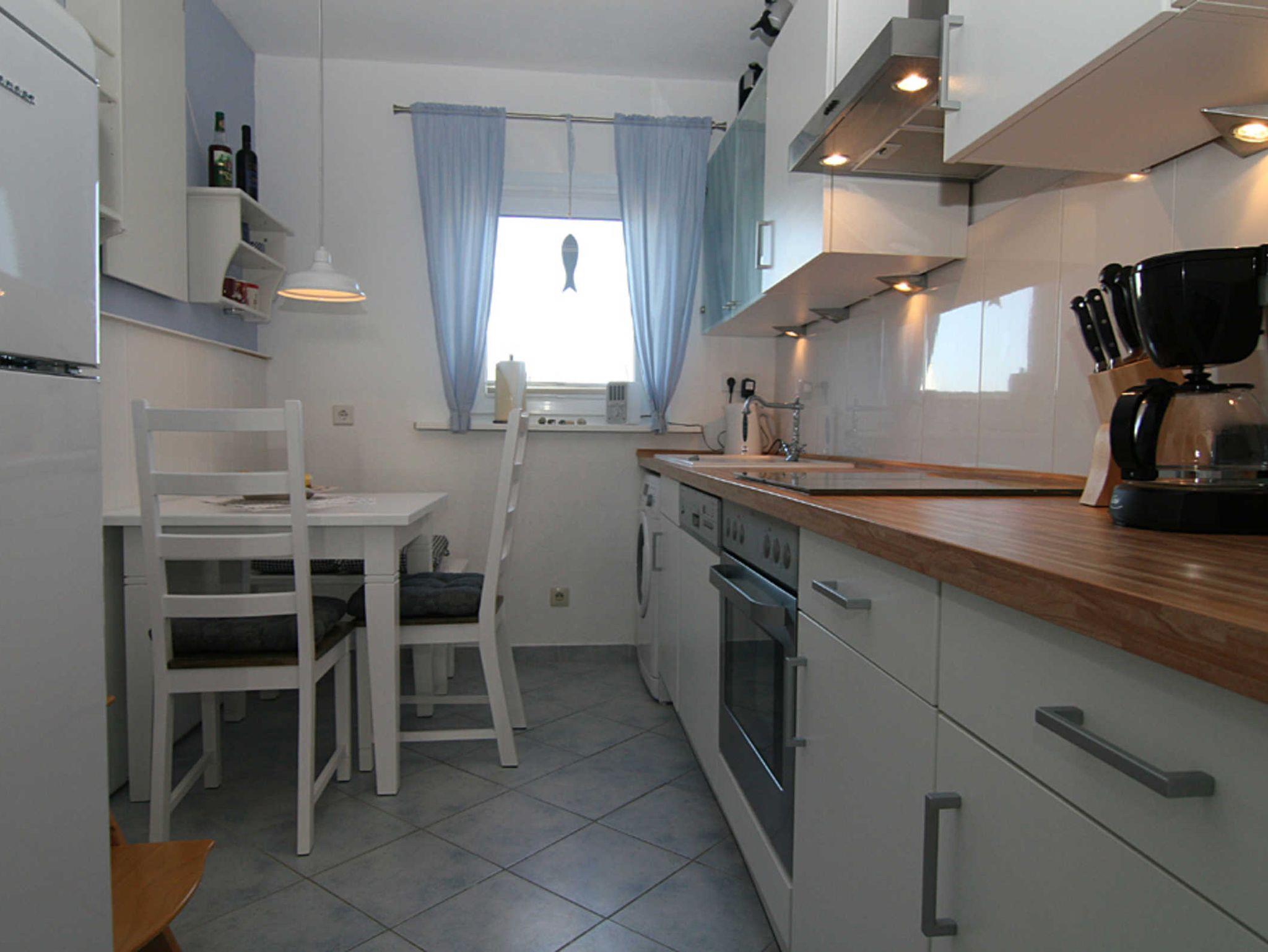 Das großzügige Wohnzimmer bietet eine gemütliche Sitzecke mit Blick auf dem Flatscreen-Fernseher sowie als zusätzliche Ausstattung einen DVD-Player. Hier befindet sich auch der Esstisch, der Platz für 4 Personen bietet. Die Wohnung verfügt über zwei Schlafzimmer, davon haben beide Schlafzimmer ein Doppelbett und Fernseher. Von dem zweiten Schlafzimmer gibt es einen Zugang zum Balkon Richtung Westen, der mit Balkonmöbeln ausgestattet ist. Die Küche ist mit einem Essplatz für 2 Personen ausgestattet und verfügt über Mikrowelle, Toaster, Kaffeemaschine, Waschmaschine, Geschirrspüler, 3-Sterne-Gefrierfach im Kühlschrank. Das moderne Duschbad rundet das Bild dieser hochwertigen Wohnung ab.