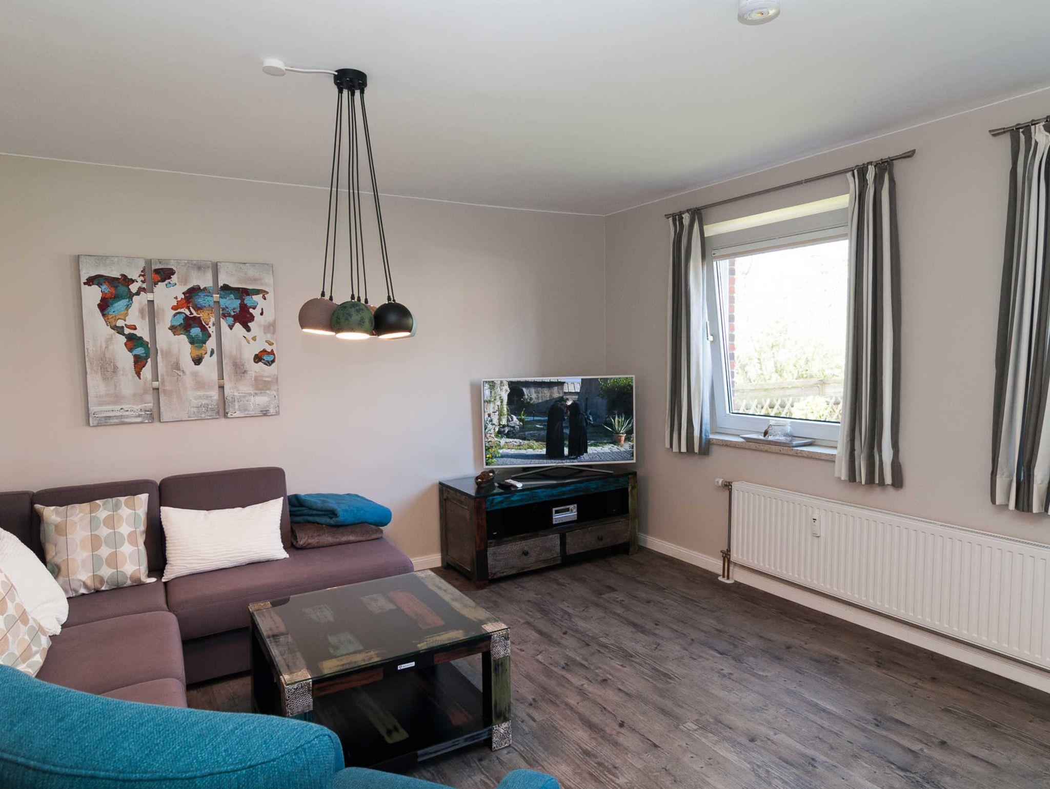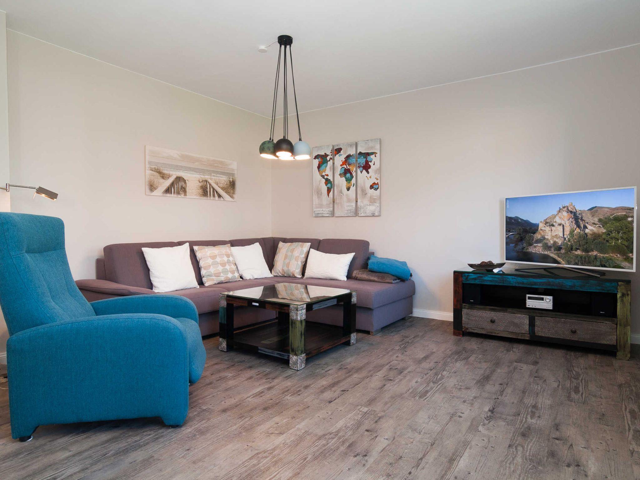 Mit einer großzügigen Fläche von 58 m² erwartet Sie eine lichtdurchflutete und freundlich gestaltete Wohnung, die mit vielen Annehmlichkeiten ausgestattet ist, um Ihnen einen komfortablen Aufenthalt zu gewährleisten. Das stilvolle Wohnzimmer lädt zum Entspannen ein und bietet eine Sofaecke sowie einen Esstisch, an dem Sie gemütliche Abende mit Ihren Liebsten verbringen können. Zur technischen Ausstattung gehört ein moderner Fernseher mit Satellitenanschluss sowie eine HiFi-Anlage, damit Sie Ihre Lieblingsmusik oder Filme genießen können.