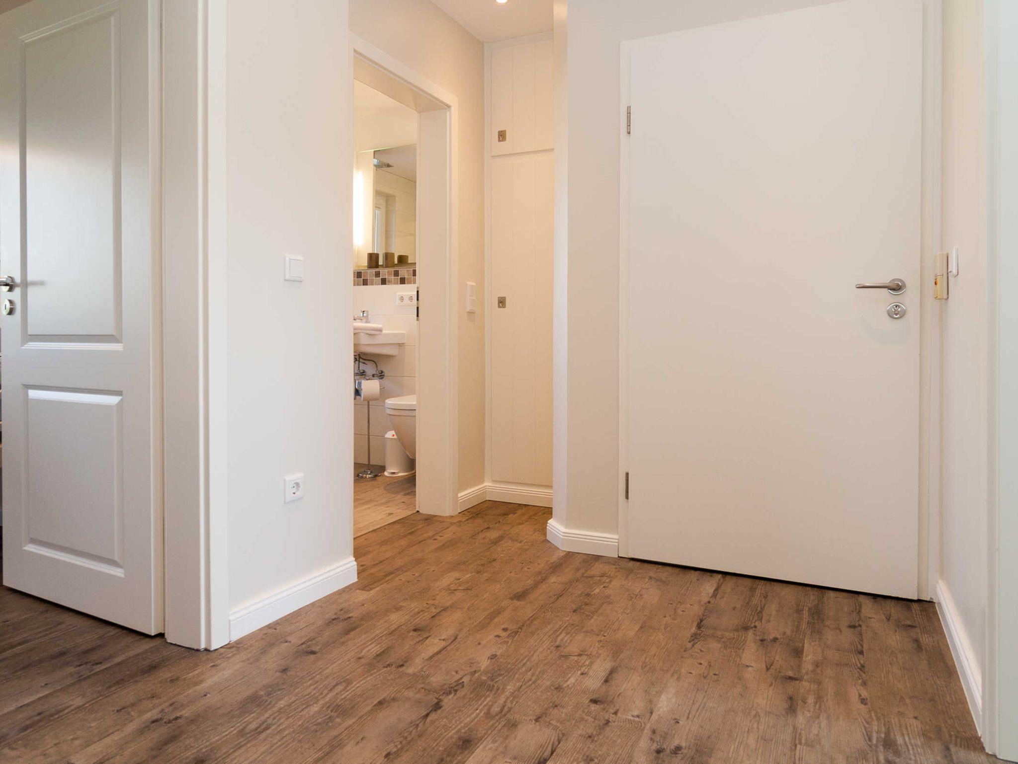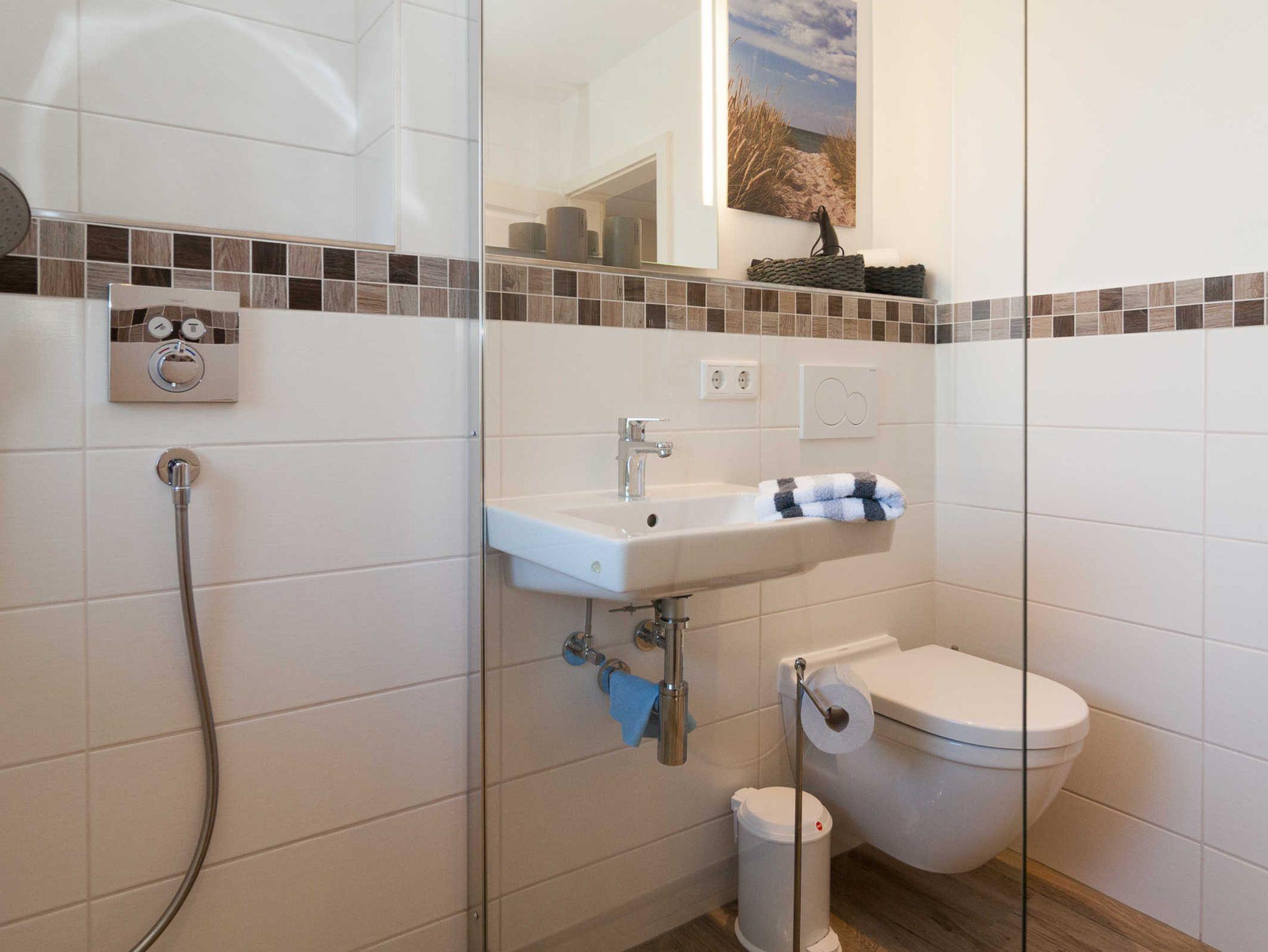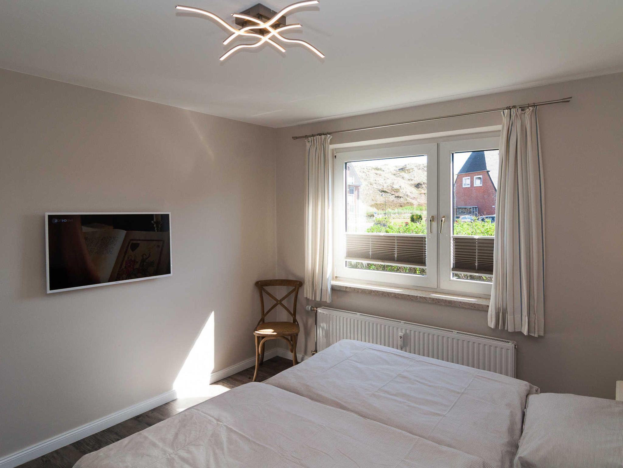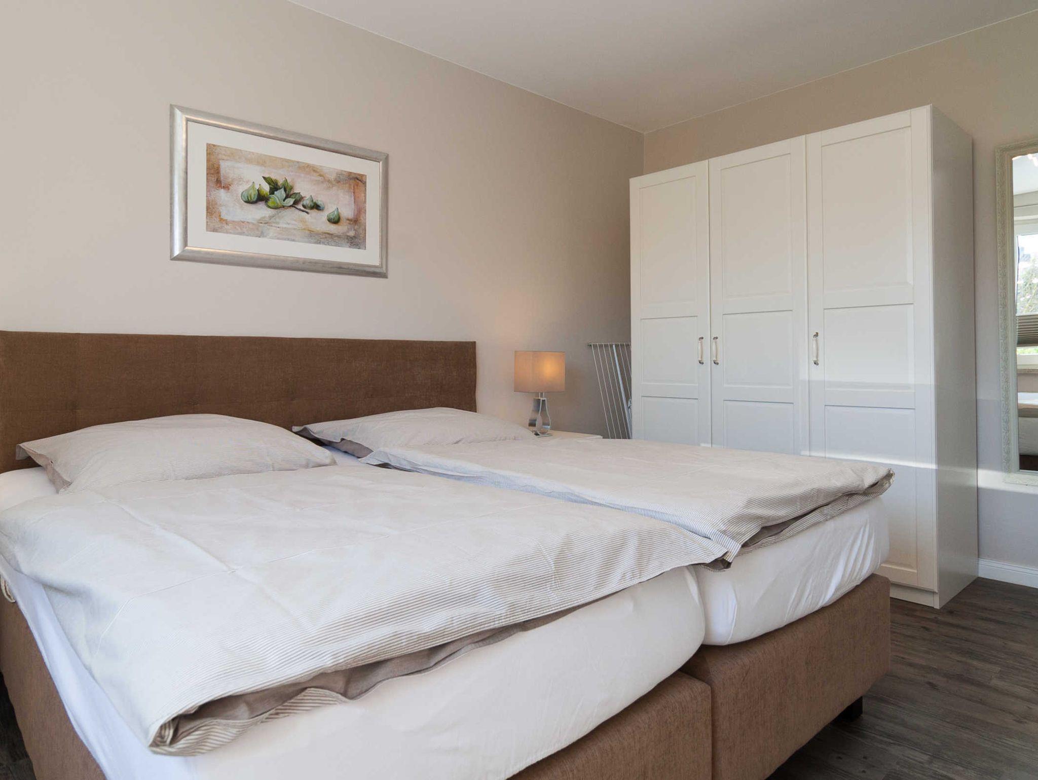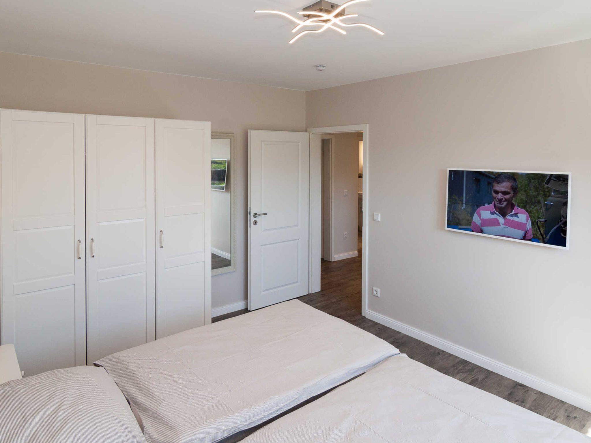 Die Ferienwohnung verfügt über ein komfortables Schlafzimmer mit einem Boxspringbett sowie einem Fernseher. Ein modernes Badezimmer mit bodengleicher Dusche, WC und Waschbecken sorgt zudem für zusätzlichen Komfort. Selbstverständlich sind auch praktische Dinge wie eine Waschmaschine, Trockner (im seitlichen Eingang) und Wäscheständer vorhanden, die für einen sorgenfreien Aufenthalt sorgen.