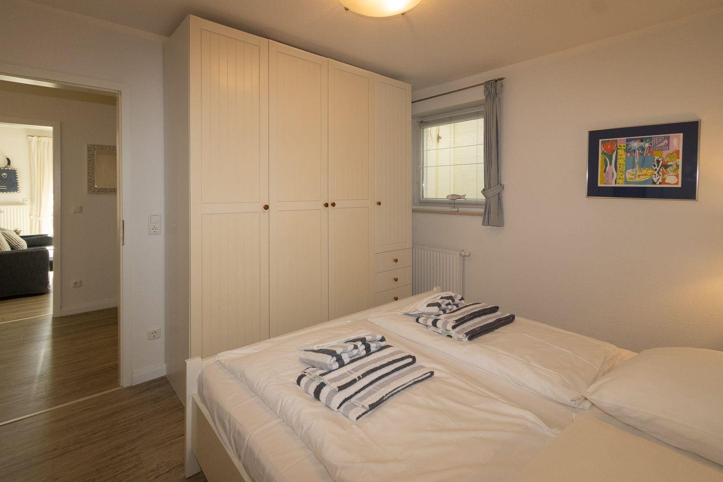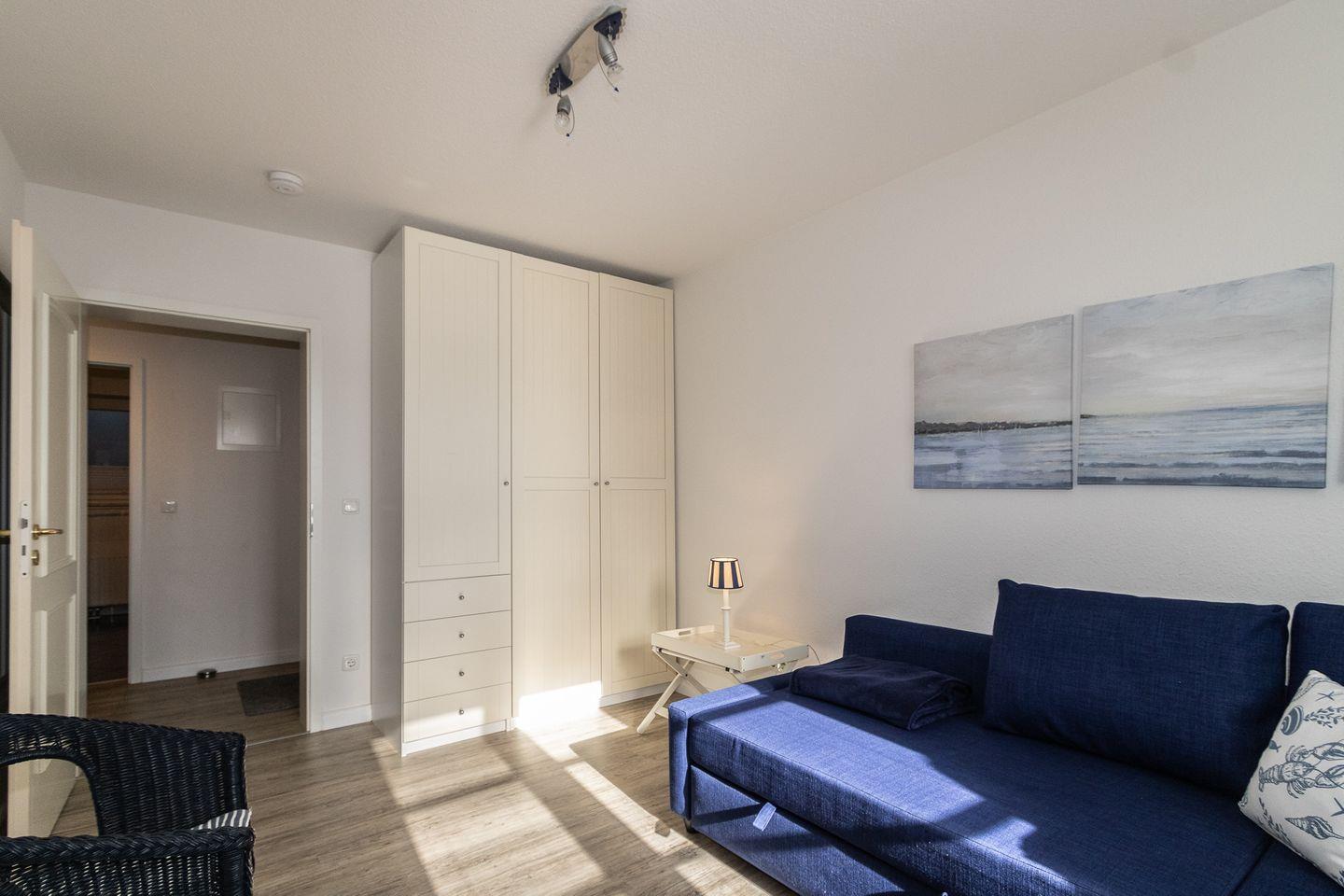 Die Wohnung liegt im Gartengeschoss und ist aufgeteilt in einen gemütlichen Wohn-/Essbereich mit komplett ausgestatteter Küchenzeile, einen Schlafraum mit Doppelbett und ein Duschbad. Im zweiten Schlafraum kann auch eine Schlafcouch für die 3. oder 4. Person ausgezogen werden. Sehr liebevoll und persönlich eingerichtete Ferienwohnung. Die großzügige, gepflegte Terrasse nach Süden ist mit einem Strandkorb und Gartenmöbeln ausgestattet. Umgeben von Dünengras und einem Friesenwall können Sie bei morgendlicher Sonne Ihr Frühstück geniessen. Urlaub, Ruhe und Erholung in absolut strandnaher Umgebung ist hier gegeben.