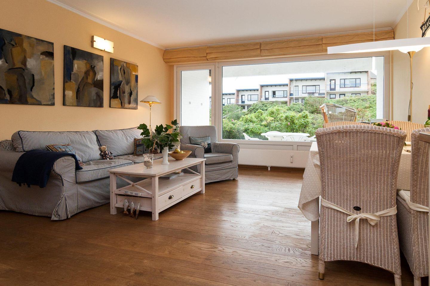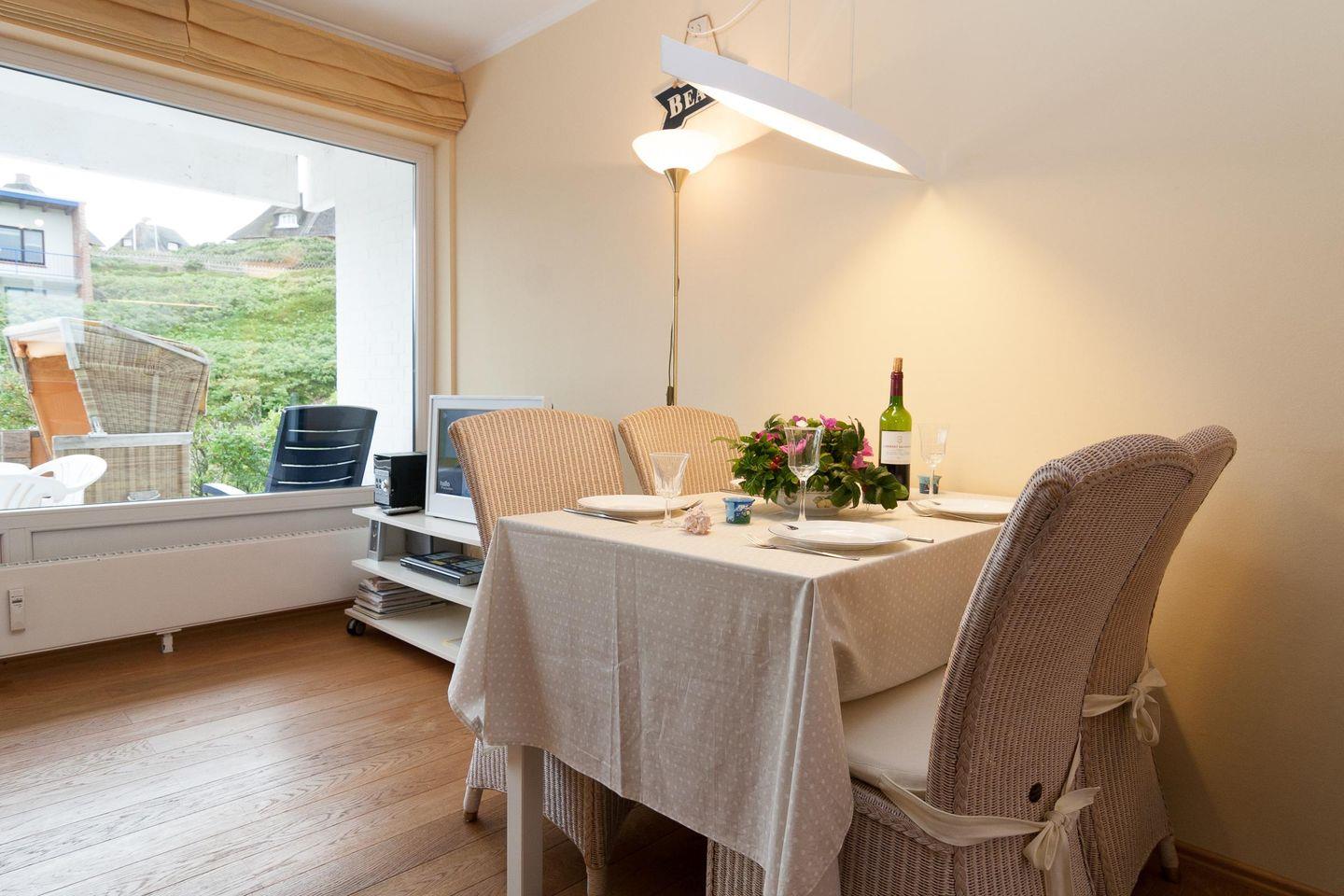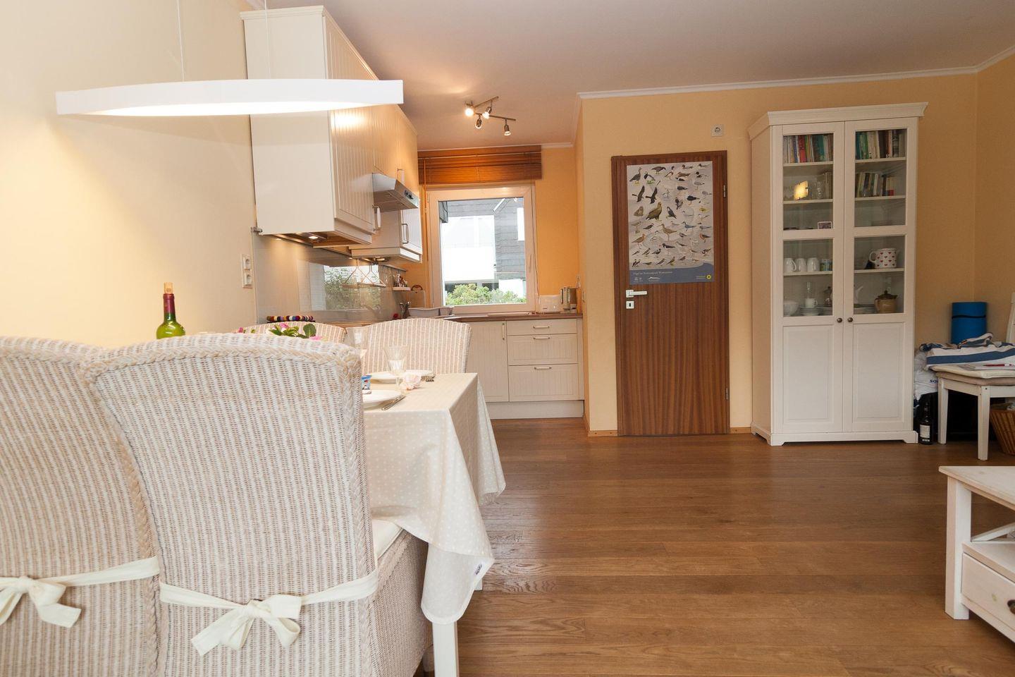 Diese helle Erdgeschoßwohnung verfügt über 2 Schlafzimmer und einem großem Wohnbereich mit angrenzender Küchenzeile. Das Badezimmer ist modern und hell eingerichtet. Das Bad verfügt über eine erhöhte Toilette. Wir bitten dies zu beachten. Ferienwohnung für bis zu 4 Personen (2 Erwachsene + 2 Kinder) in unmittelbarer Strandnähe zum Hauptbadestrand. Hörnum liegt im Süden der Nordseeinsel Sylt und ist von 3 Seiten von Meer umgeben. Inmitten der einzigartigen Dünen - und Heidelandschaft, ist Hörnum für Sylt- Liebhaber und Gäste schon lange kein Geheimtip mehr. Nicht nur für Alleinreisende, sondern auch für Familien mit Kindern ist hier viel Raum für Erholung pur gegeben. Vom Hörnumer Hafen fahren die Schiffe zu den Nachbarinseln (Amrum u. Föhr),Seehundsbänken und zu den Halligen.