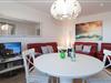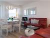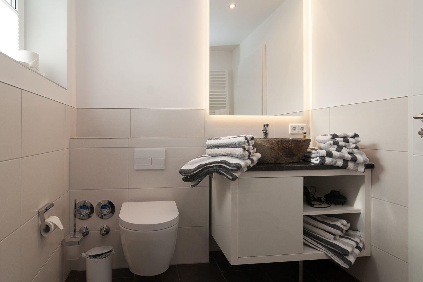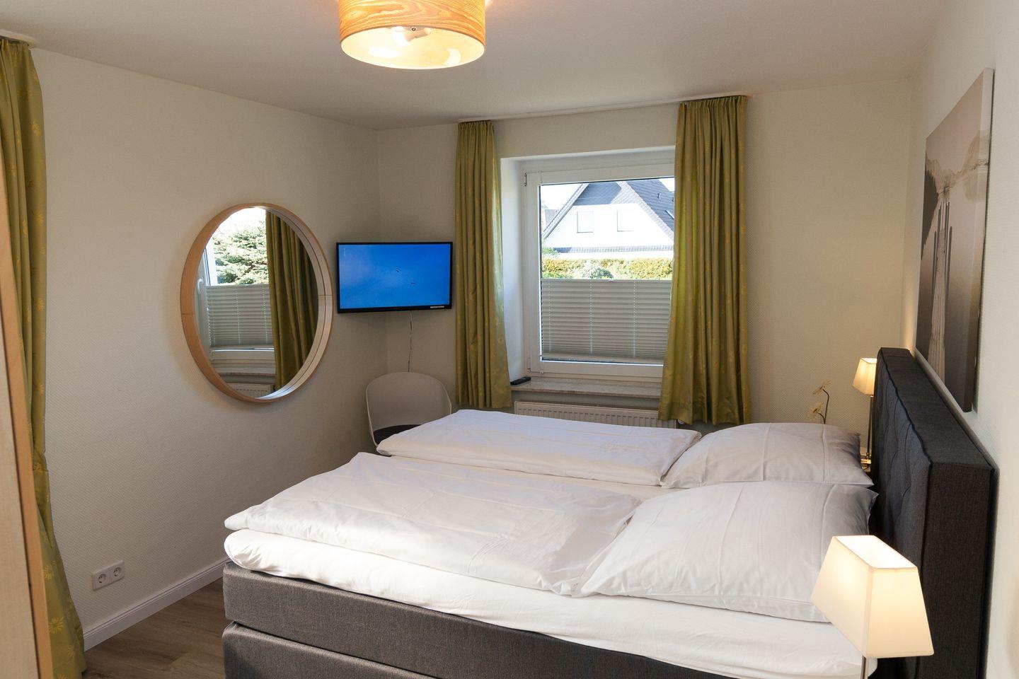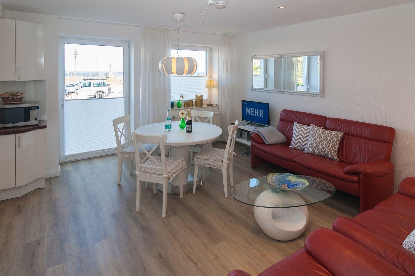 Das Appartement liegt im Erdgeschoß mit Blick zum Strand und Meer und besteht aus drei Räumen und zwei Terrassen. Es ist sehr hell und in modernem Stil eingerichtet. Vom großen Wohnraum mit neuen Ledersofalandschaft, Essecke, TVSAT und Radio führt eine kleine Treppe zur Terrasse mit Strandkorb und Holzgartenmöbeln, von hier aus sehen Sie Strand und Meer. Im Wohnraum befindet sich die Küchenzeile mit Geschirrspüler, Ceranherd und Backofen, Mikrowelle, Kühlschrank mit Gefrierfach, Kaffeemaschine, Wasserkocher und Toaster. Ein Doppel-Schlafzimmer mit Schrank und TVSAT-Anlage liegt ebenfalls in Richtung Strand.