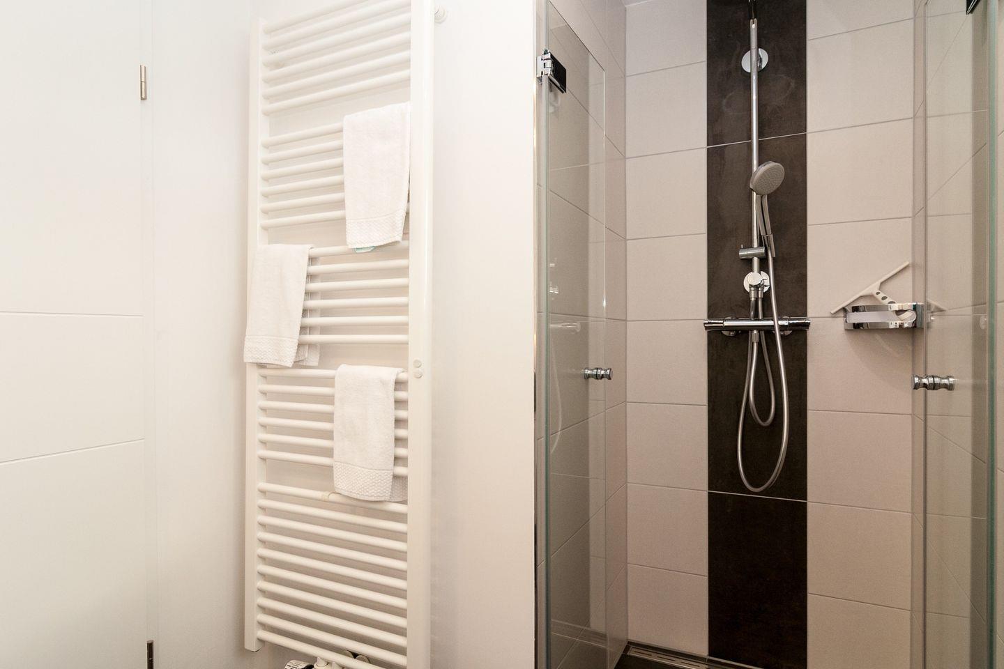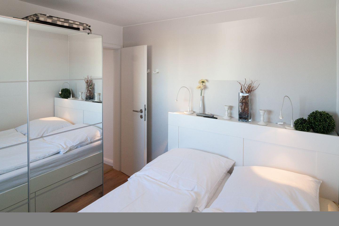 Nach Westen liegt das Schlafzimmer mit großem Doppelbett, Kleiderschrank, Kommode, TVSAT und Terrasse mit Holzboden und Gartenmöbeln, ein zweites Fenster liegt Richtung Norden. Direkt neben dem Schlafzimmer befindet sich das große, helle, hochwerig ausgestattte DuschbadWC mit großem Fenster Richtung Westen