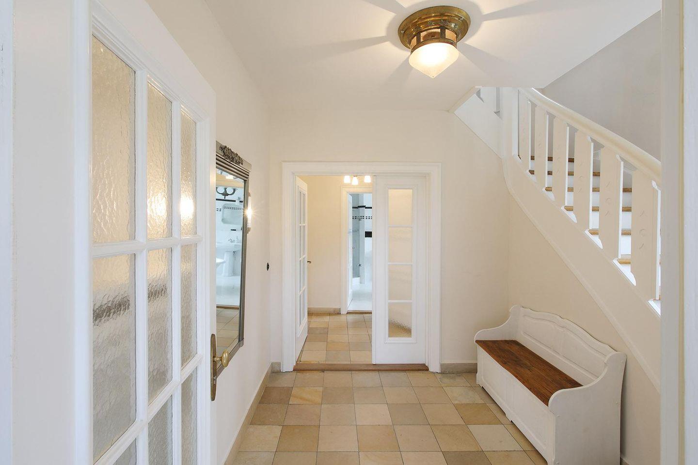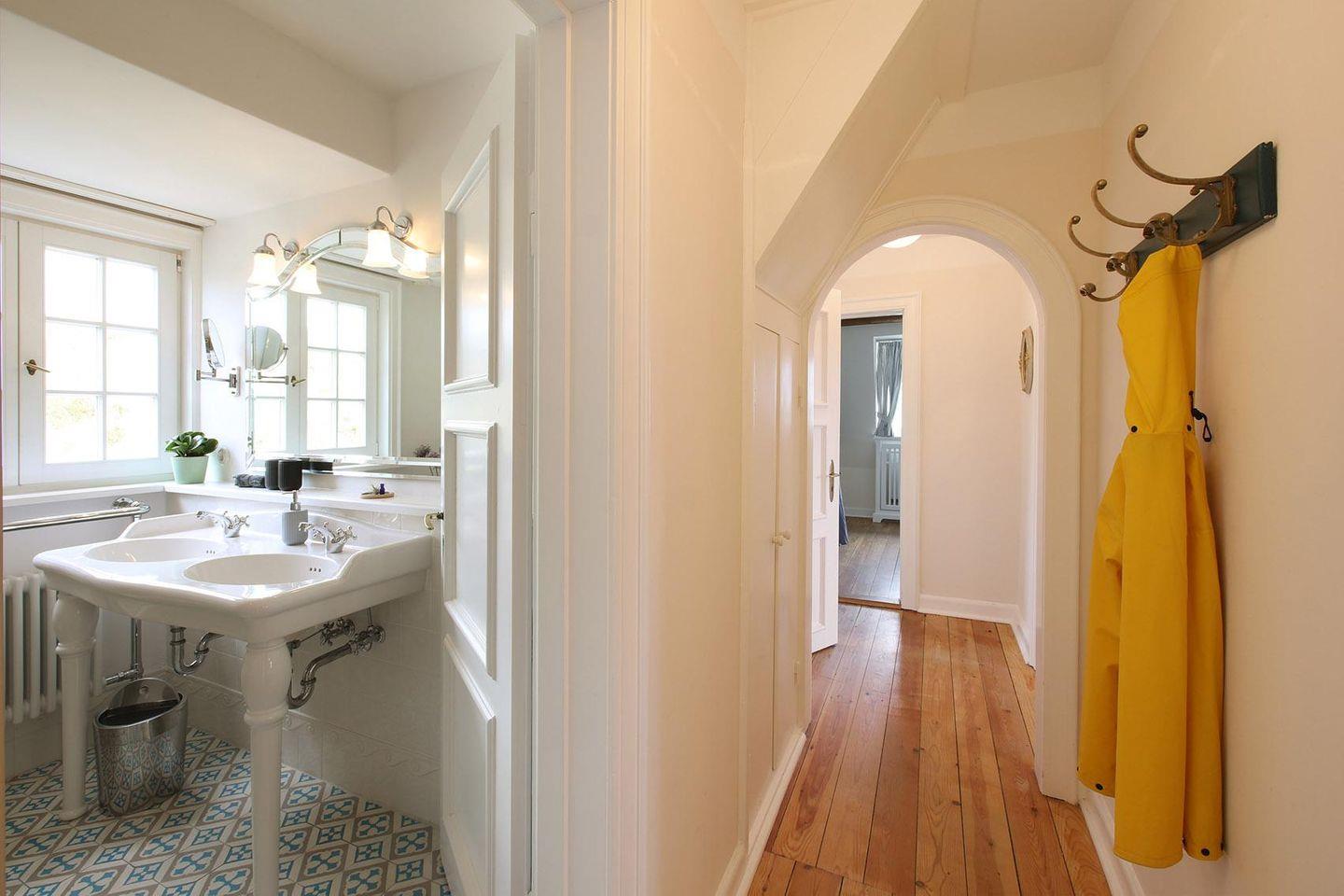 Über das großzügige Treppenhaus mit Holzdielen gelangen Sie in das 1. OG zur Bel Etage. Die Wohnung verfügt über ein Schlafzimmer mit Doppelbett sowie ein weiteres Schlafzimmer mit Einzelbett, welches für die 4. Person einen Auszug hat. Der kombinierte Wohnraum mit Essecke und Küchenzeile bietet einen hervorragenden Blick zum Leuchtturm. Hier haben Sie einen Flatscreen-Fernseher. Musik kann man über die Stereoanlage hören.
