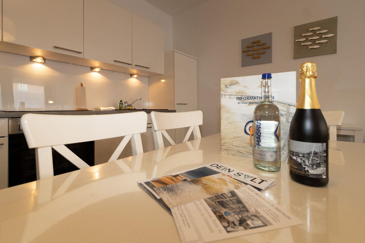 Sehr großzügige Ausstattung mit viel Platz zum Erholen. Die Wohnung ist in einen kombinierten Wohn-Schlafraum mit Küchenzeile und Esstisch, ein sehr großzügiges Schlafzimmer mit angrenzendem Duschbad sowie ein weiteres Schlafzimmer mit einem weiteren Duschbad ausgestattet. Der Esstisch, der sich auch im Wohnbereich befindet, bietet Platz für 6 Personen. Hier können Sie Freunde bewirten und verwöhnen. Neben dem zweiten Schlafzimmer liegt noch ein kleines Lesezimmer, das für die richtige Entspannung sorgen kann. Die Terrassenbestuhlung steht schon für die Sonnenstunden des Urlaubs bereit.