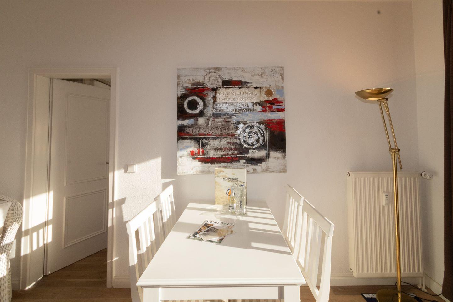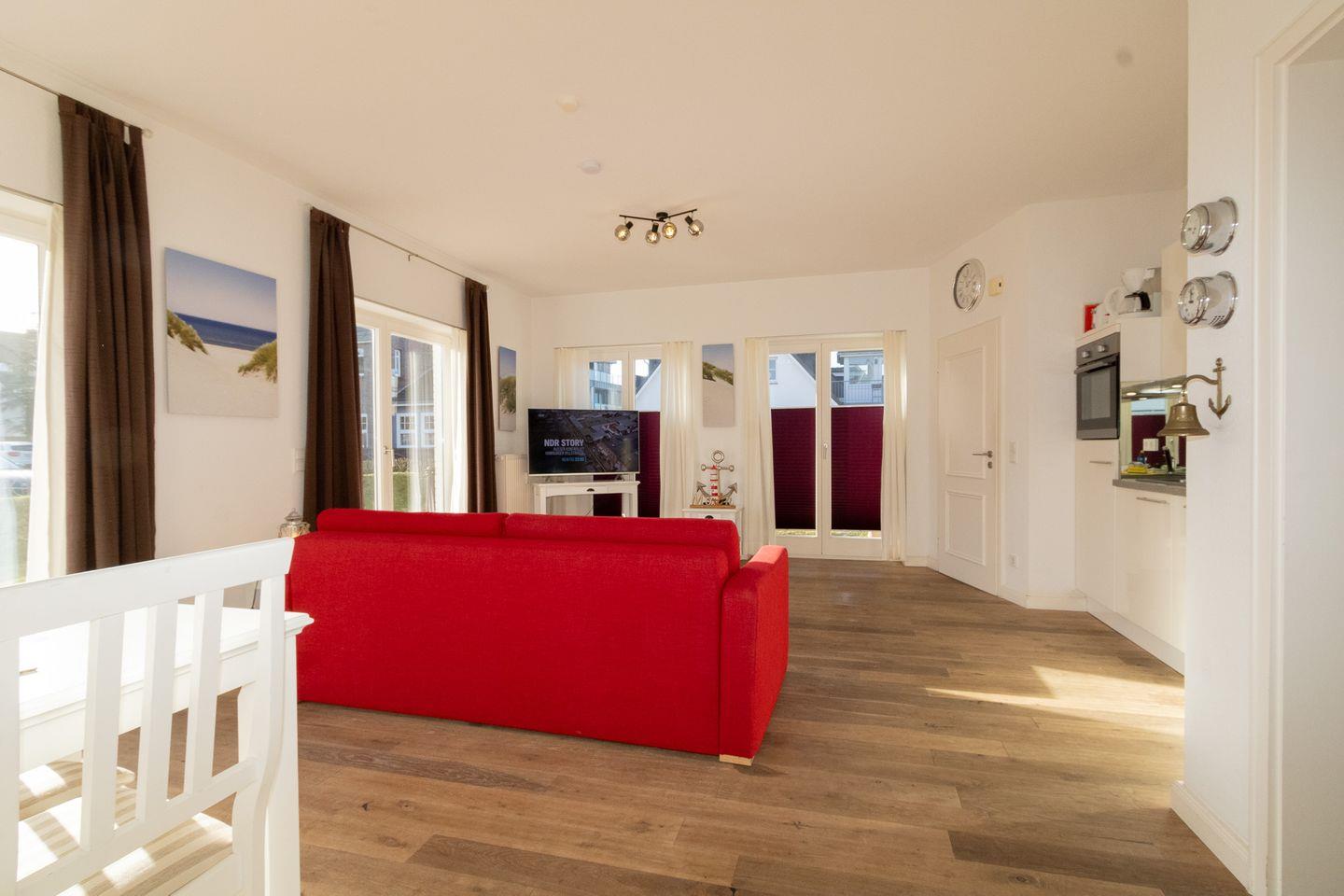 Die hell eingerichtete Ferienwohnung hat einen Wohn-/Schlafraum mit einer Schlafcouch (für 3. und 4.Person) und einen Esstisch sowie einen Fernseher für die gemütlichen Abende. In der offenen Einbauküche mit Geschirrspüler können Sie nach Herzenslust kochen. Das seperate Schlafzimmer befindet sich im hinteren Teil der Ferienwohnung. Nachttische, ein Regalschrank, ein Vitrinenschrank und ein Kleiderschrank bieten ausreichend Stauraum. Im neuen Duschbad steht Ihnen eine kostenfreie Waschmaschine zur Verfügung.