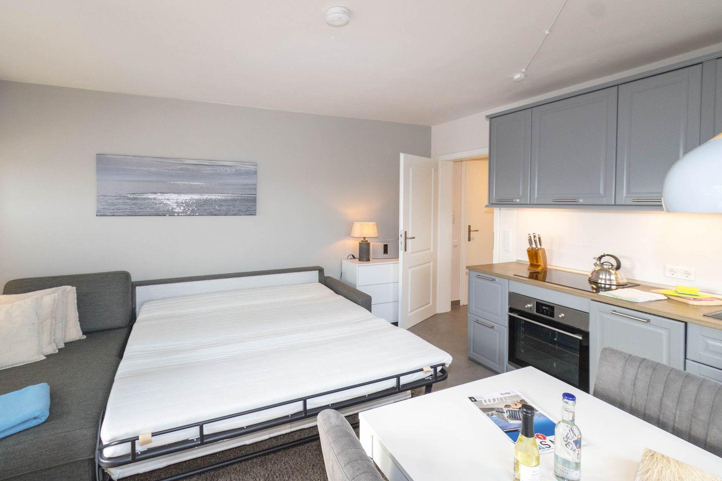 Auf einer Ebene finden Sie den Wohnbereich mit gemütlicher Sofaecke (Schlafsofa für die 3. und 4. Person). Das Schlafsofa hat eine Liegefläche von 160 x 200 cm. Die zum Wohnbereich offene Küche verfügt über Backofen , Ceran-Kochfeld, einen Kühlschrank mit Gefrierfach und einen Geschirrspüler. Sie enthält neben Toaster und Kaffeemaschine alle Dinge für den täglichen Gebrauch. Im Küchen- und Wohnbereich befindet sich auch noch ein Esstisch von dem man Blick auf den Ort hat.