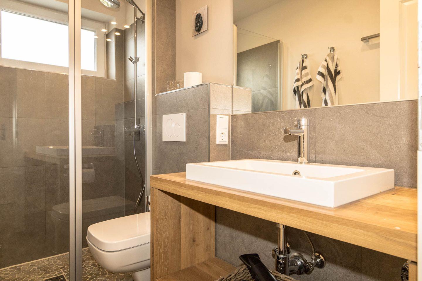 Auf dieser Ebene befindet sich auch das moderne Bad mit Dusche und WC sowie ein Schlafzimmer mit Doppelbett.