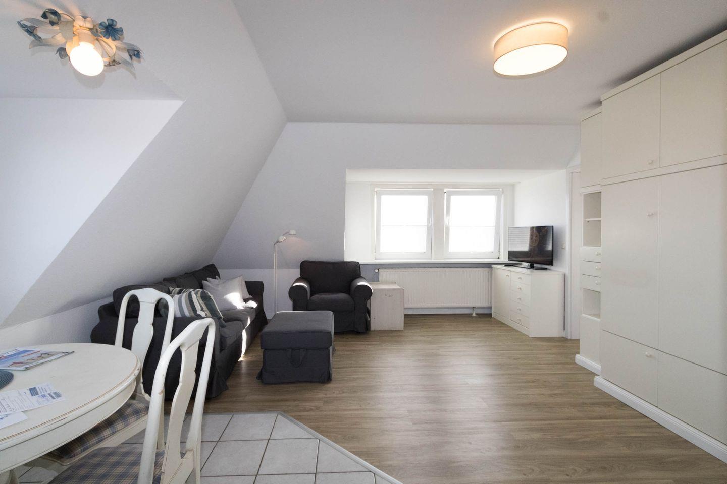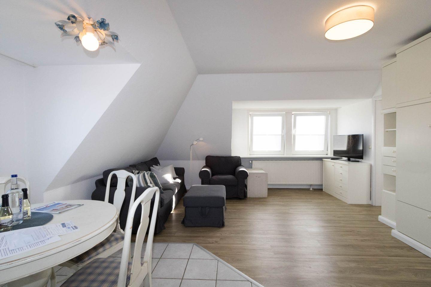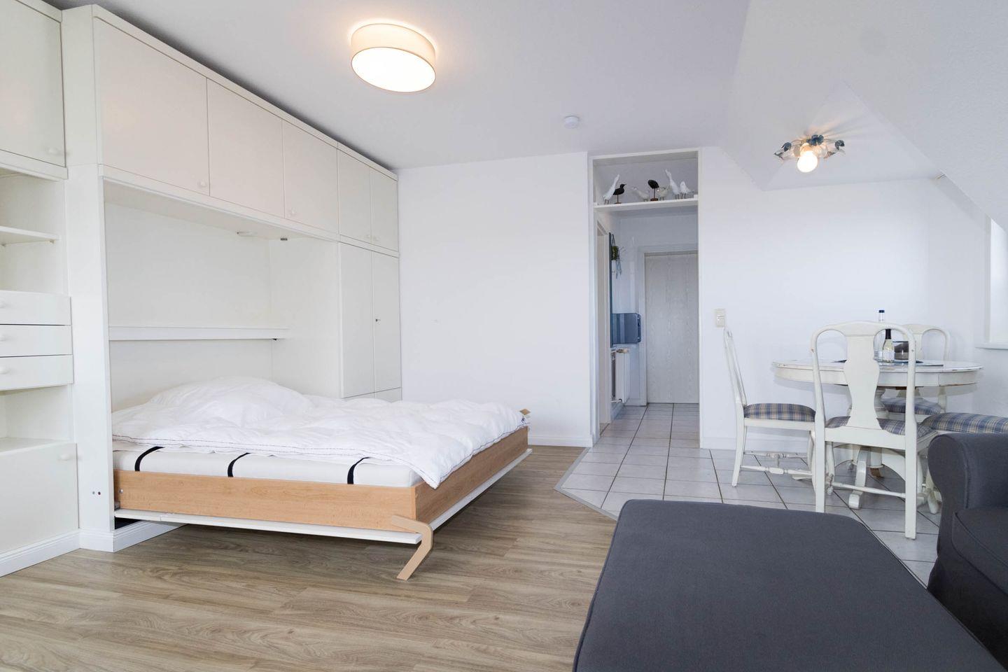 In dieser gemütlichen Wohnung haben Sie den rundum Meerblick gleich mit gebucht. Die Wohnung verfügt über eine sep. kleine Küche, einen Wohnraum, der mit Esstisch für 4 Personen ausgestattet ist. Im Wohnraum befindet sich auch ein Schrankbett (140 x 190cm). Ein Nebenzimmer mit 2 Einzelbetten bietet die Schlafgelegenheit für die 3. und 4. Person. Das Duschbad ist innenliegend.