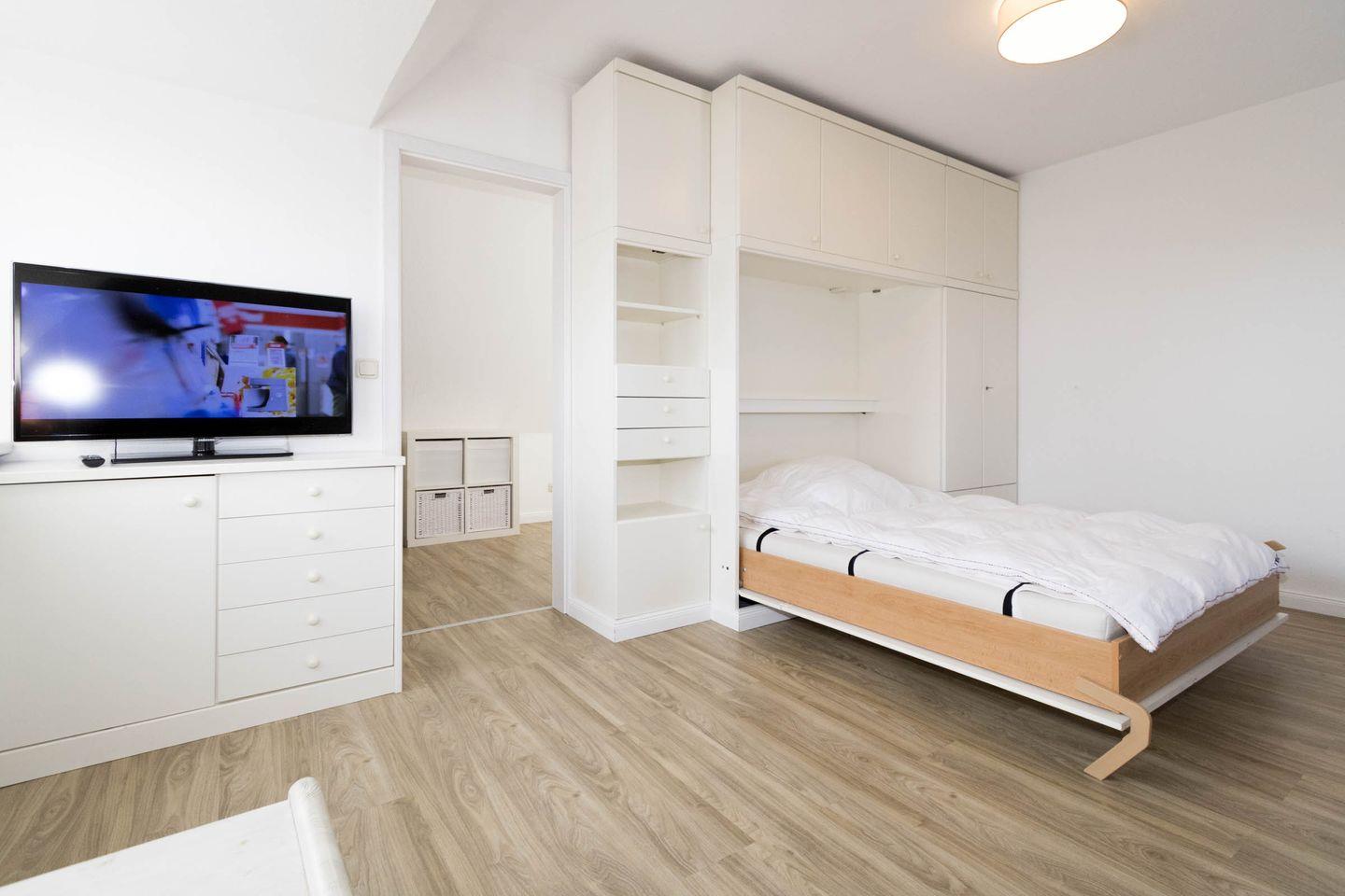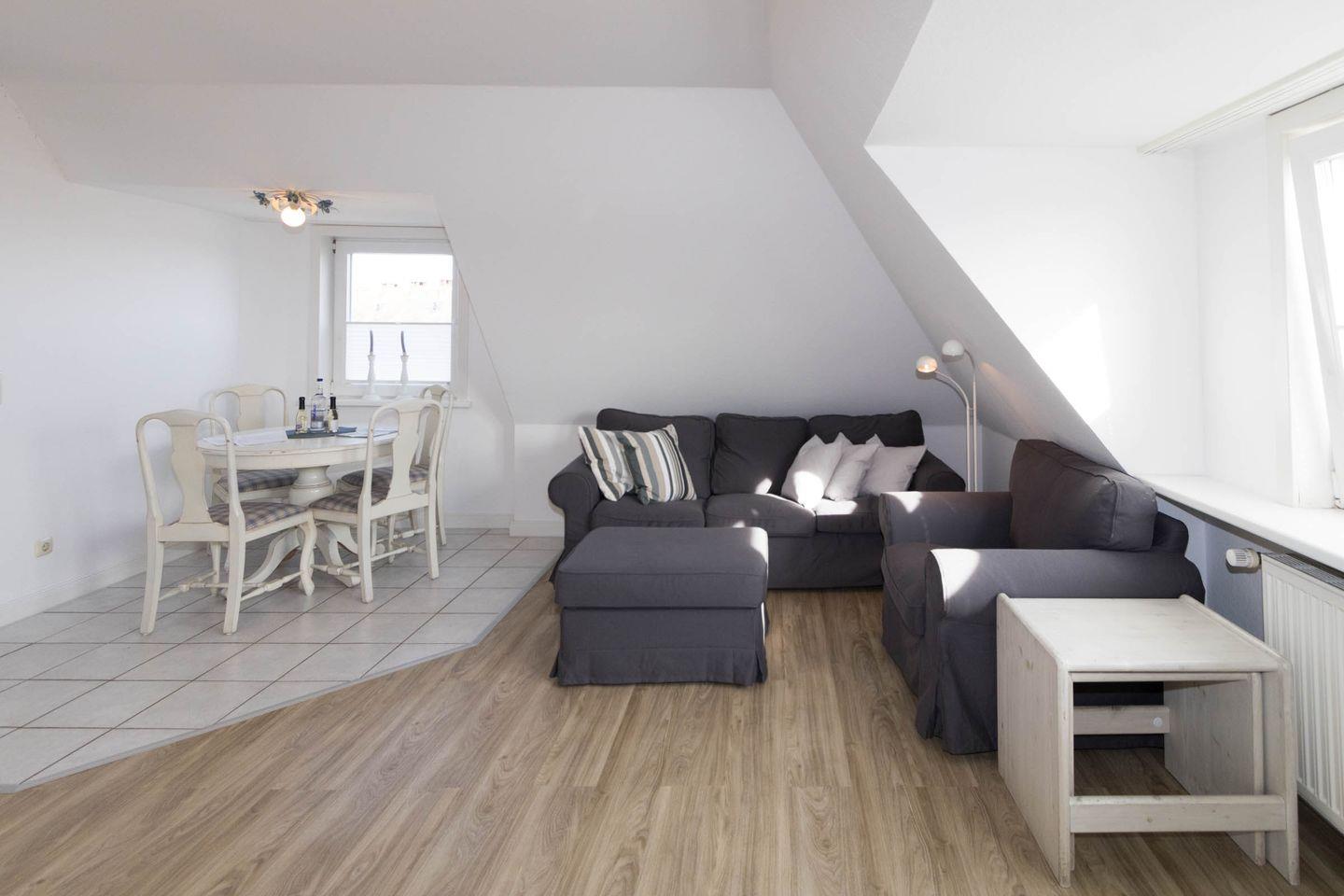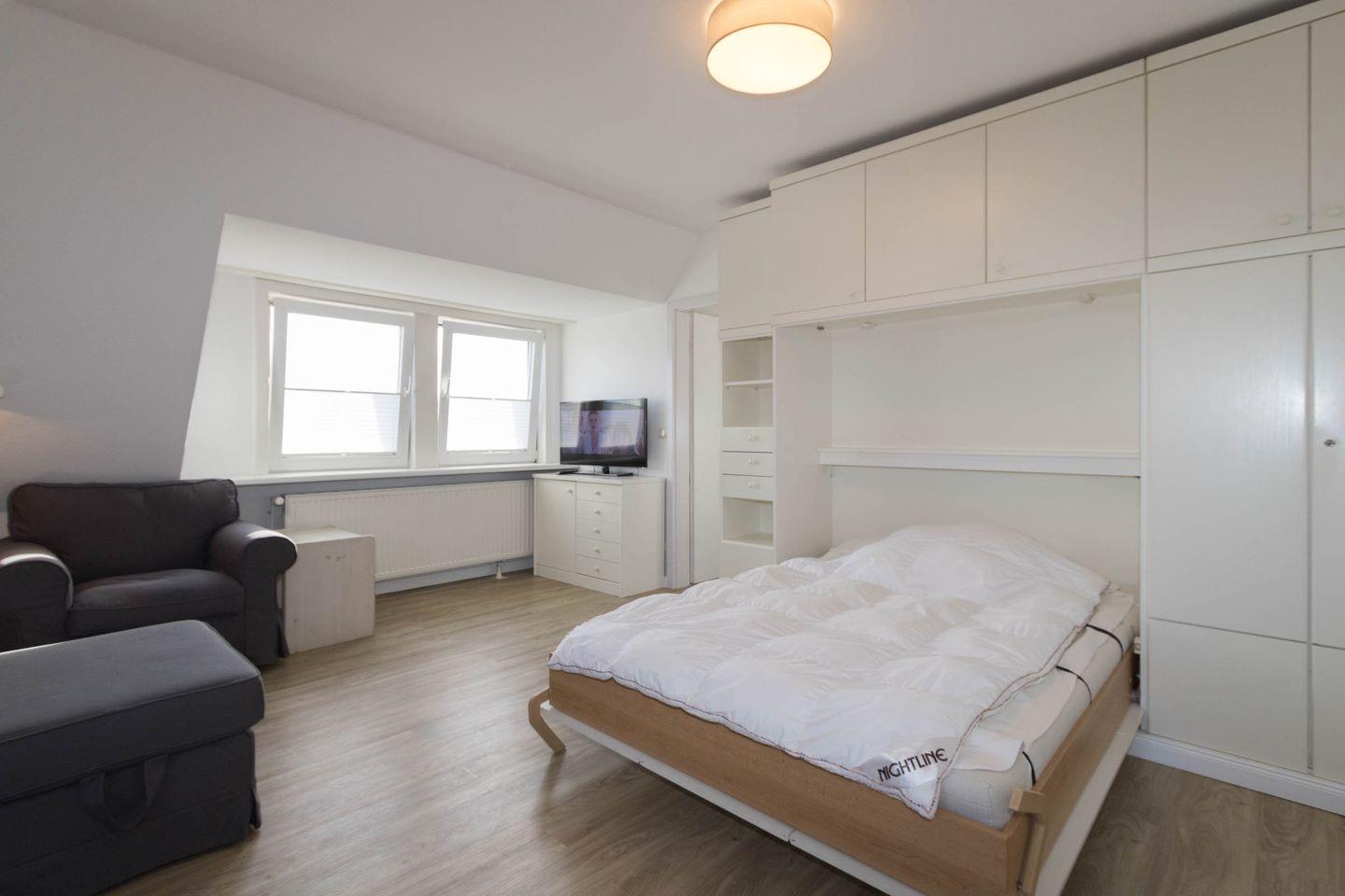 In dieser gemütlichen Wohnung haben Sie den rundum Meerblick gleich mit gebucht. Die Wohnung verfügt über eine sep. kleine Küche, einen Wohnraum, der mit Esstisch für 4 Personen ausgestattet ist. Im Wohnraum befindet sich auch ein Schrankbett (140 x 190cm). Ein Nebenzimmer mit 2 Einzelbetten bietet die Schlafgelegenheit für die 3. und 4. Person. Das Duschbad ist innenliegend.