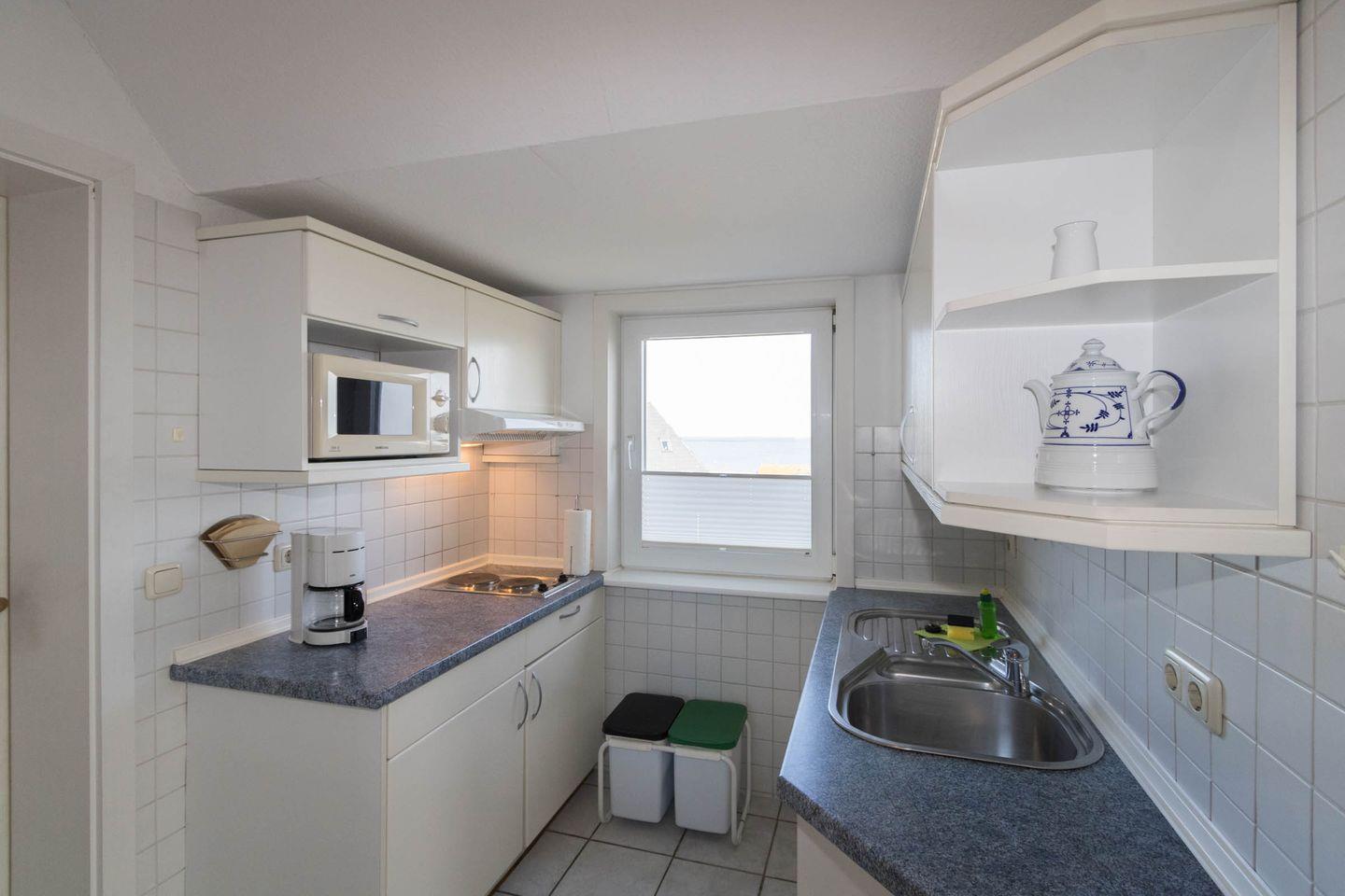 Die sep. kleine Küche ist mit einem 2-Platten-Herd und Mikrowelle ausgestattet.
