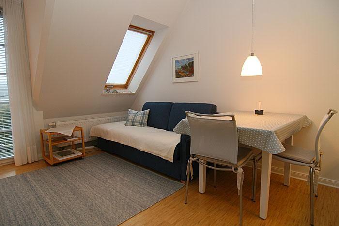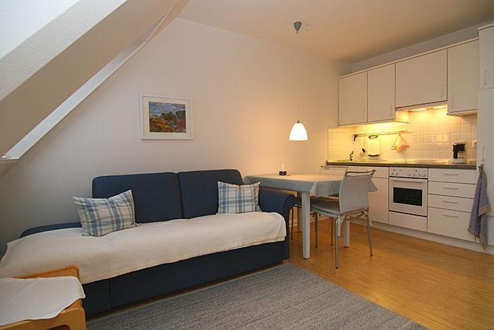 Aufgeteilt in einen Wohnraum mit Küchenzeile und Esstisch, ein Duschbad und einem Schlafraum, der über die Treppe im Flur erreicht werden kann, bietet diese Wohnung alles, was man zu einem erholsamen Urlaub braucht. Vom Wohnraum aus gelangen Sie auf den Balkon zum Süden.