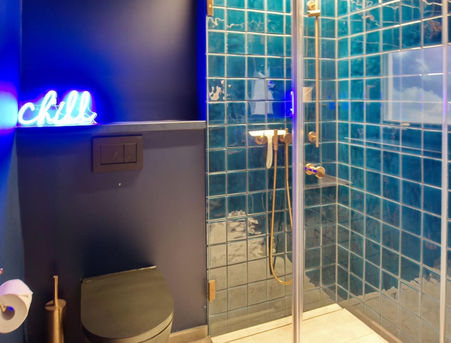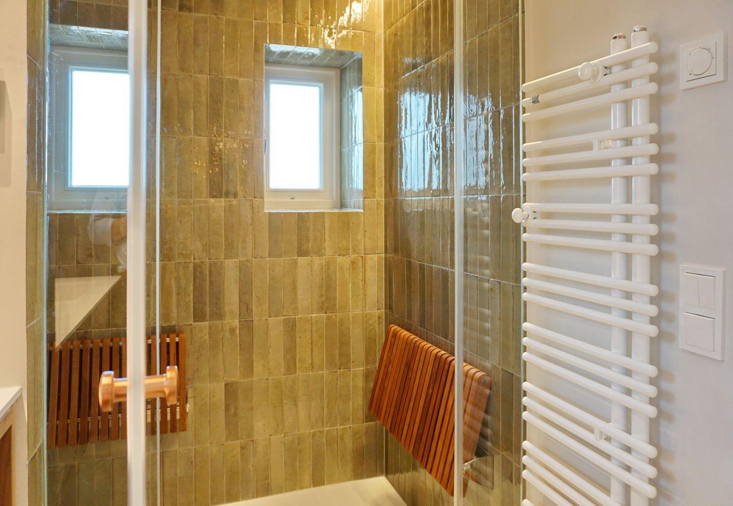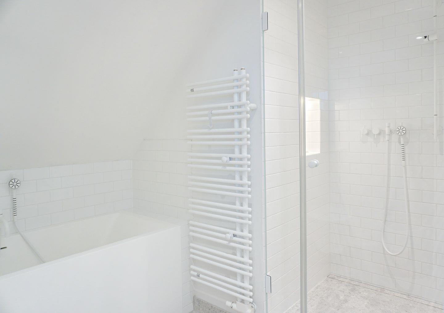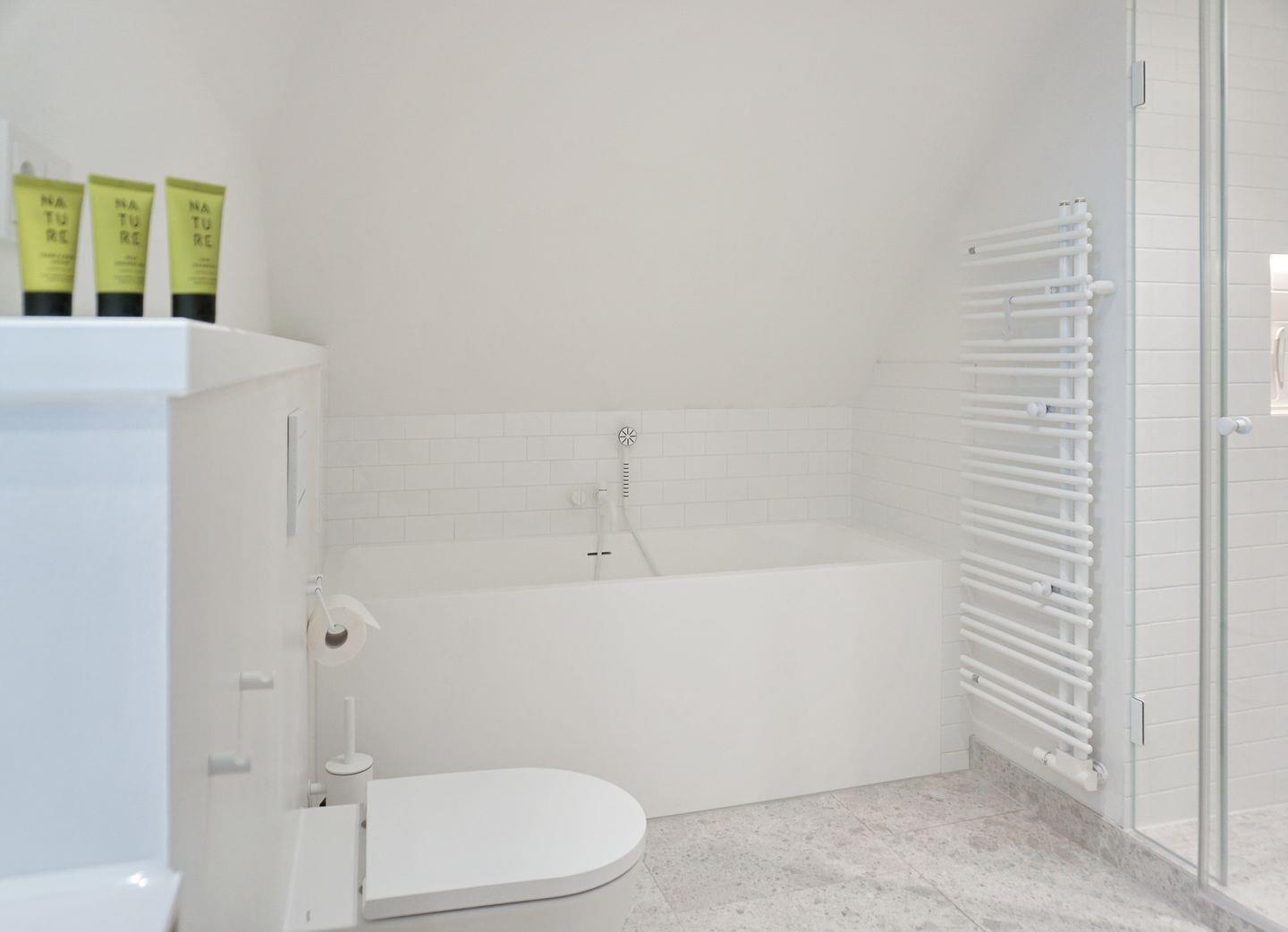 Bad 2: helles, weißes Bad mit Badewanne, Dusche, Toilette , Einzelwaschtisch und Blick aufs Meer