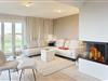 Wohnen: gemütliche Sitzecke am Kamin bestehend aus einer Eckgarnitur mit Flat-TV und wunderschönem Blick aufs Meer und den Sonnenuntergang