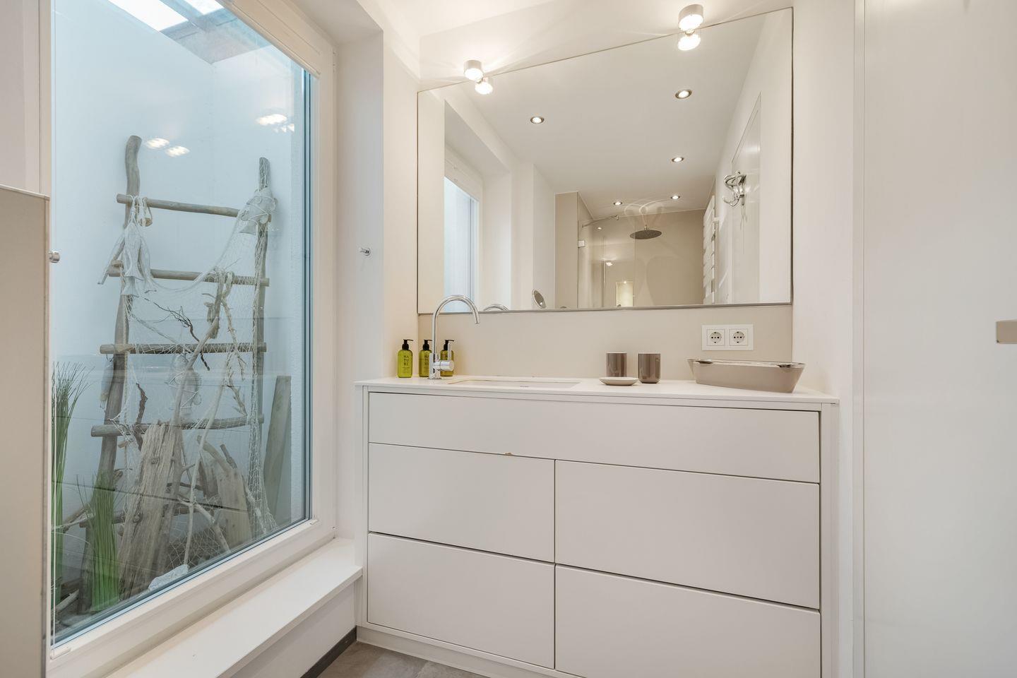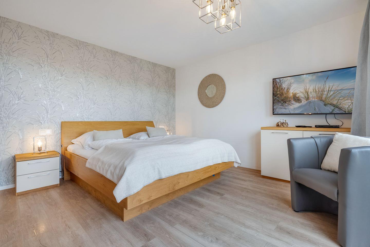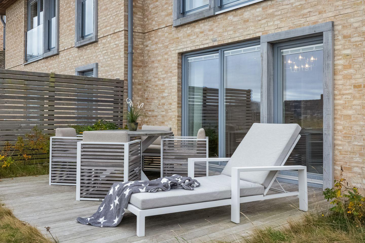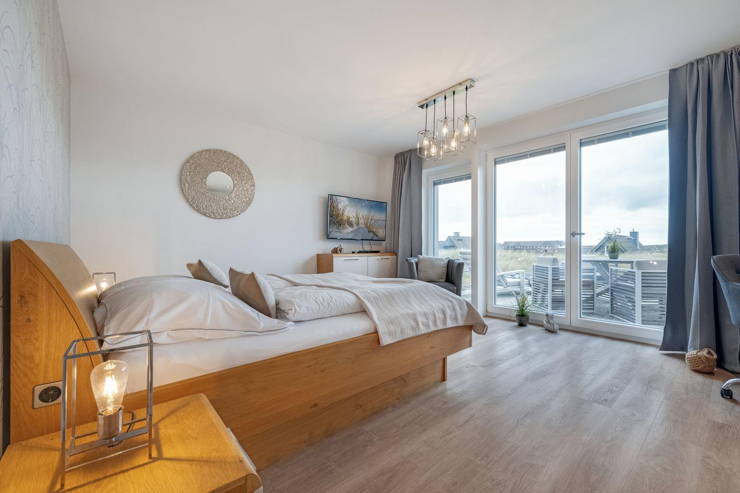 Mittelpunkt der Wohnung ist der offen gestaltete Wohn- und Essbereich mit hochwertigen Möbeln und einem Gaskamin, der auch an verregneten Tagen für Gemütlichkeit sorgt. Zum Wohnbereich gehört außerdem eine moderne Küchenzeile mit Geschirrspülmaschine, Backofen und Induktionskochfeld. Vom Wohnbereich aus erreichen Sie Ihre Terrasse von der aus Sie sowohl das Wattenmeer als auch den Weststrand der Insel bewundern können.