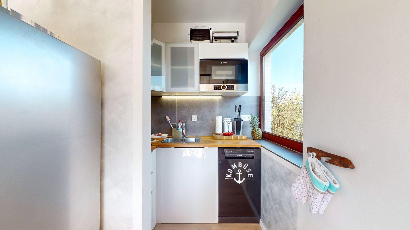 Offener, lichtdurchfluteter Wohnbereich mit großer Fensterfront, Sofaecke, Esstisch und kleiner gut augestatteter Küche (Spülmaschine, Grill- und Mikrowellen-Kombination, Cerankochfeld, Filterkaffee- und Nespresso-Maschine und vieles mehr)