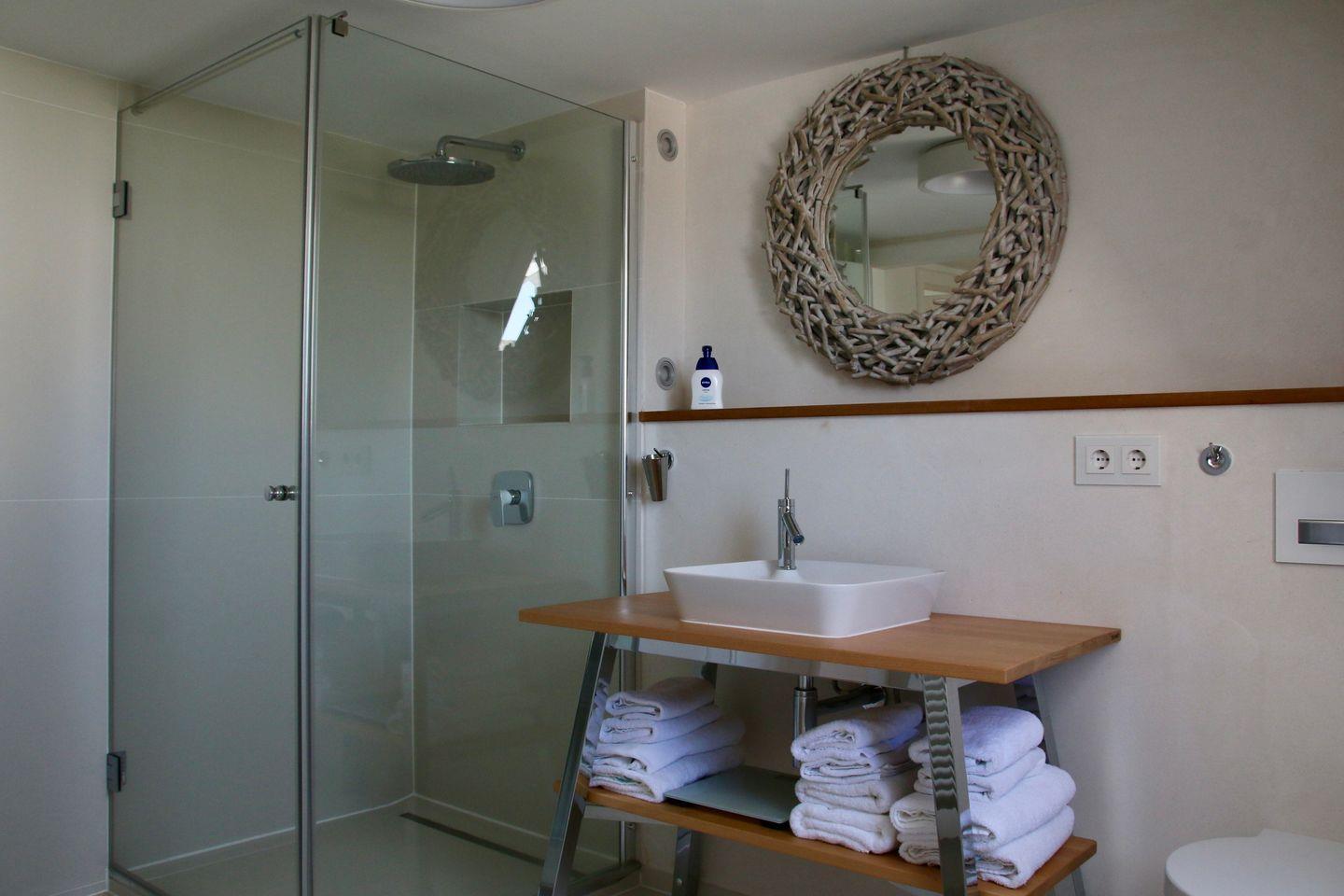 Ein Schlafzimmer befindet sich im Erdgeschoss, zwei Schlafzimmer im 1. Obergeschoss und eines der Schlafzimmer im Dachgeschoss auf ca. 50?qm mit Schlaflandschaft für Kinder, En-Suite-Bad und Meerblick bis nach Amrum sowie ein fünftes Schlafzimmer im Keller mit eigenem Bad und angrenzender Sauna. Das große Wohn- und Esszimmer ist lichtdurchflutet und ausgestattet mit einem 55-Zoll-Fernseher, Apple TV sowie hochwertigen italienischen Designmöbeln.