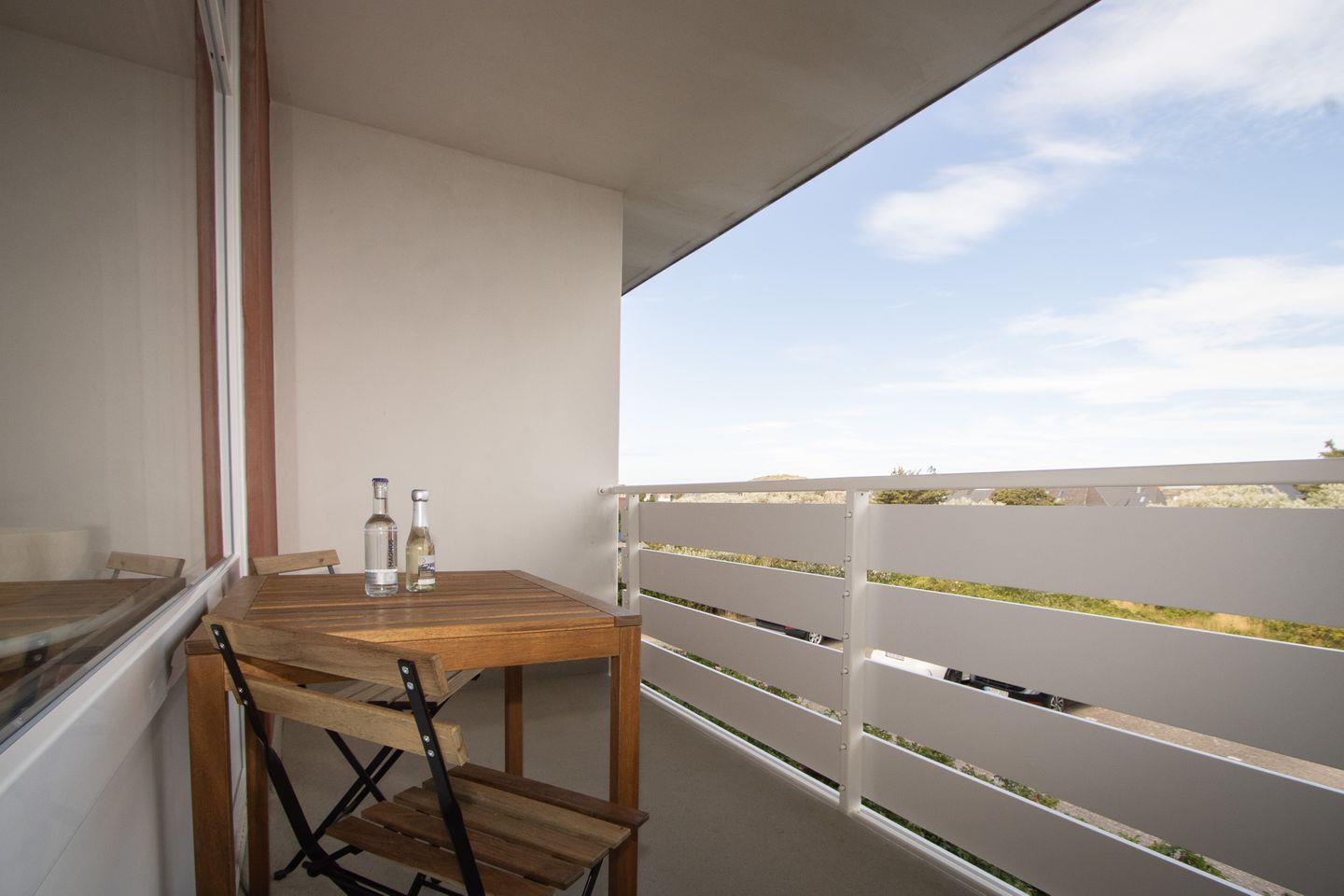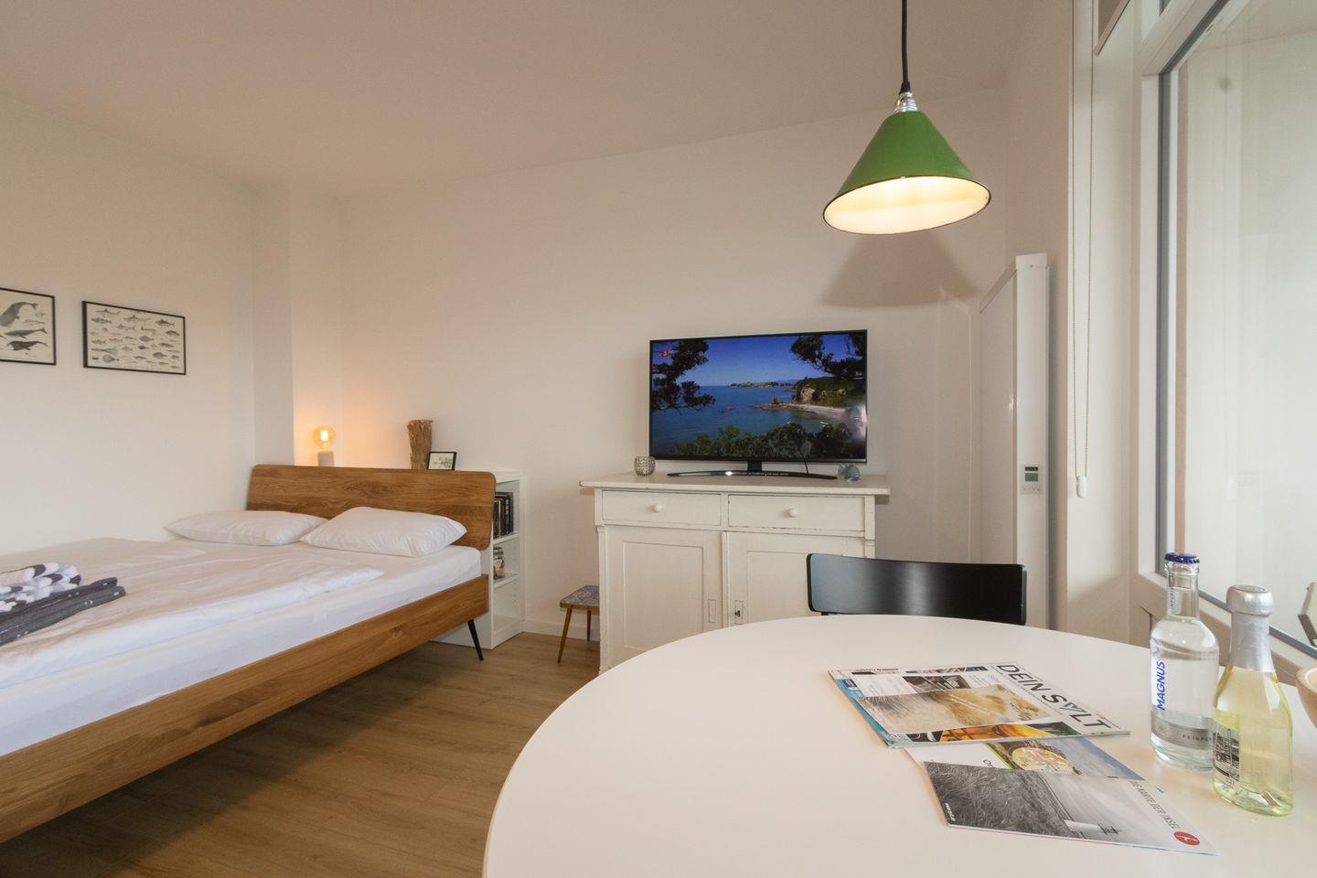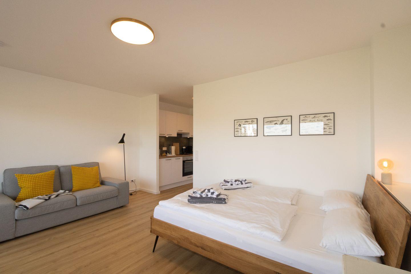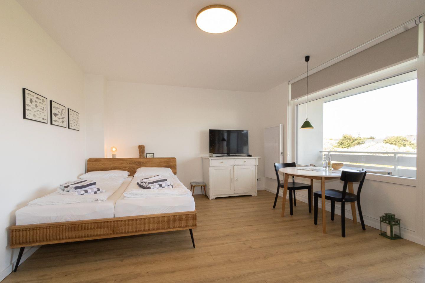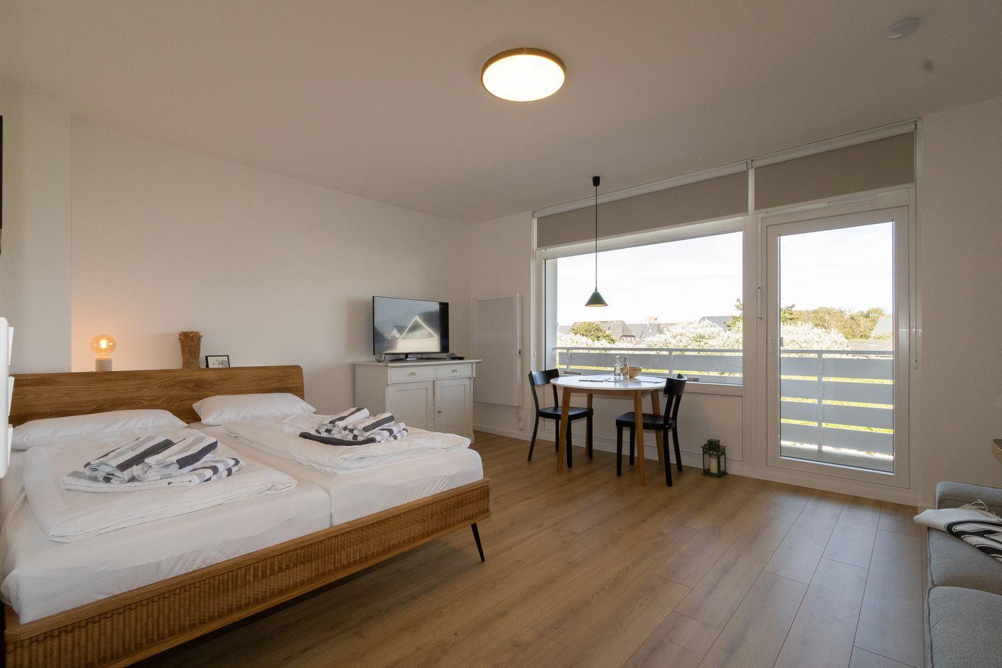 Mit viel Liebe wurde diese Ferienwohnung gerade neu renoviert und ist für 2 Personen sehr gut geeignet. Vom großzügigen Wohn-/Schlafraum gelangen Sie auf den geräumigen Balkon, von dem Sie gen Osten den Sonnenaufgang genießen können. Der Strand, Hafen und auch die Einkaufsmöglichkeiten sind gut zu Fuß in wenigen Minuten zu erreichen. Der Schlafbereich ist mit im Wohnbereich integriert.