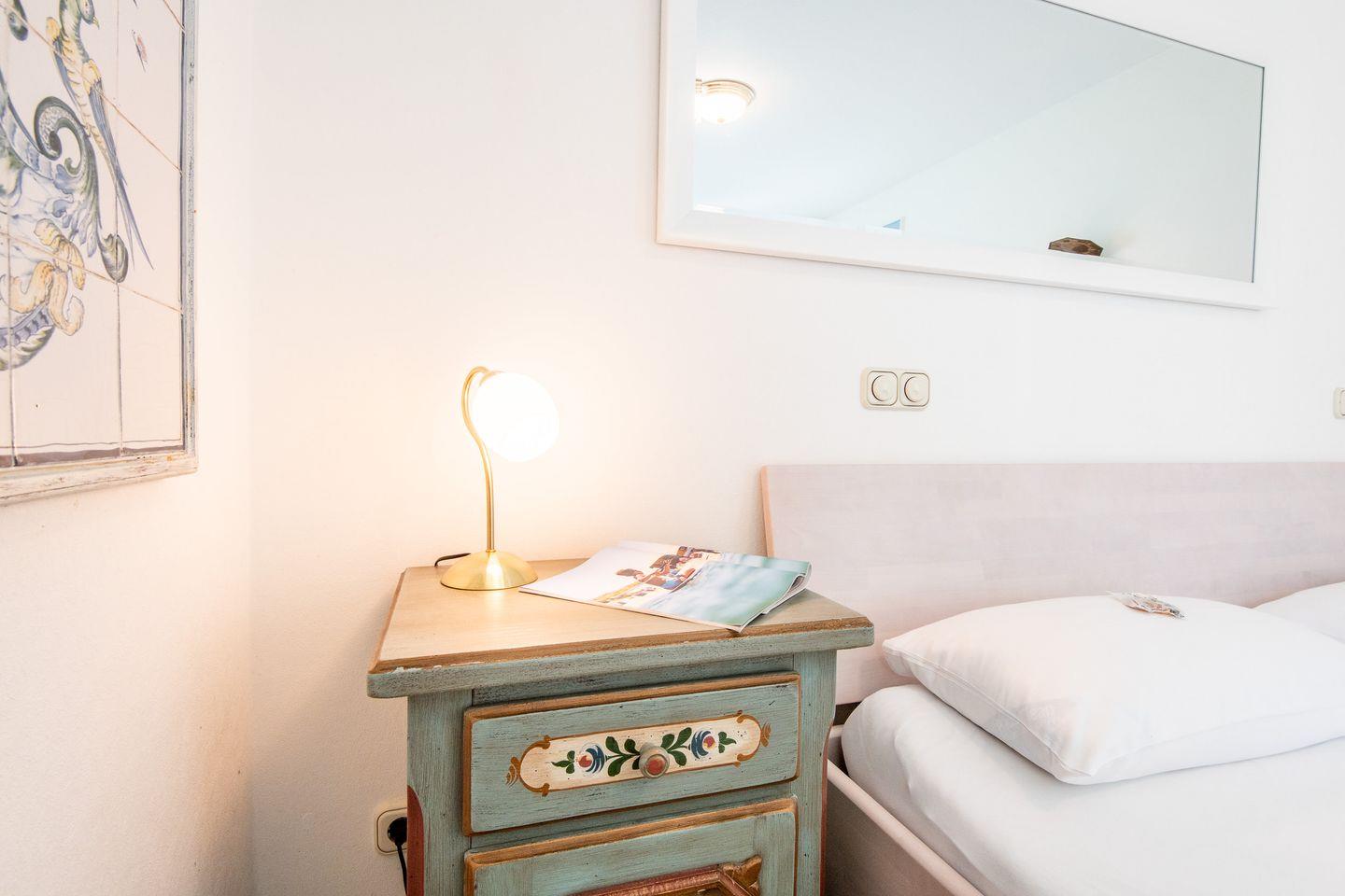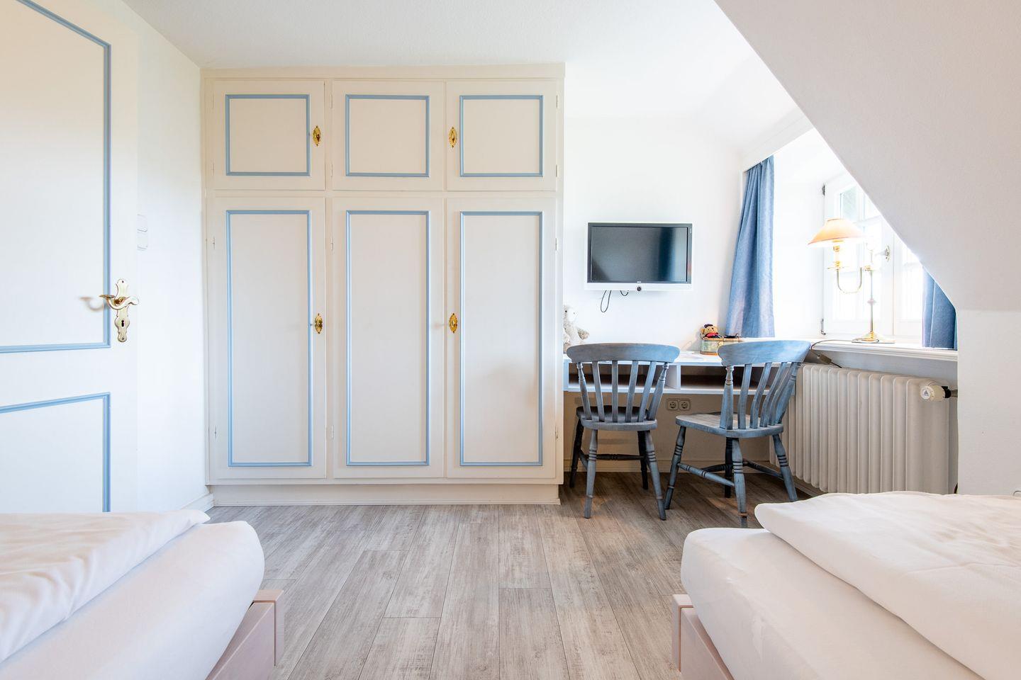 Die drei stilvoll eingerichteten Schlafzimmer bieten viel Komfort und Rückzugsraum für erholsame Nächte. Das erste und zweite Schlafzimmer sind jeweils mit einem Doppelbett (180x200 cm), Kleiderschrank und TV ausgestattet, während das dritte Schlafzimmer mit zwei Einzelbetten (je 90x200 cm) eine perfekte Schlafmöglichkeit für weitere Gäste bietet.