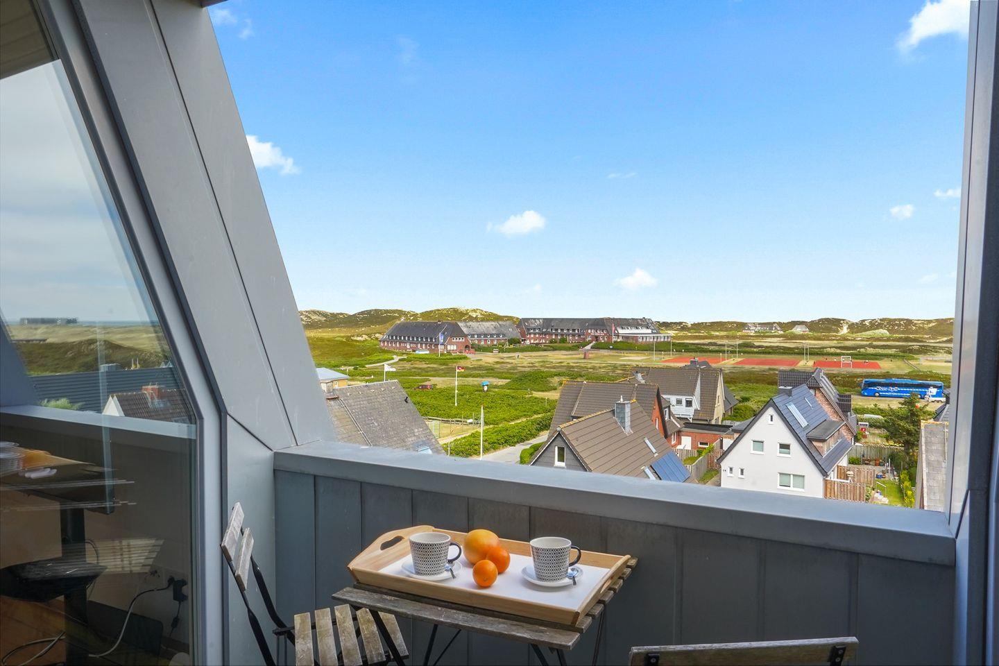 Der Essplatz bietet Raum für bis zu vier Personen, und das LIGNE ROSET-Schlafsofa (160?x?200?cm) im Wohnbereich ermöglicht auch spontanen Übernachtungsgästen einen komfortablen Aufenthalt. Für Unterhaltung sorgen eine Sonos-Box, ein Radio und ein Flatscreen-TV. Der kleine Balkon lädt zum Frühstück mit Aussicht ein – bei klarer Sicht können Sie bis nach Amrum oder Wyk auf Föhr blicken, während sich vor Ihnen die Sylter Dünen- und Heidelandschaft ausbreitet.