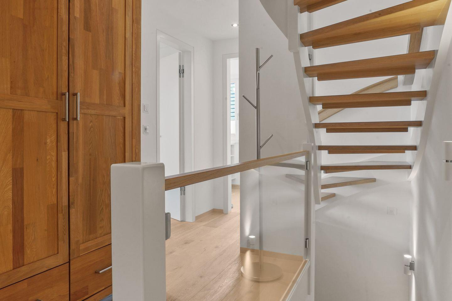 Die Wohnung befindet sich in einem stilvollen Neubau und erstreckt sich über Ober- und Dachgeschoss. Echtholzparkett und zahlreiche elegant integrierte Einbauleuchten sorgen für eine warme, behagliche Atmosphäre. Über die Diele im Erdgeschoss gelangen Sie über eine schöne Holztreppe ins Obergeschoss. Dort empfängt Sie ein offener Wohn- und Essbereich mit viel Tageslicht, ein großzügiges Badezimmer mit Dusche/WC sowie eine hochwertig ausgestattete Küche mit allem, was das Herz ambitionierter Hobbyköche höherschlagen lässt: Induktionskochfeld, Backofen mit integrierter Mikrowelle, Geschirrspüler, Nespresso-Maschine sowie edles Porzellan und Gläser.