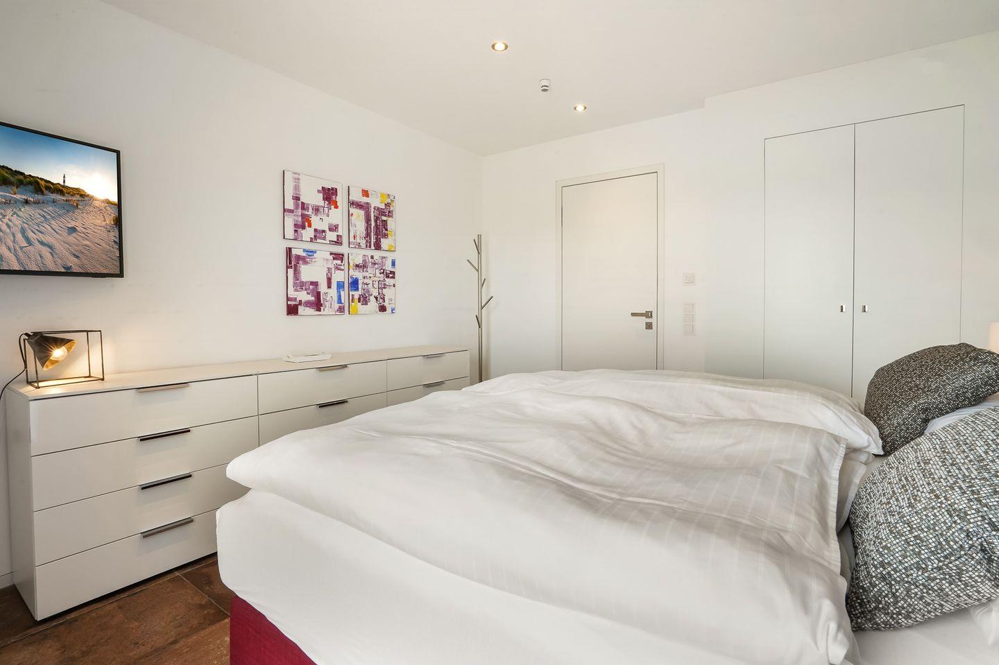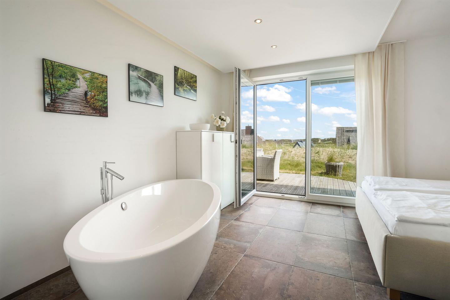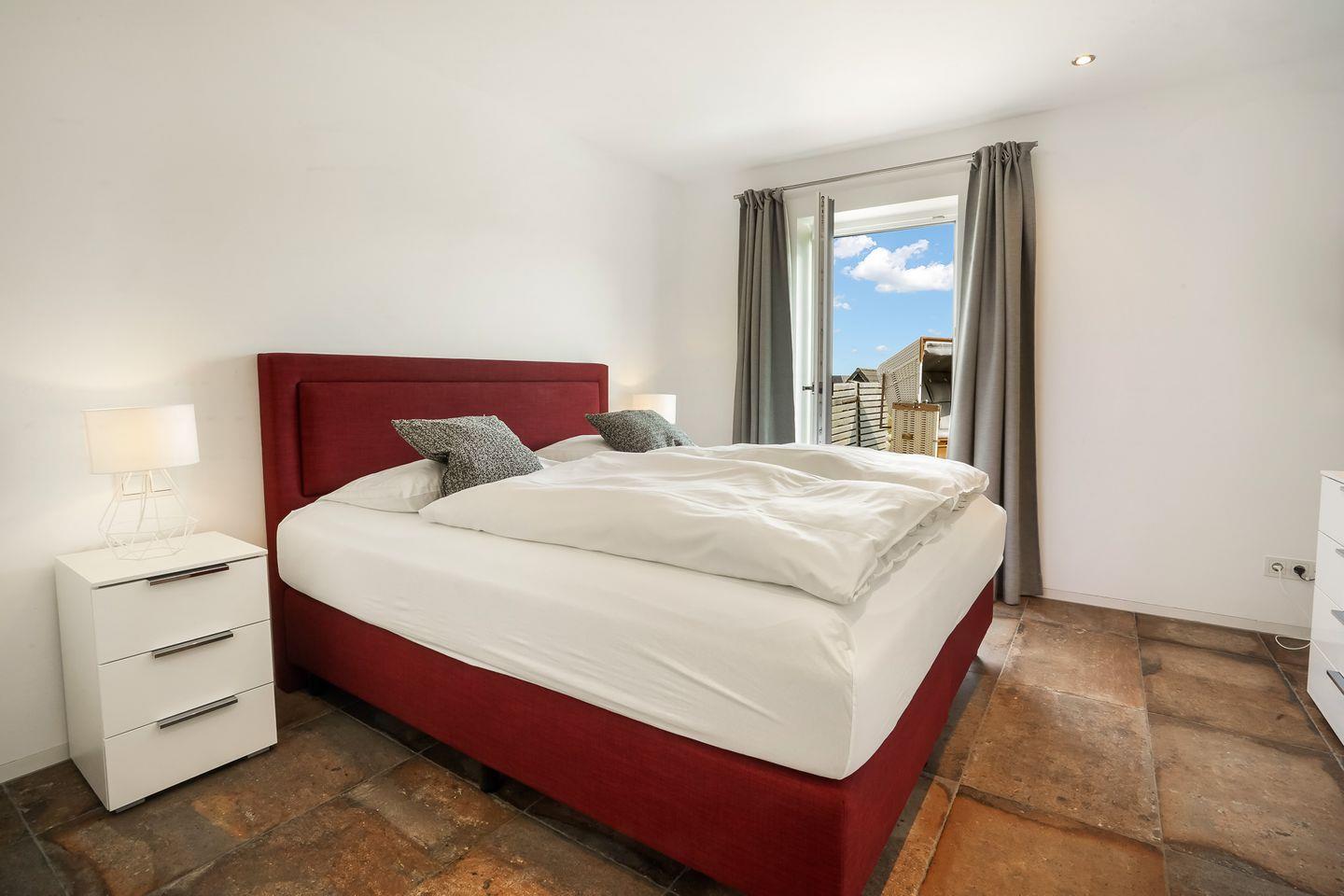 Im lichtdurchfluteten Warftgeschoss vereinen sich Schlaf- und Wellnessbereich auf besondere Weise. Zwei komfortable Doppelbetten (180x200?cm und 160x200?cm) sorgen für erholsamen Schlaf – bodentiefe Fenster eröffnen dabei einen herrlichen Blick auf den Garten und den Strandhafer. Eine freistehende Badewanne, ein modernes Badezimmer mit Dusche und WC sowie die großzügige Outdoor-Sauna mit direktem Zugang zur Terrasse bieten pure Erholung – zu jeder Jahreszeit.