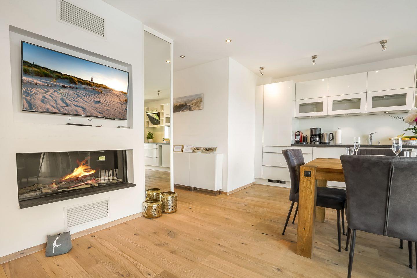 Das Apartment erstreckt sich über zwei Ebenen – Erd- und Warftgeschoss – und beeindruckt mit hochwertigen Materialien wie Echtholzparkett und edlen italienischen Fliesen. Im Erdgeschoss lädt der offen gestaltete Wohnbereich mit Gaskamin zu gemütlichen Abenden ein. Eine voll ausgestattete Küche mit Induktionsherd, Backofen-Mikrowellen-Kombination, Geschirrspüler, Nespresso- und Filterkaffeemaschine sowie feinem Porzellan und Gläsern lässt das Herz jedes Hobbykochs höherschlagen. Ein großzügiger Esstisch für bis zu sechs Personen schafft den idealen Rahmen für gemeinsame Mahlzeiten. Abgerundet wird das Erdgeschoss durch ein praktisches Gäste-WC.