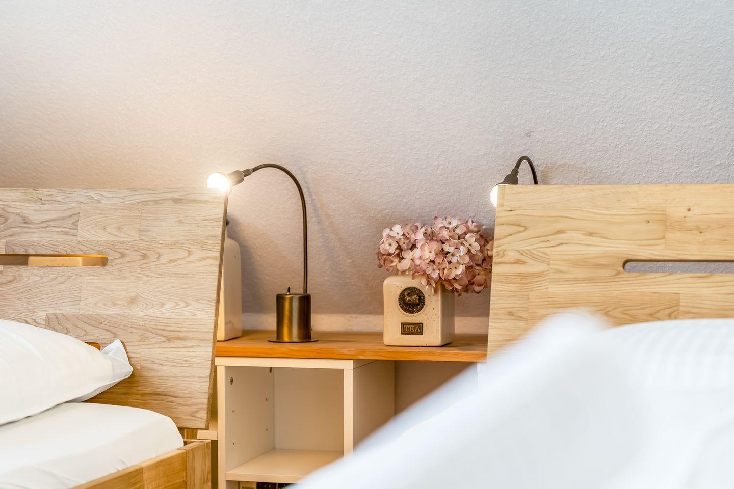 Das helle Apartment im 1. Stock überzeugt mit einem freundlichen Wohnambiente: Ein separates Schlafzimmer und ein offener Wohn- und Essbereich schaffen Raum zum Ankommen und Wohlfühlen. Bodentiefe Fenster im Wohnbereich lassen viel Tageslicht herein und geben den Blick auf die grüne Umgebung. Auf dem privaten Balkon genießen Sie morgens Ihren Kaffee – begleitet vom Rauschen der Nordsee mit Blick ins Grüne Tal.