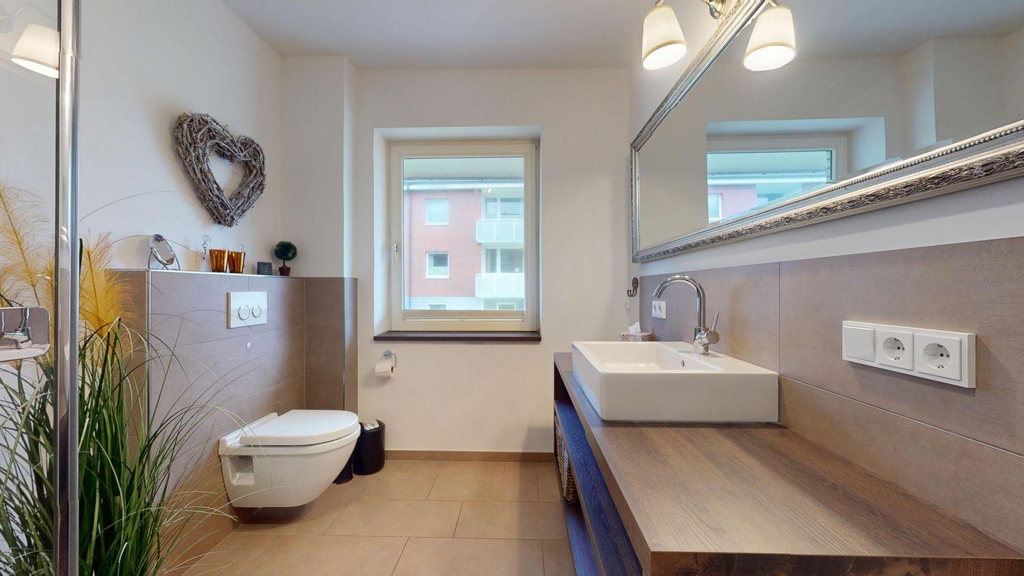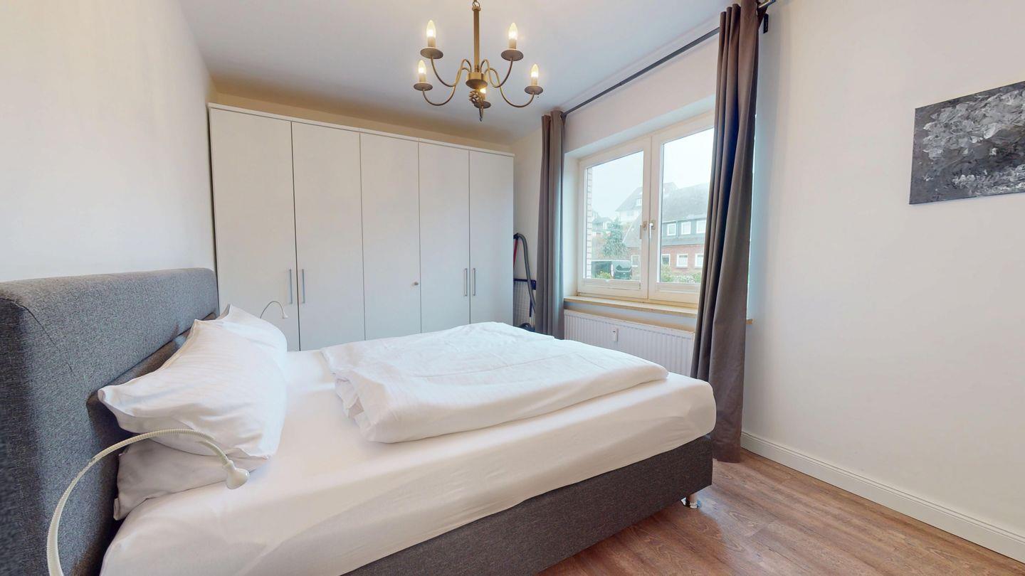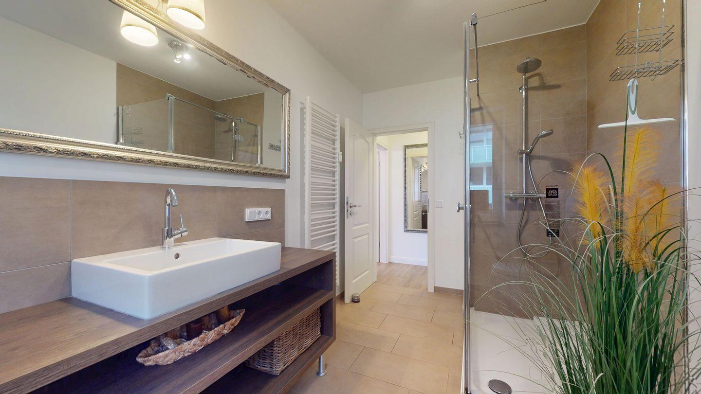 Im Schlafzimmer sorgt ein komfortables Boxspringbett für erholsamen Schlaf, das Bad mit Regendusche für einen erfrischenden Start in den Tag.