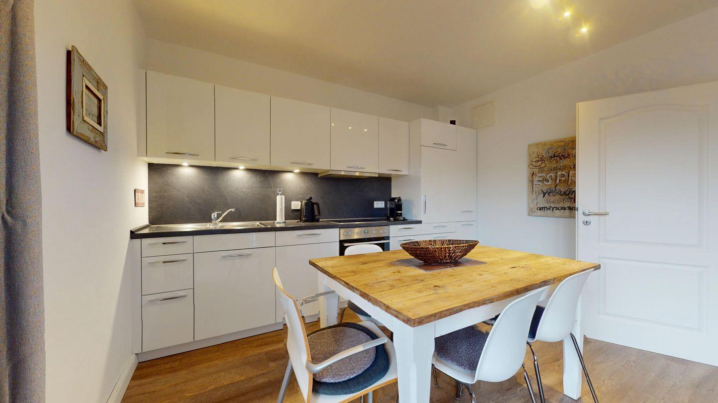 Die Hoernem Stuuv befindet sich im Hoernem Hüs, im Erdgeschoss und ist bequem über wenige Stufen erreichbar. Der offene Wohnbereich mit Küche und Essbereich lädt zum Entspannen, Kochen und gemeinsamen Genießen ein. Auf der großzügigen Süd/West-Terrasse können Sie die Sonne von morgens bis abends genießen – ob beim Frühstück, im Strandkorb oder bei einem Glas Wein am Abend.