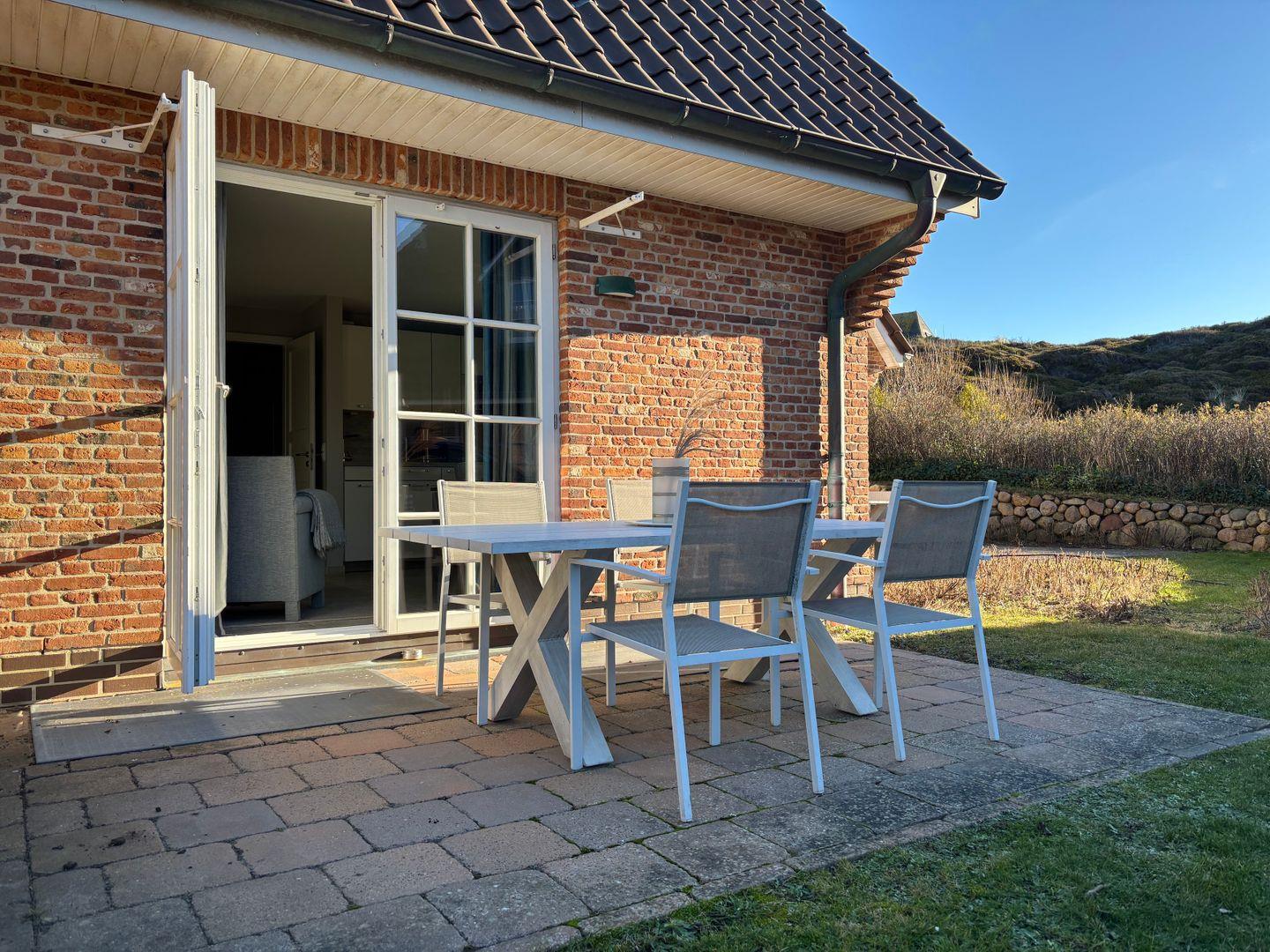 Vom Wohnbereich gelangen Sie direkt auf die Terrasse mit Gartenmöbeln und im Sommer eigenem Strandkorb (April – Oktober), perfekt, um in der Sonne zu entspannen oder den Tag bei einem Glas Wein ausklingen zu lassen.