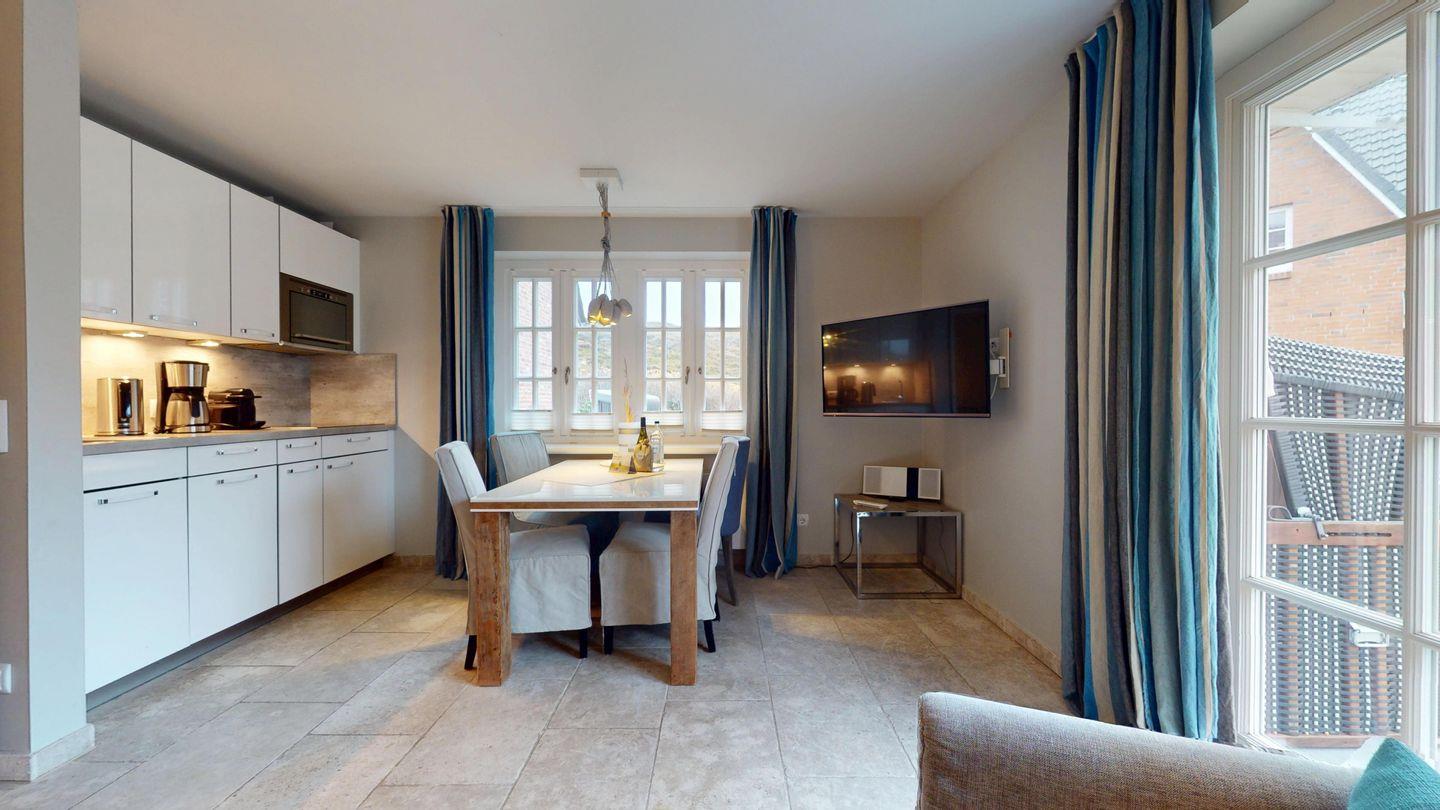 Im Erdgeschoss erwartet Sie ein einladender Wohnbereich mit Essplatz, der durch seine helle, freundliche Gestaltung sofort Urlaubsatmosphäre aufkommen lässt. Die integrierte Küchenzeile ist mit Mikrowelle, Geschirrspüler, Kaffeemaschine und Nespresso-Maschine ausgestattet. Ideal für unkomplizierte Mahlzeiten zwischendurch.