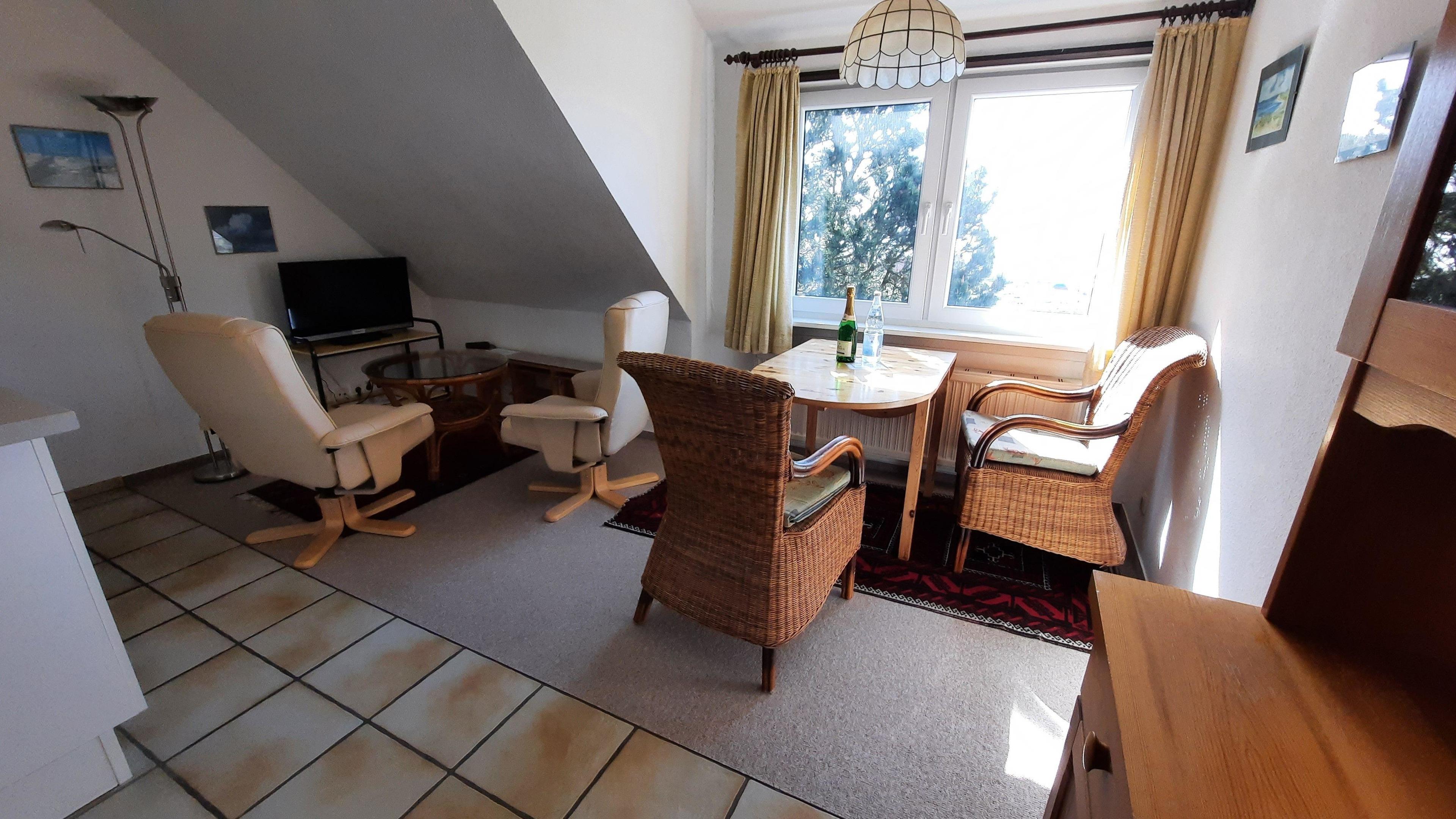Diese kleine Ferienwohnung für zwei Personen im Haus Meerblick hat zwei getrennte Zimmer, davon ein Schlafzimmer mit Boxspringbett, und ein Wohnzimmer mit Küchenzeile.