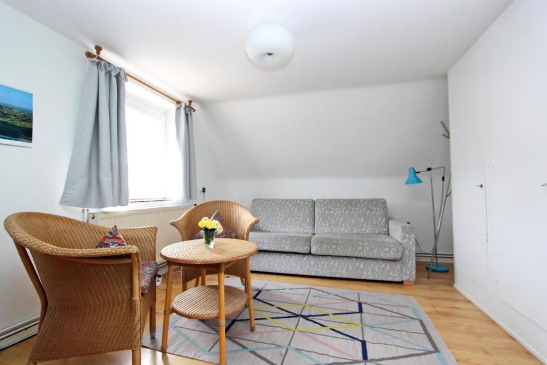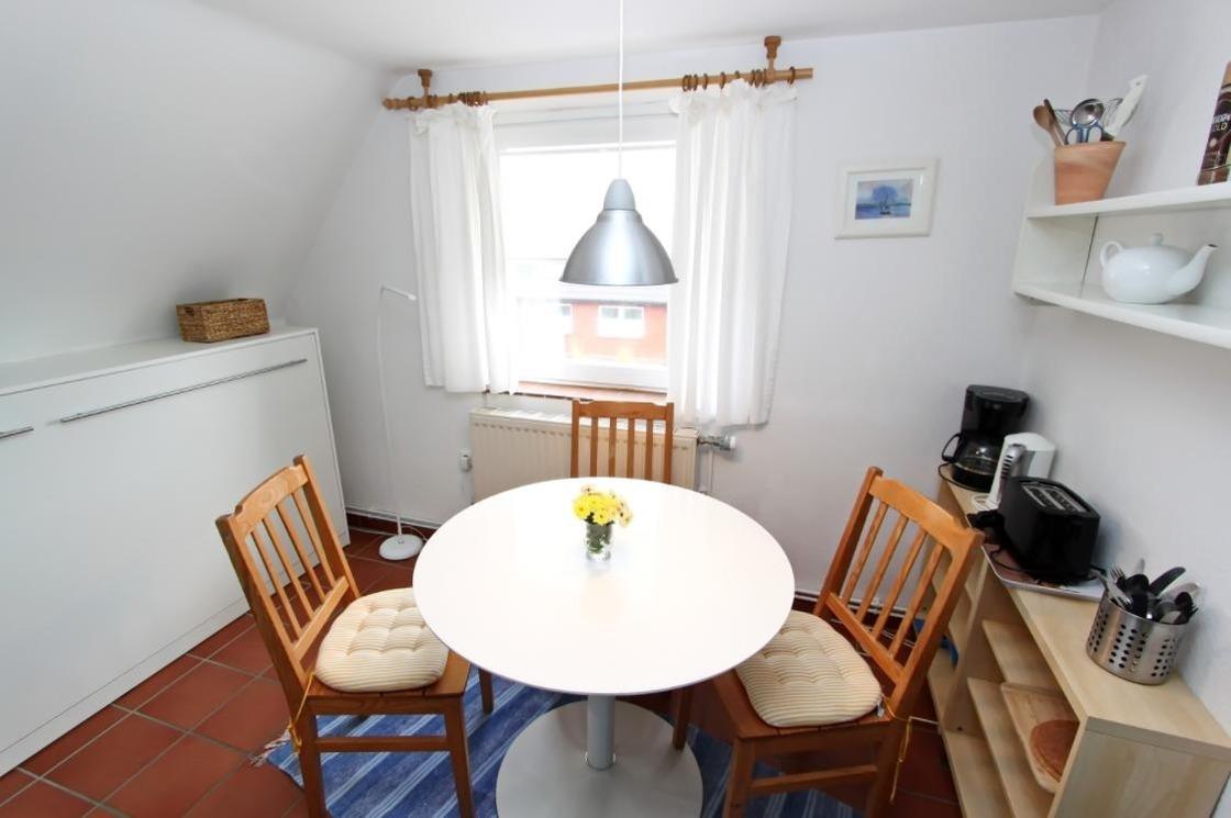 Die Wohnung ist ausgestattet mit einer Kochnische und einem kleinen Duschbad. Der Blick aus den Fenstern geht nach Osten auf die Dünenkette auf der Wattseite der Insel. Farb TB-Sat und Mikrowelle; eine Waschmaschine und ein Wäschetrockner steht den Gästen im Keller des Hauses gegen eine Gebühr zur Verfügung. Änderungen der Ausstattung bleibt vorbehalten.