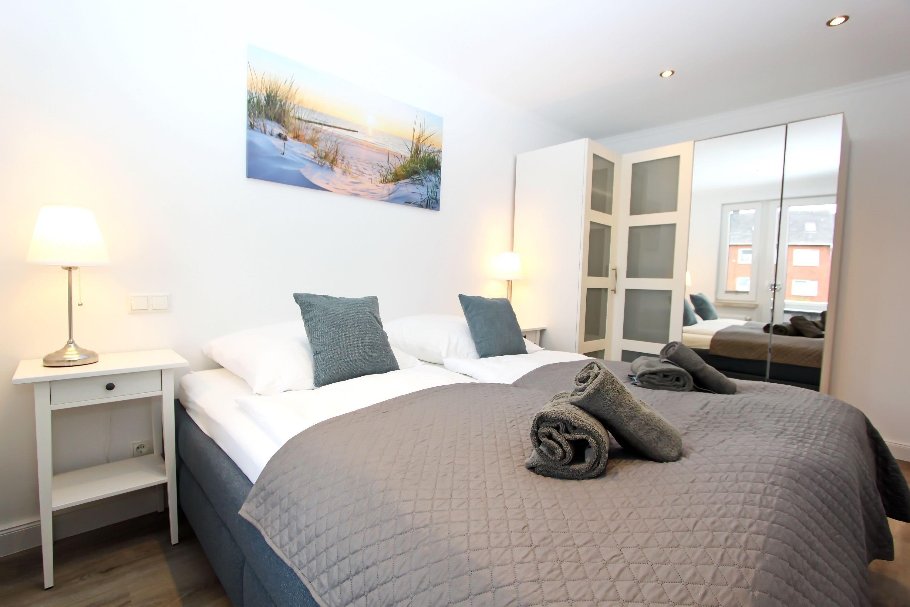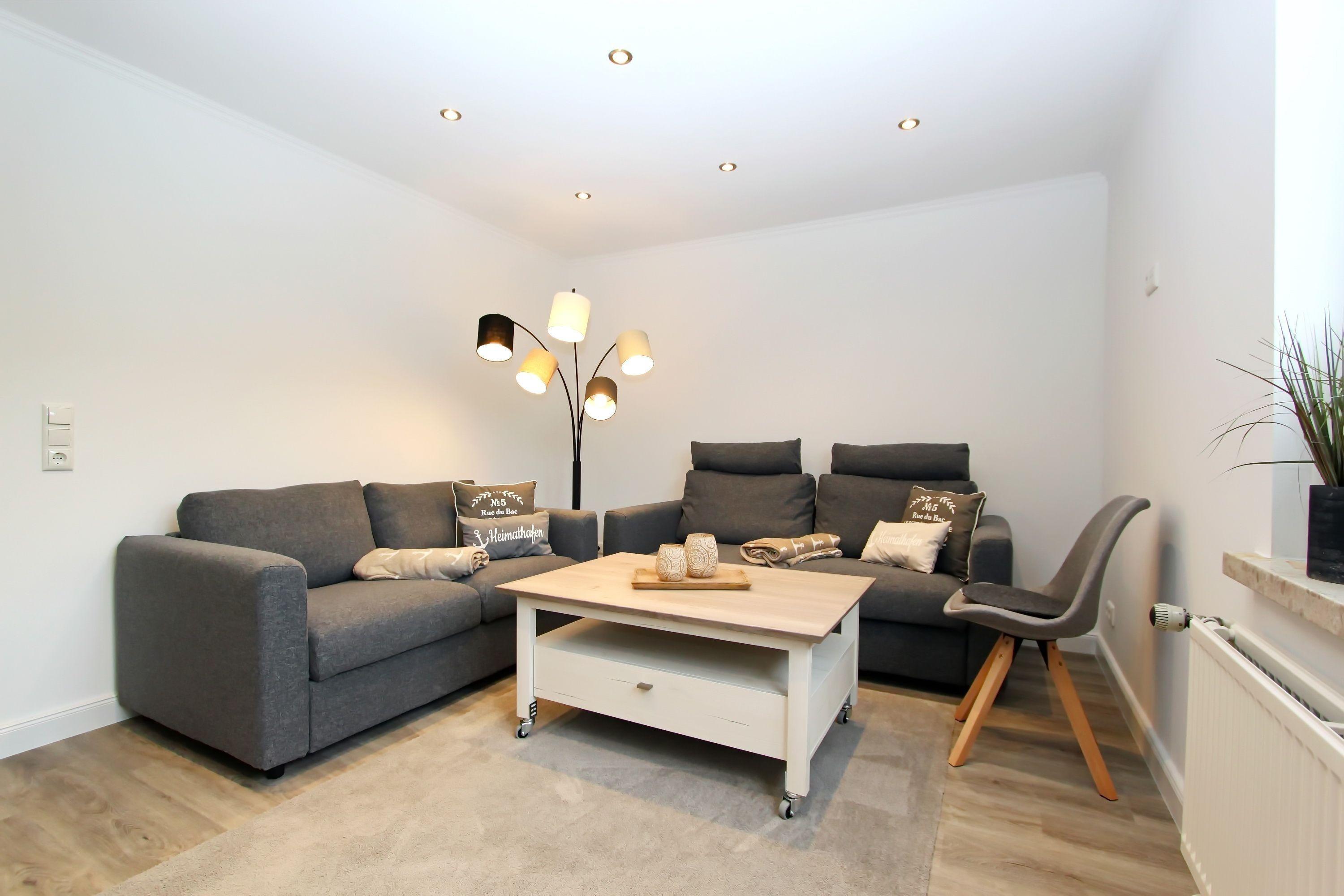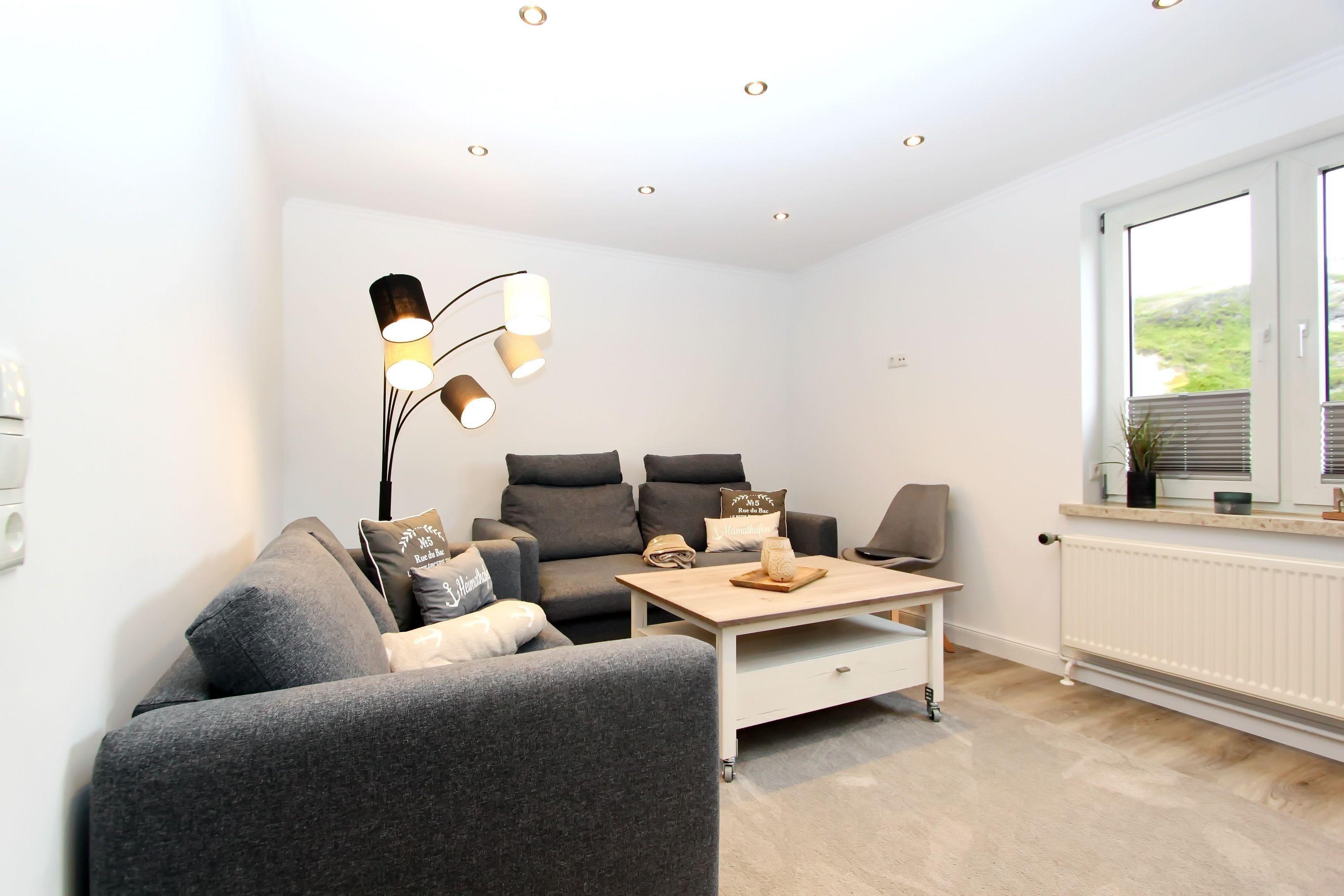 Wohnzimmer mit zwei Couchen (eine davon mit Schlaffunktion), Couchtisch, Vitrinen Schrank, Bücherregal, großer Smart-OLED-TV, Radio und kostenloses WLAN. Separates Schlafzimmer mit Doppelbett (1,80m x 2,00m), Nachtschränke, Nachttischlampen, großer Kleiderschrank, der ausreichend Stauraum bietet, Zugang zum Süd-/Westbalkon mit Balkonmöbel.