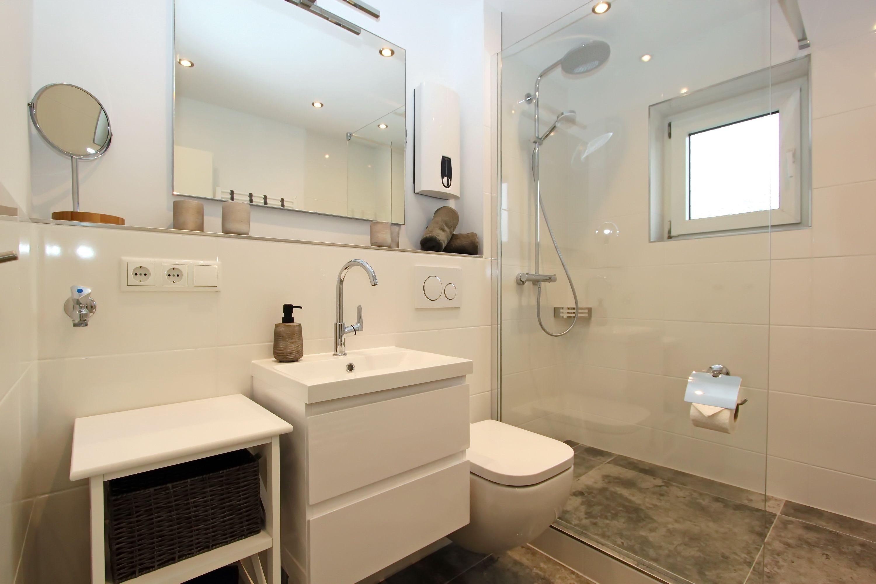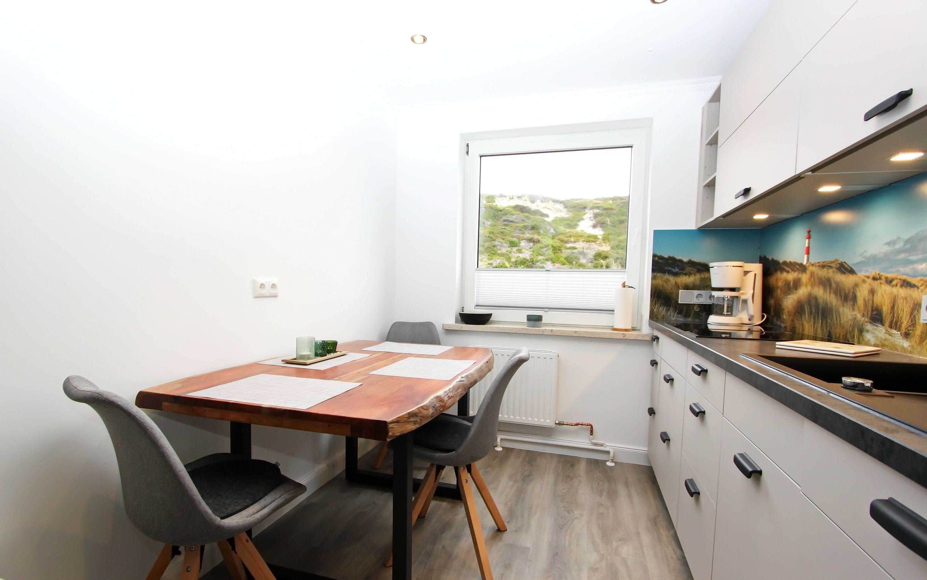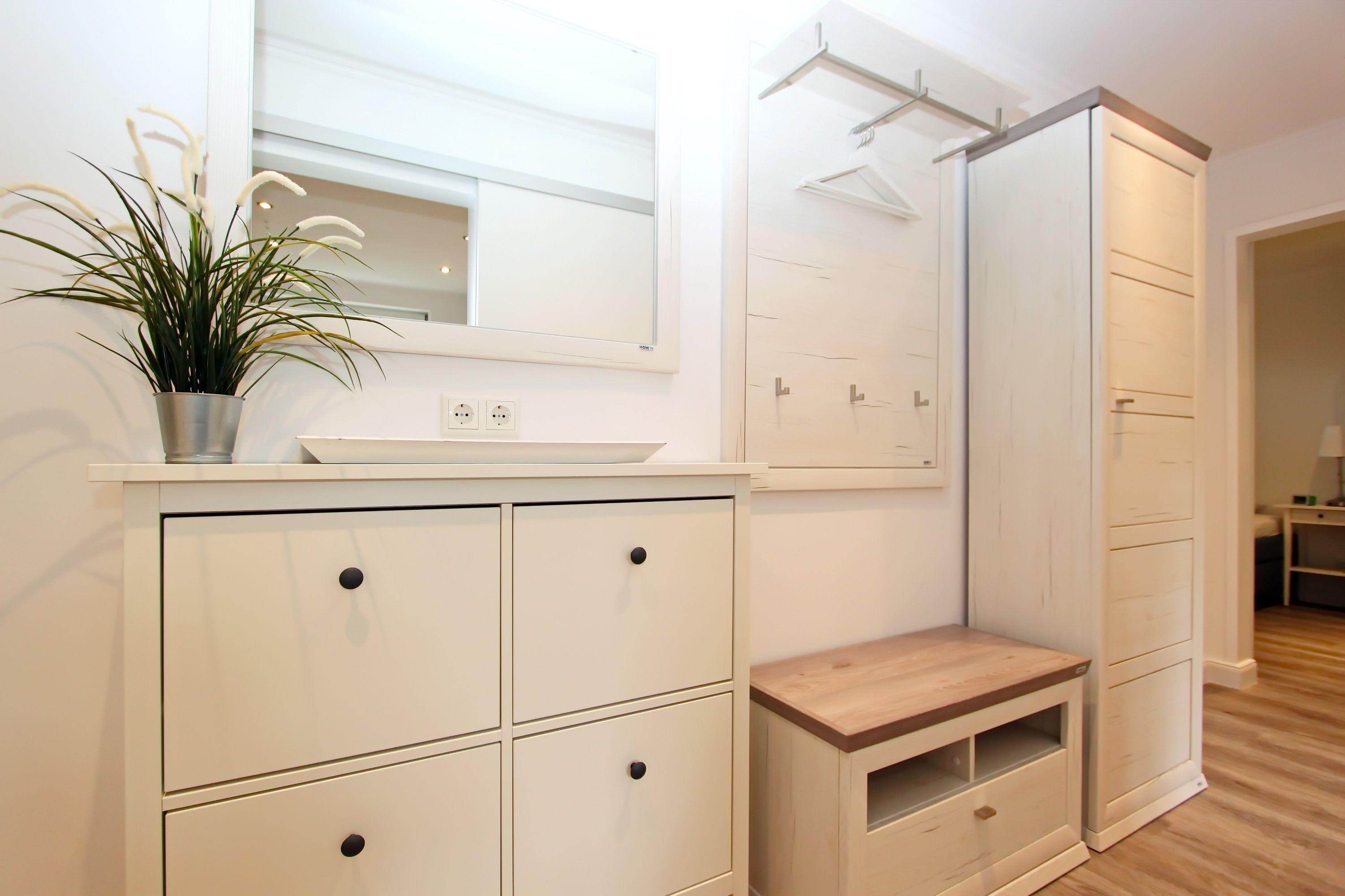 Flur mit Garderoben- u. Schuhschrank. Separate Einbauküche mit Induktionsherd, hoher Backofen, Mikrowelle, Geschirrspüler, Kühl- und Gefrierschrank sowie ein Esstisch mit 4 Stühlen. Duschbad/WC mit Regendusche und Handtuchheizung.