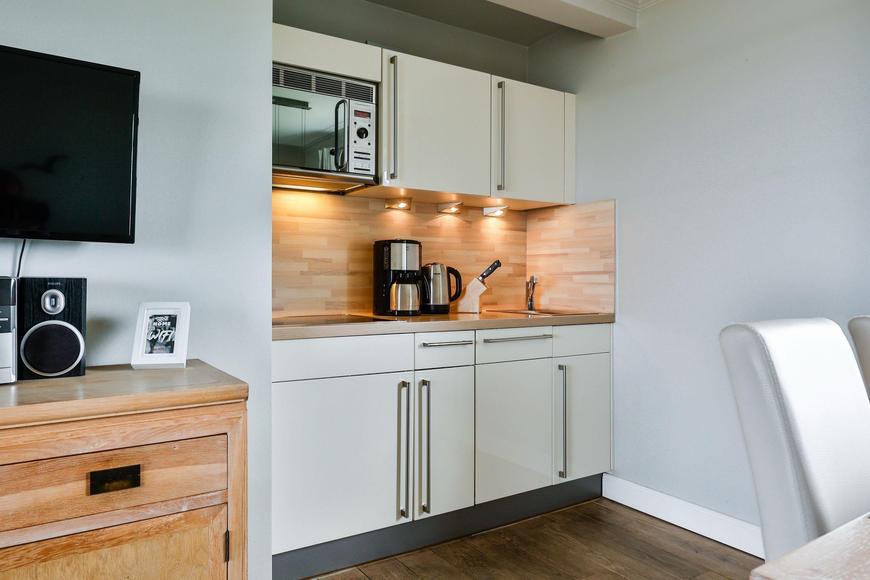 Küche: , Filterkaffeemaschine, Toaster, Wasserkocher, Mikrowelle mit Ofenfunktion, Cerankochfeld, Kühlschrank mit Gefrierfach, Geschirrspüler