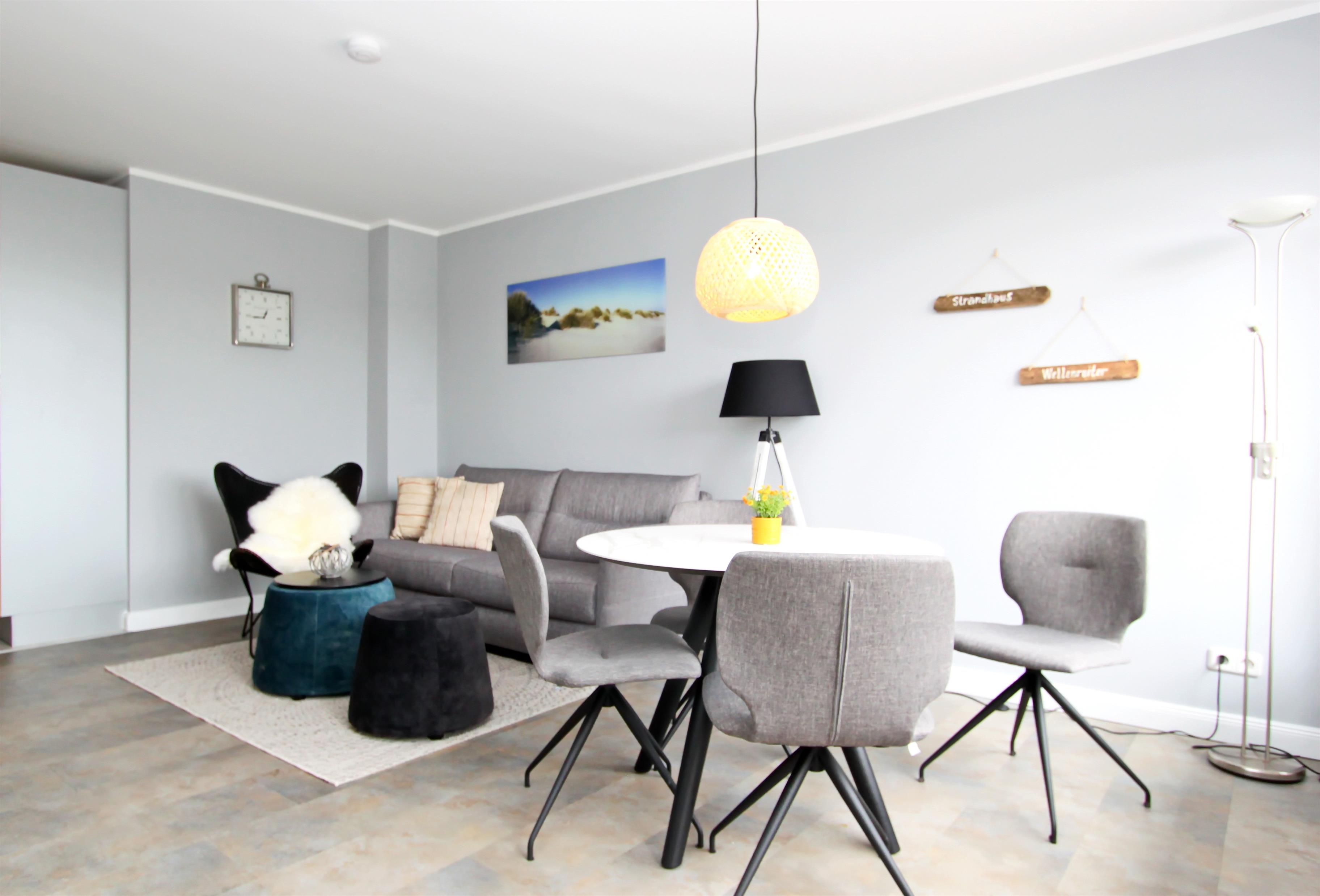 modernes 2 Zi.-App. mit ca. 55 m², im 2. OG für bis zu 4 Personen. Ein großes Wohn-/Schlafzimmer mit einer hochwertigen Doppelschlafcouch (1,60m x 2,00m), Tisch mit vier Stühlen, Netflix fähiger Fernseher und Zugang zum Ostbalkon mit Balkonmöbel. Abgetrennter Küchenbereich mit Cerankochfeld, Geschirrspüler, Mikrowelle, Kaffeemaschine und Kühlschrank. Dort finden Sie alles, um sich selbst versorgen zu können. Separater Schlafraum mit einem Boxspringbett (1,60m x 2,00m), Kommode und TV. Zugang zum zweiten Ostbalkon mit Strandkorb.