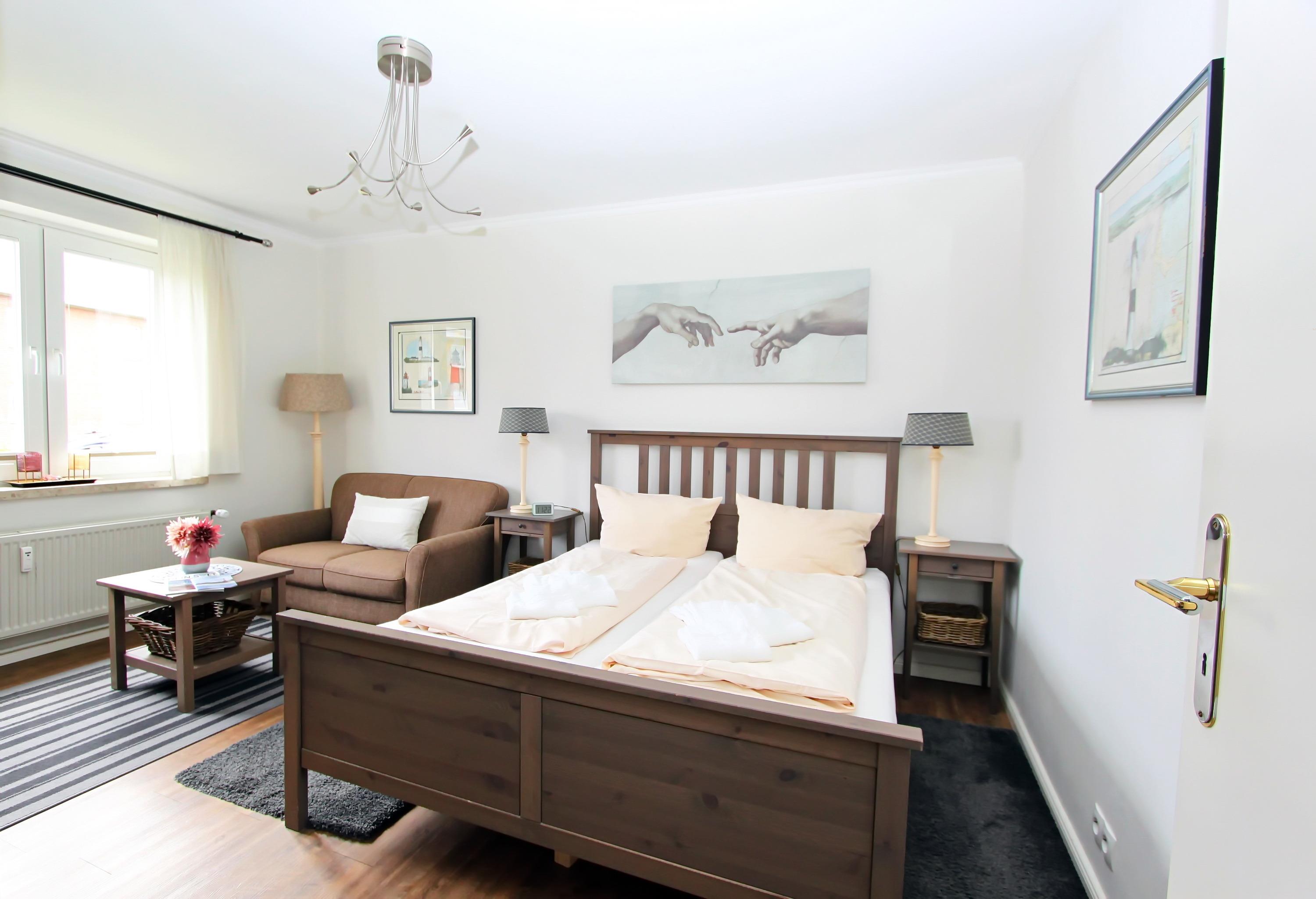 renoviertes 1 Zimmer Appartement mit ca. 32 m² im Hochparterre unweit des Hörnumer Golfplatzes; Wohn-/Schlafraum mit Doppelbett, eine gemütliche 2-Sitzer-Couch, Tisch, Vitrinenschrank, Kleiderschrank, Sat-Flat-TV; separate Küche mit Cerankochfeld, Geschirrspüler, Kühlschrank mit kleinem Gefrierfach, Mikrowelle mit Grill und Backofen, Esstisch und Stühle für 2 Personen, Einbauschrank; Wannenbad/WC; Flur mit Garderobe und Schuhschrank. Das ganze Appartement ist mit Venyl-PVC ausgestattet.