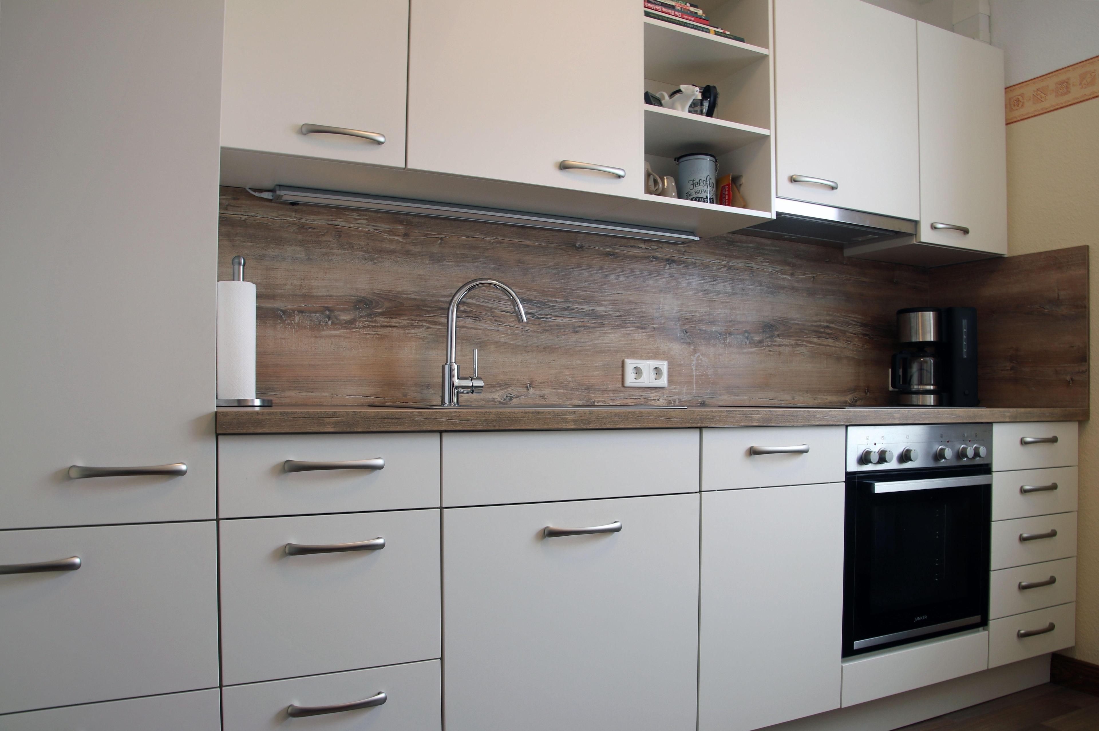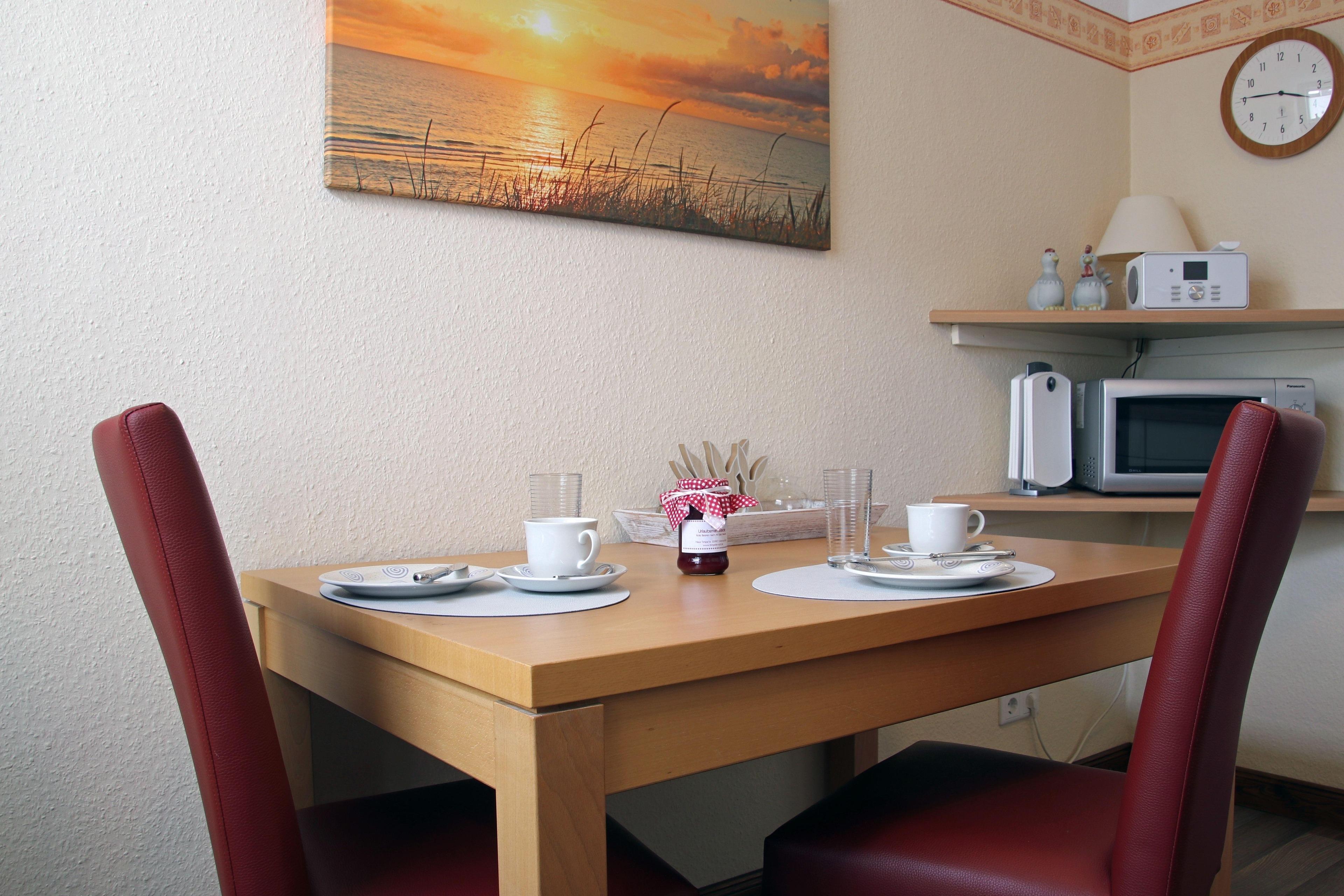 Die separate geräumige Küche ist ausgestattet mit Cerankochfeld und Backofen, Dunstabzugshaube, Spülmaschine, Kühlschrank mit Gefrierfach, Mikrowelle mit Grill. Diverse Küchenkleingeräte vervollständigen die Ausstattung. Der Küchentisch mit bequemen Stühlen lädt zum Verweilen ein.
