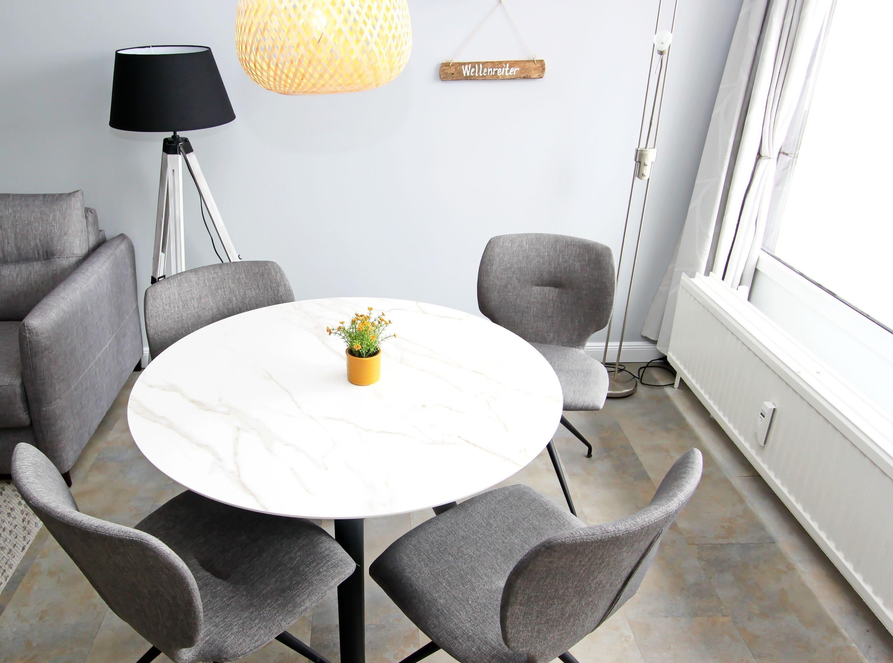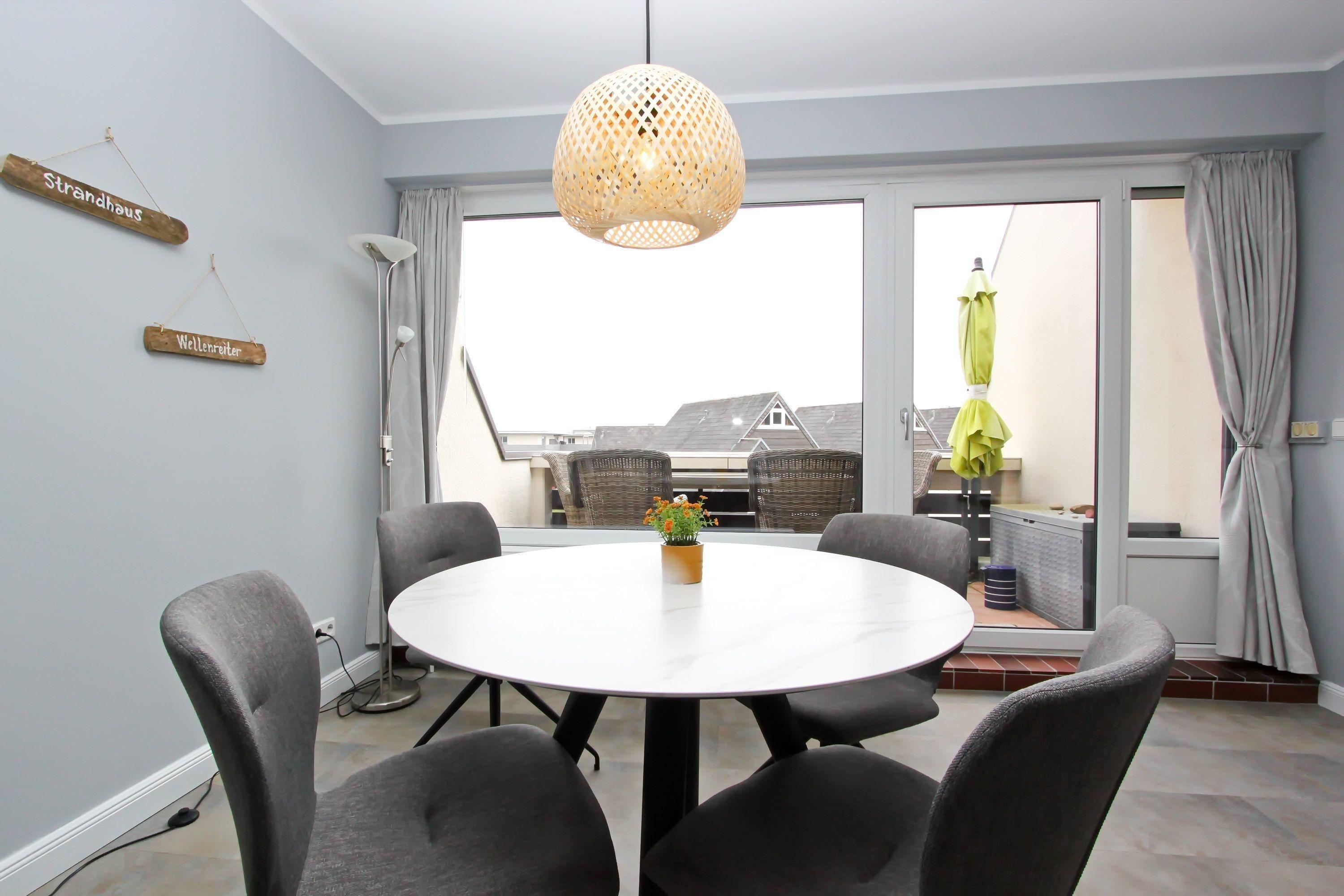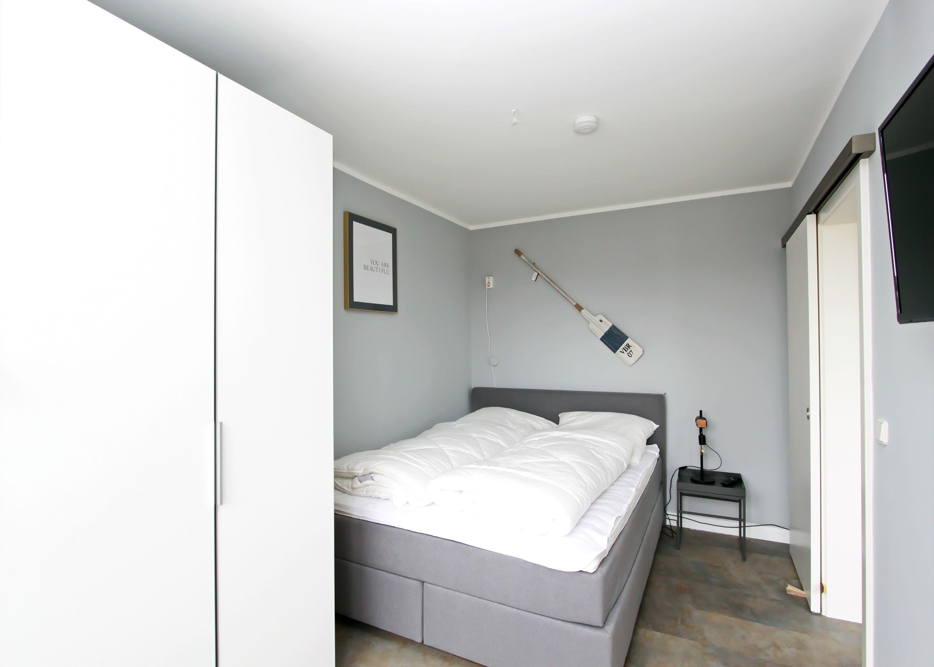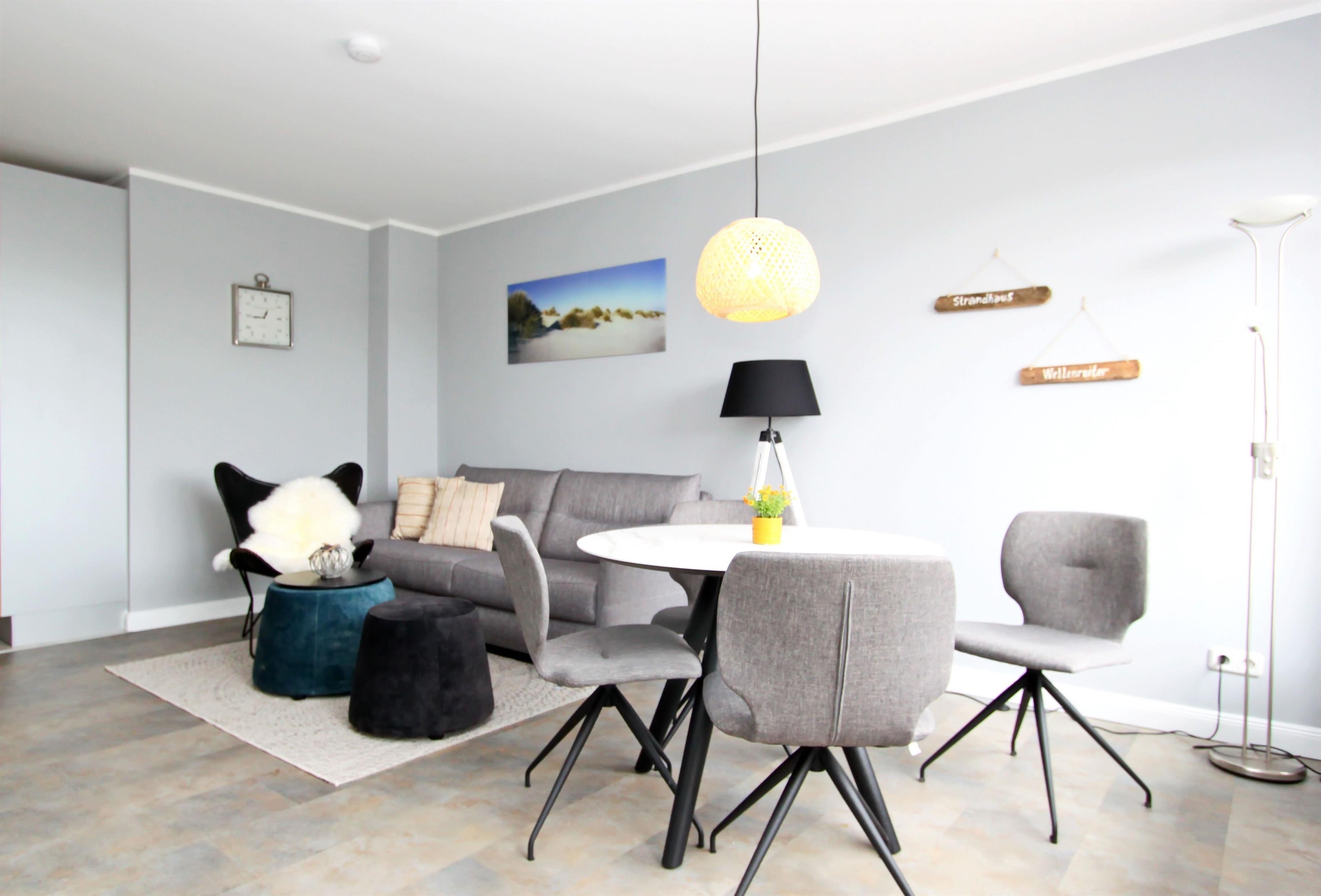modernes 2 Zi.-App. mit ca. 55 m², im 2. OG für bis zu 4 Personen. Ein großes Wohn-/Schlafzimmer mit einer hochwertigen Doppelschlafcouch (1,60m x 2,00m), Tisch mit vier Stühlen, Netflix fähiger Fernseher und Zugang zum Ostbalkon mit Balkonmöbel. Abgetrennter Küchenbereich mit Cerankochfeld, Geschirrspüler, Mikrowelle, Kaffeemaschine und Kühlschrank. Dort finden Sie alles, um sich selbst versorgen zu können. Separater Schlafraum mit einem Boxspringbett (1,60m x 2,00m), Kommode und TV. Zugang zum zweiten Ostbalkon mit Strandkorb.