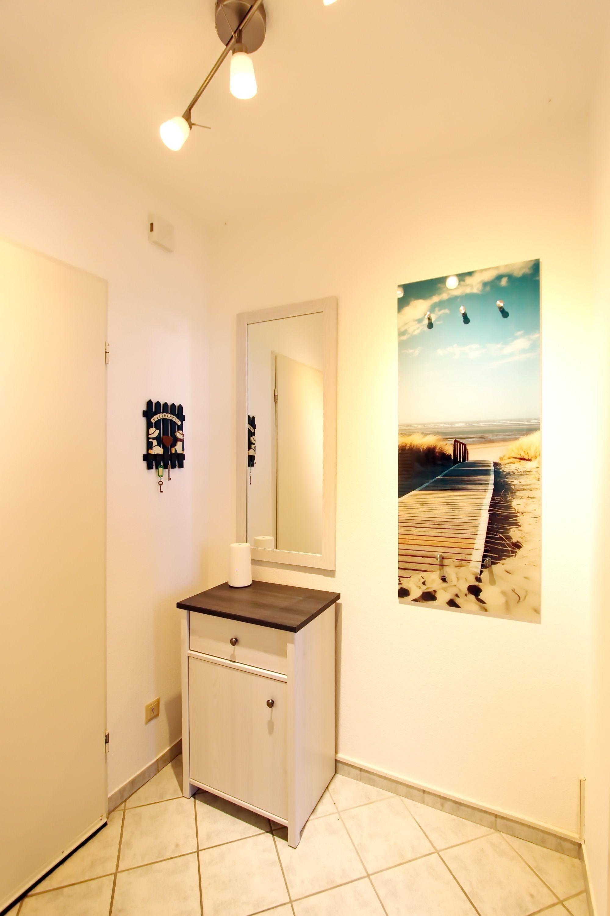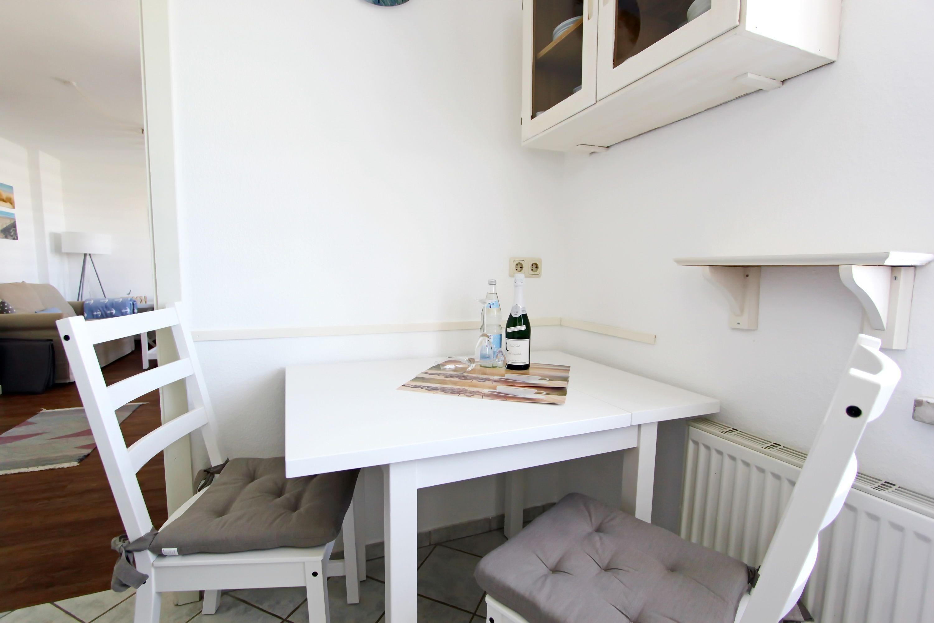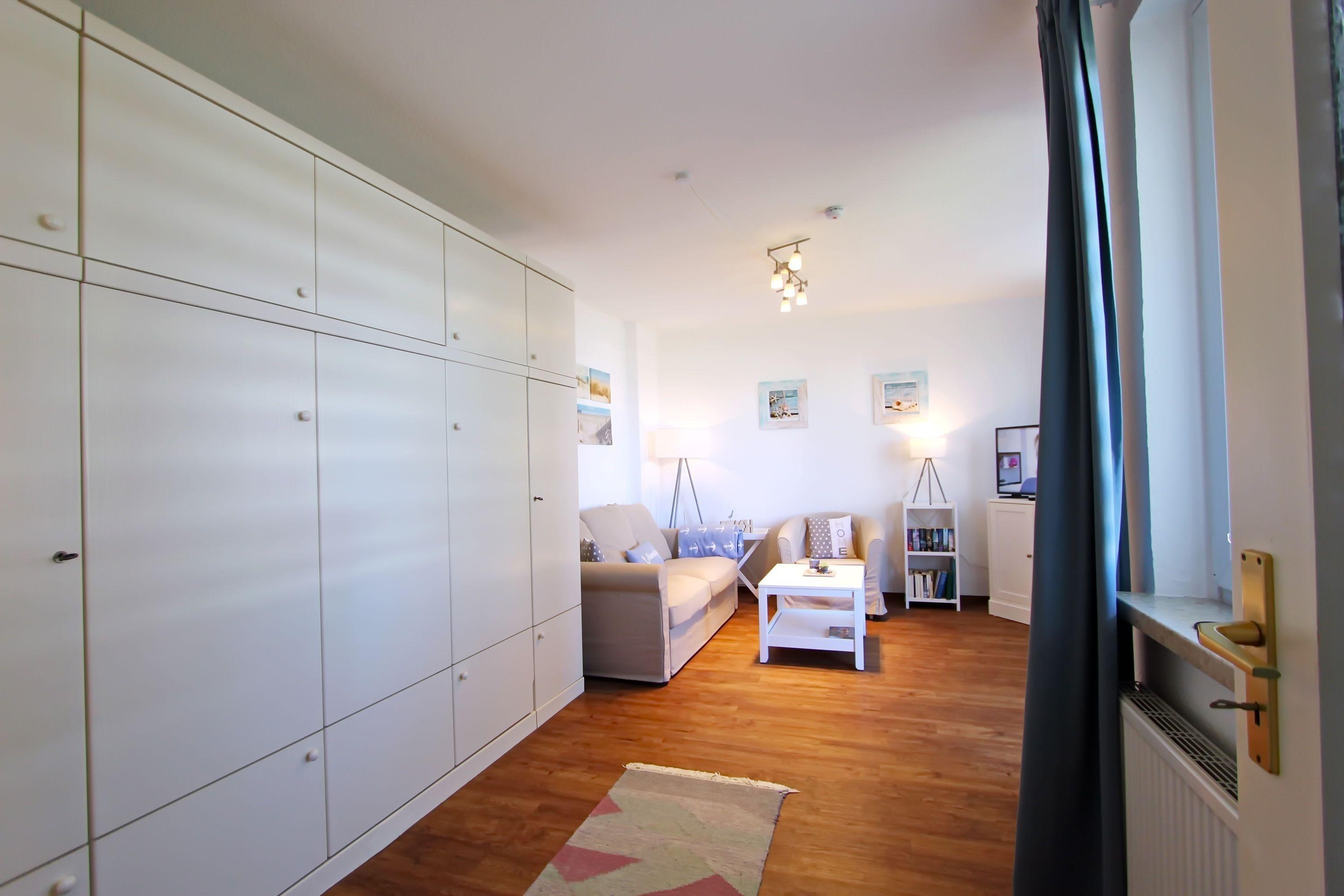 modernes 1 Zimmer Appartement mit ca. 32m² unweit des Hörnumer Golfplatzes; ein Wohn-/Schlafraum mit Doppelschrankbett, Zweisitzer-Couch, 2 Sessel, Tisch, Kommode, Schrank, Sat-TV, Radio mit CD-Player, Zugang zum Westbalkon mit Bestuhlung; kleine separate Pantryküche mit neuem Cerankochfeld (2 Platten), neuer Dunstabzugshaube, Mikrowelle und neuem Kühlschrank mit Gefrierfach; Esstisch für 2 Personen; Flur mit Garderobe und Abstellkammer; neues Duschbad/WC.