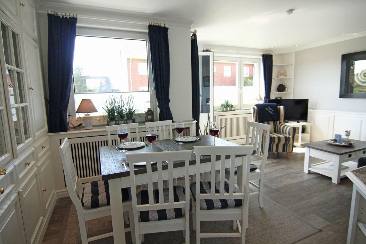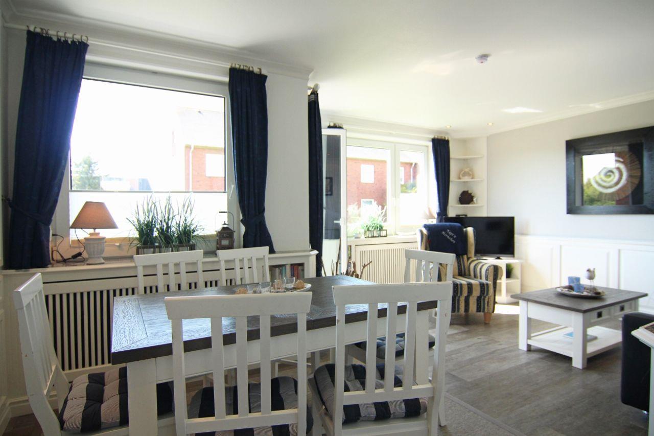 Moin und Ahoi, hier begrüßt Sie unser „Käpt’n Hörnchen“ an Bord im Inselsüden, in Hörnum. Dieses großzügige 70-Quadratmeter-Ferienappartement mit zwei Schlafzimmern, separater Küche und einem geschützten Balkon ist etwas für Kenner, für bis zu vier Personen und für den zweiten Blick: Denn das eher schlichte Rotklinker-Appartementhaus mit zwei Etagen unterm Dachgeschoss verrät nämlich nicht wirklich, wie durchdacht, gemütlich und echt nett diese gründlich renovierte Wohnung ausgestattet ist.