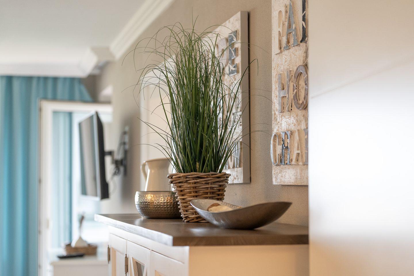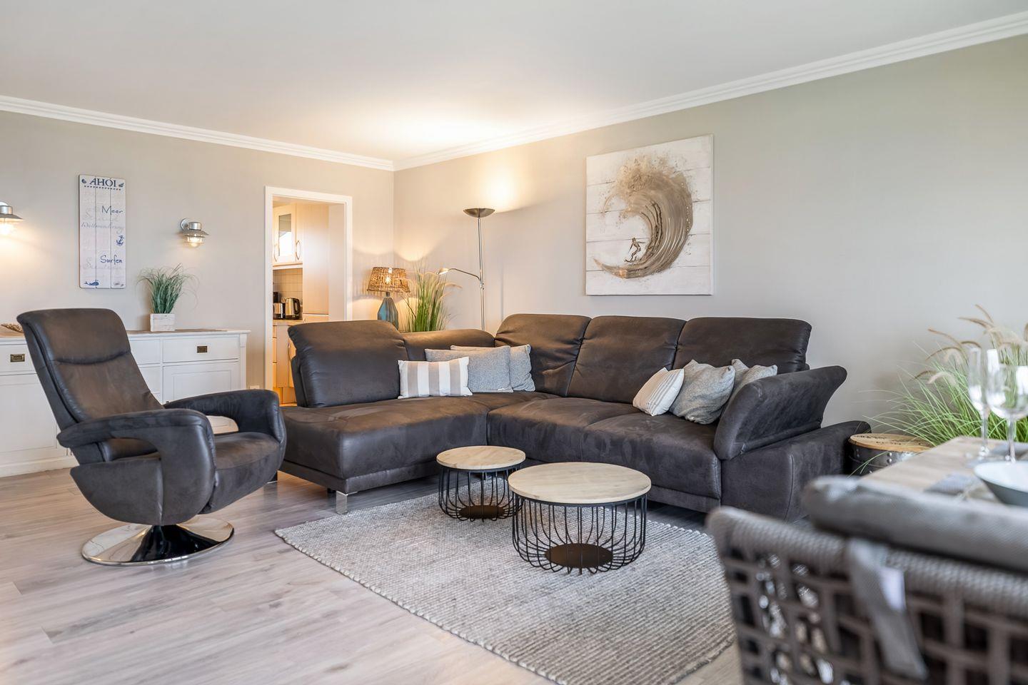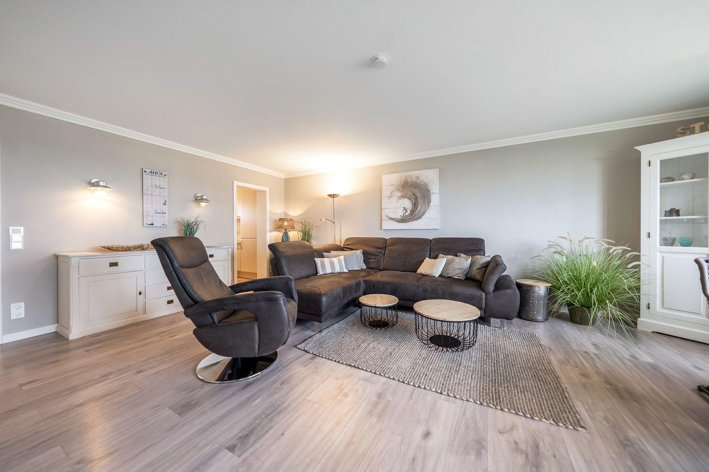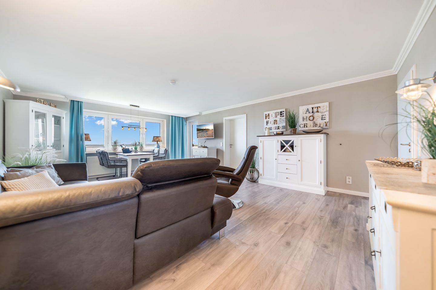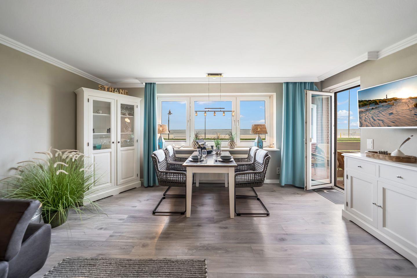 Die moderne Ferienwohnung „Strand und Meer“ ist etwas für Inselliebhaber, die einen fantastischen Ausblick auf das Meer suchen. Der hell gestaltete Wohnbereich verfügt über eine gemütliche Sitzgelegenheit, TV sowie einem Essbereich von wo aus Sie freie Sicht auf die Hörnumer Promenade haben. Vom Wohnbereich gelangen Sie direkt zum angrenzenden Balkon. Das Hauptschlafzimmer der 70qm großen Wohnung verfügt über ein gemütliches Doppelbett sowie einem Kleiderschrank.